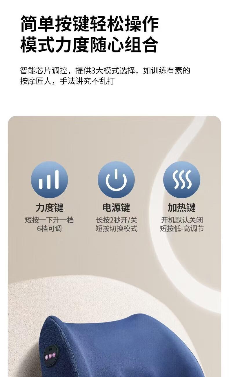 6. 便捷操作,四季适配更贴心:一键即可开启热敷功能,冬天暖腰驱寒,夏天使用不粘腻闷汗;模式与力度调节简单易懂,无需复杂操作,老人也能轻松上手,悉心呵护每日舒适。