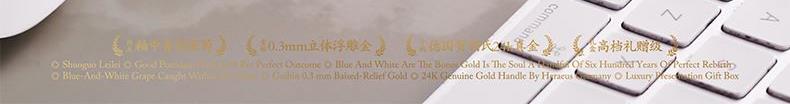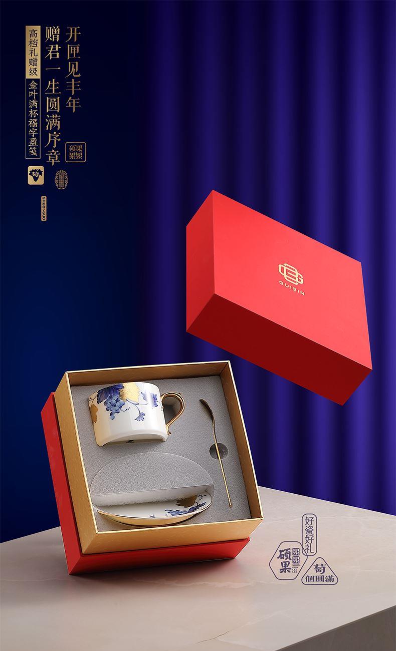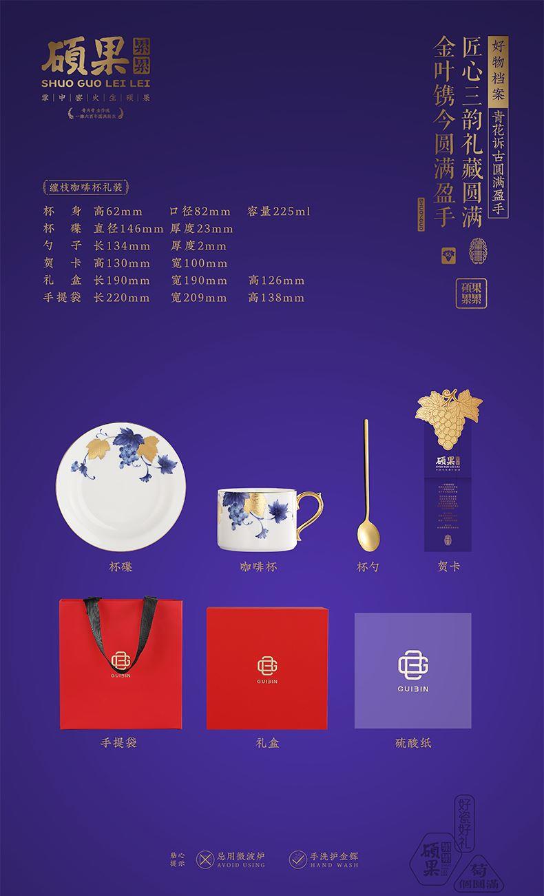 1.杯身:高62mm、口径82mm、容量225ml 2.杯碟:直径146mm、厚度23mm 3.勺子:长134mm、厚度2mm 4.贺卡:高130mm、宽100mm 5.礼盒:长190mm、宽190mm、高126mm 6.手提袋:长220mm、宽209mm、高138mm