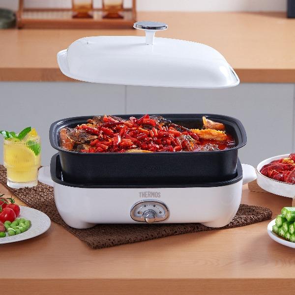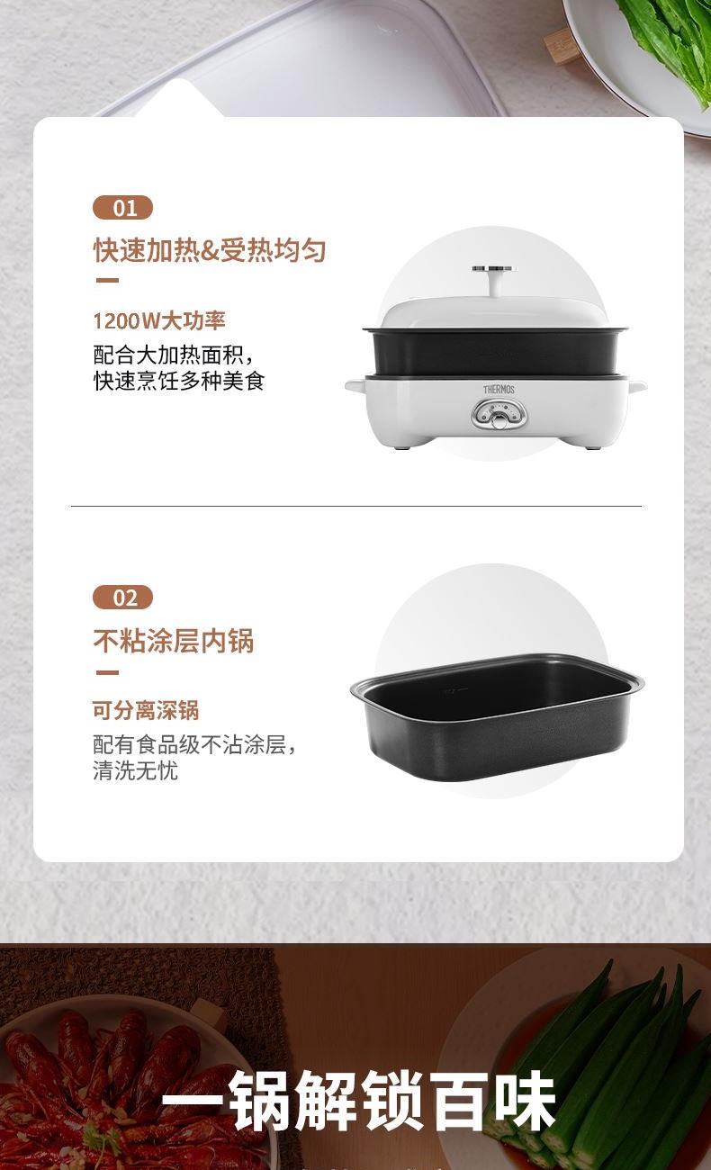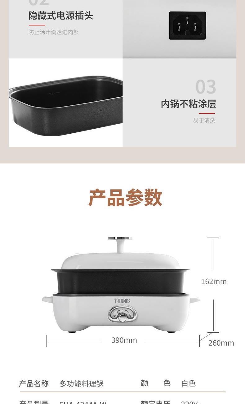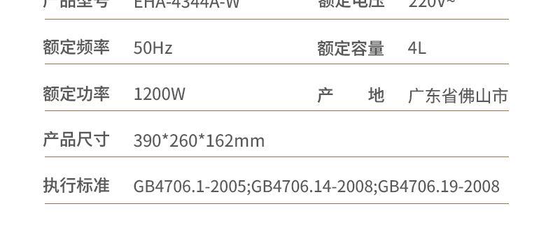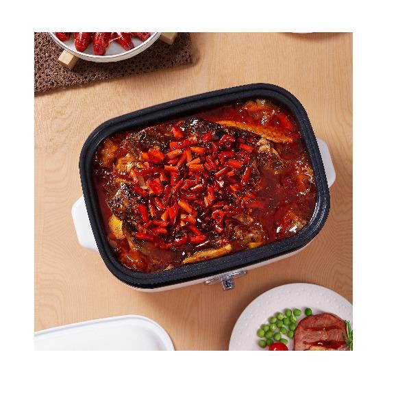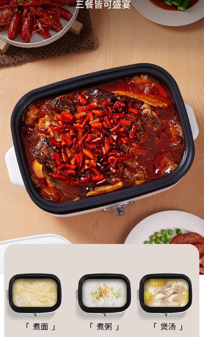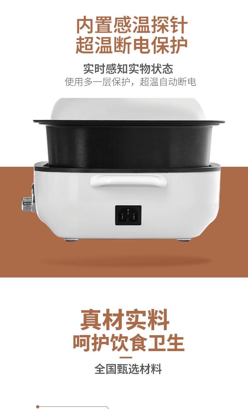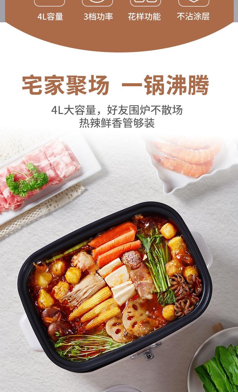 额定电源 :220V~50Hz 额定功率 :1200W 深锅容量 :4L 净 重 :2.5kg 毛 重 : 3.6kg 产品尺寸 :384*269*165mm 包装尺寸:452*297*285mm 1、高雅外观设计,适用大方操作简单方便 2、 煎、煮、焖、炖、刷,一锅多用; 3、 4L大容量不沾内胆,方便适用; 4、 分体组合设计,清洗方便; 5、 精 准控温,防干烧保护; 6、 大功率高效加热,功率可调