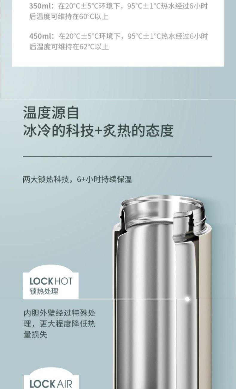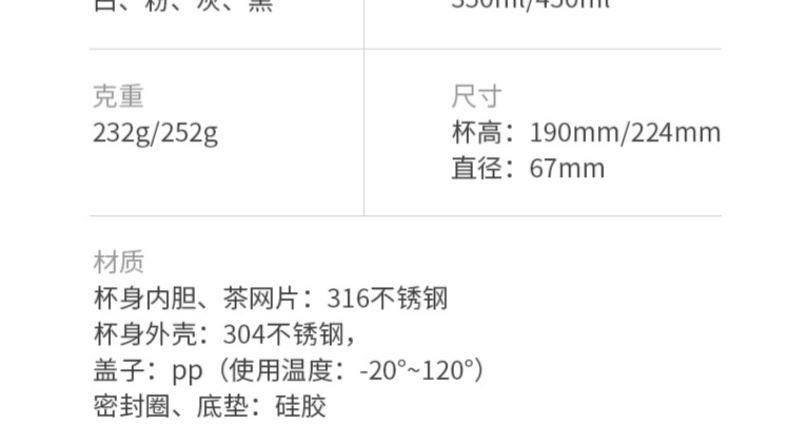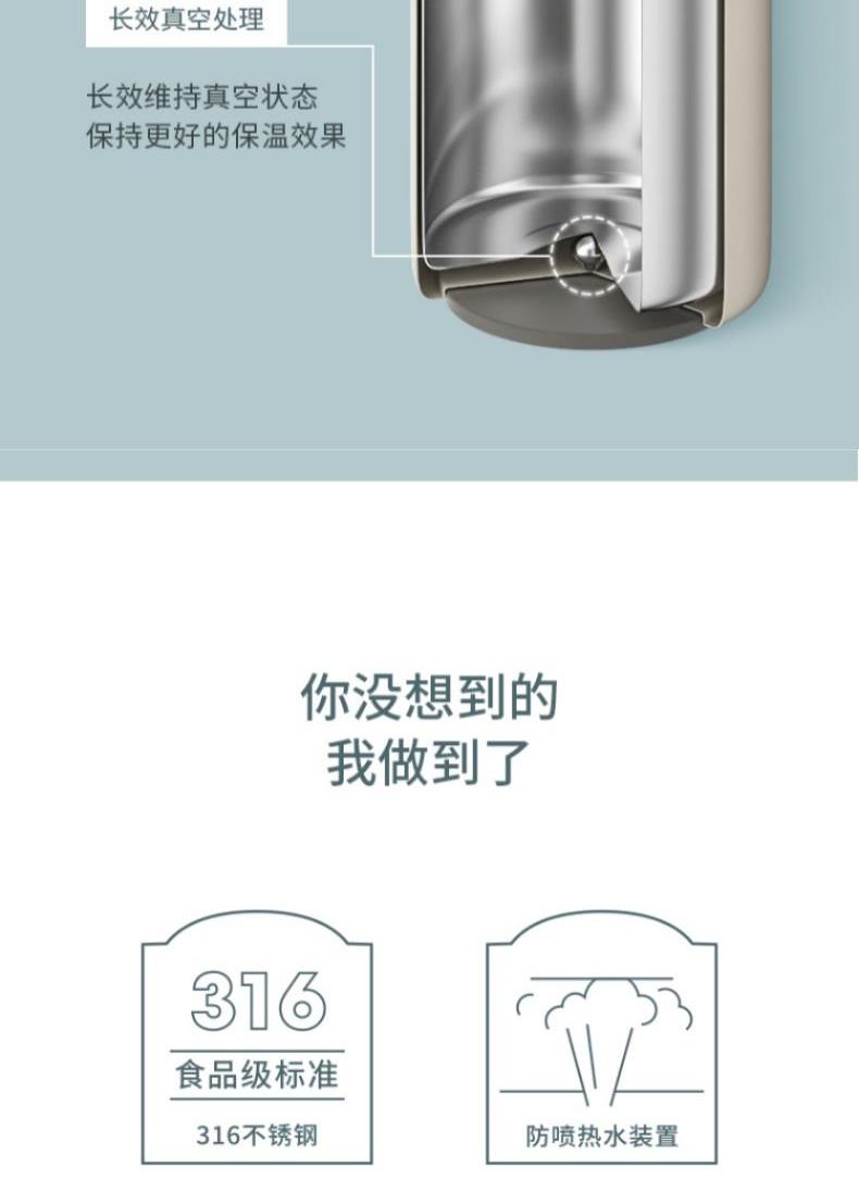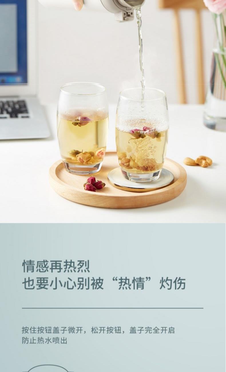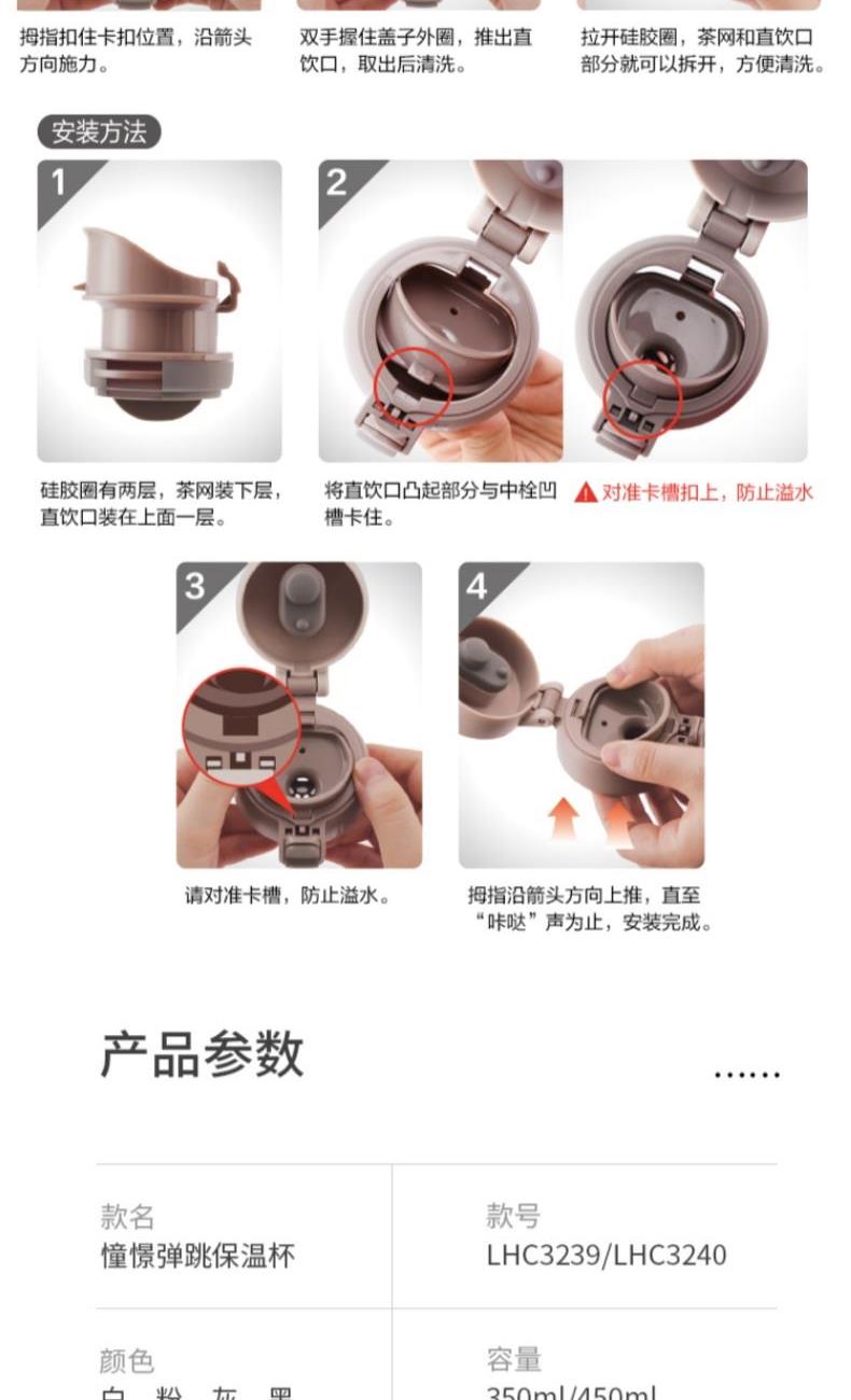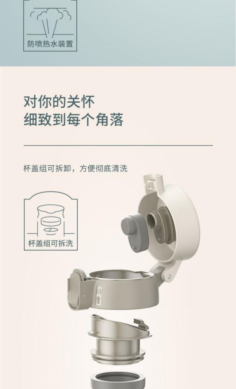 产品特点: 杯盖组可拆卸,方便清洗。 杯盖有安全锁,防止不小心按压开关而导致水流出 一键式开启,设有防喷热水装置,安全贴心 容量:350毫升