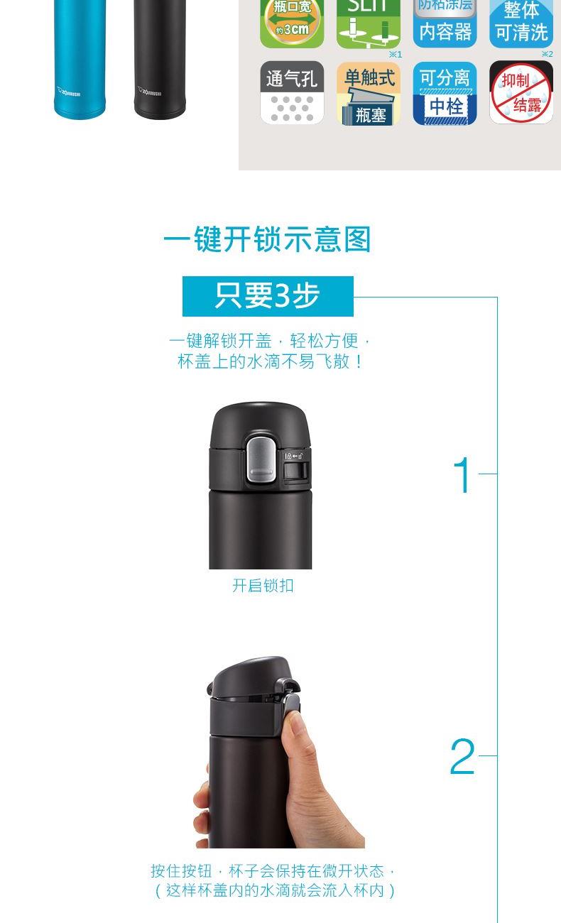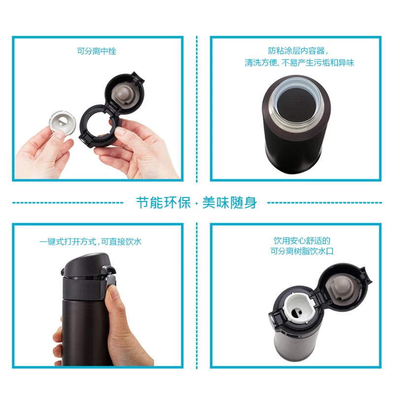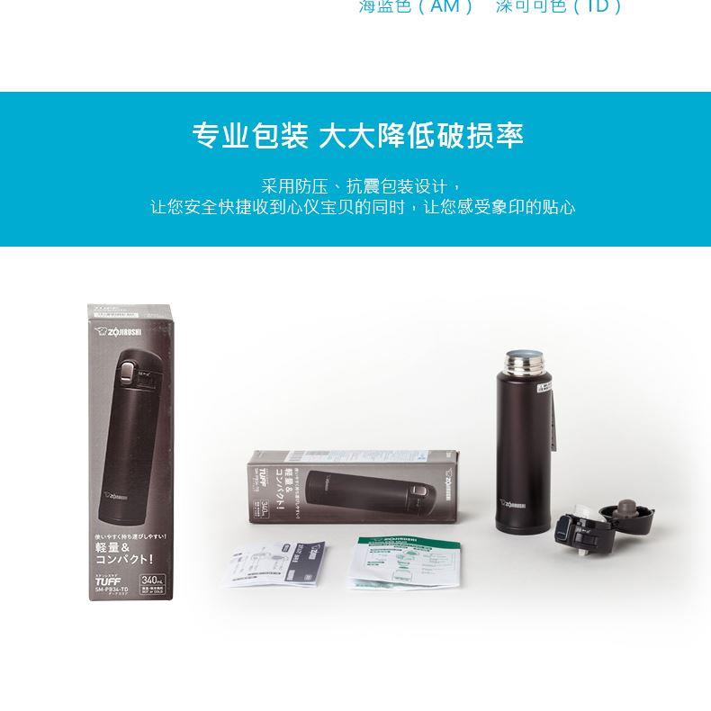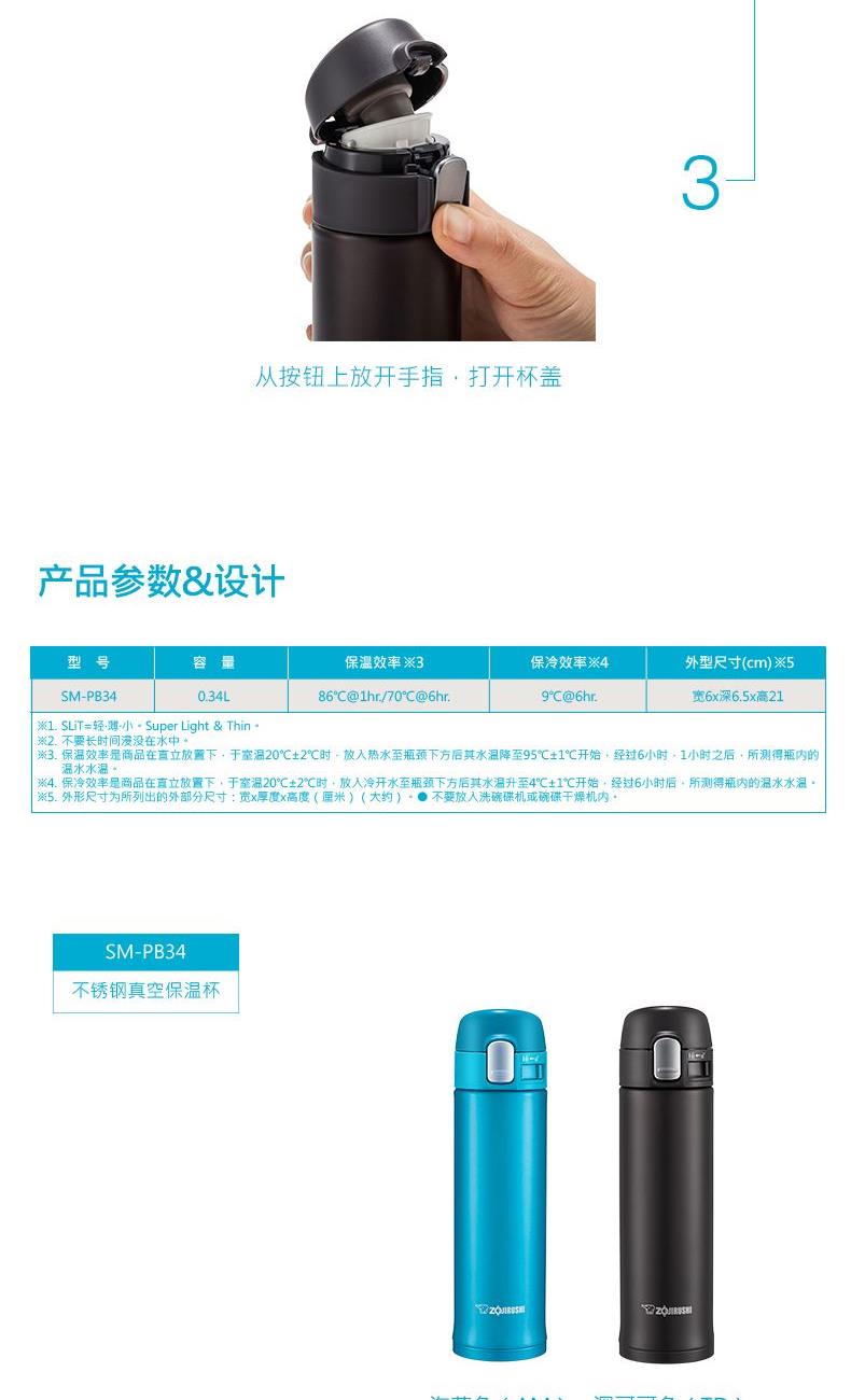 型号:SM-PB34 颜色:海蓝色AM,深可可色TD 容量:340ml 涂层:含防粘涂层 开盖方式:一键弹盖式 保温效率:86℃/1h、70℃/6h 保冷效率:9℃/6h 外形尺寸(宽深高):6x6.5x21cm 产地:泰国 上盖中栓可分离,整体可清洗 含防粘涂层,方便清洗,不易产生污垢和异味 一键式打开,可直接饮水