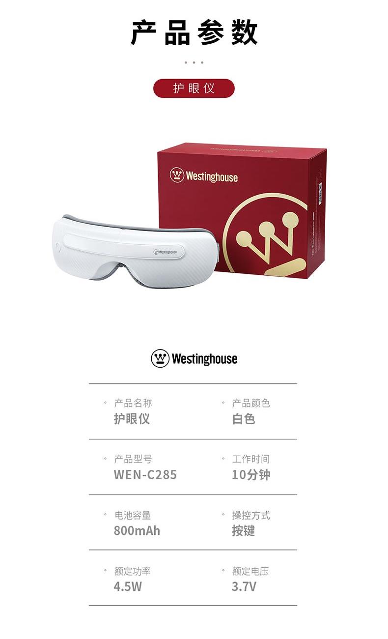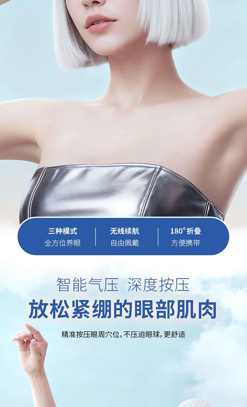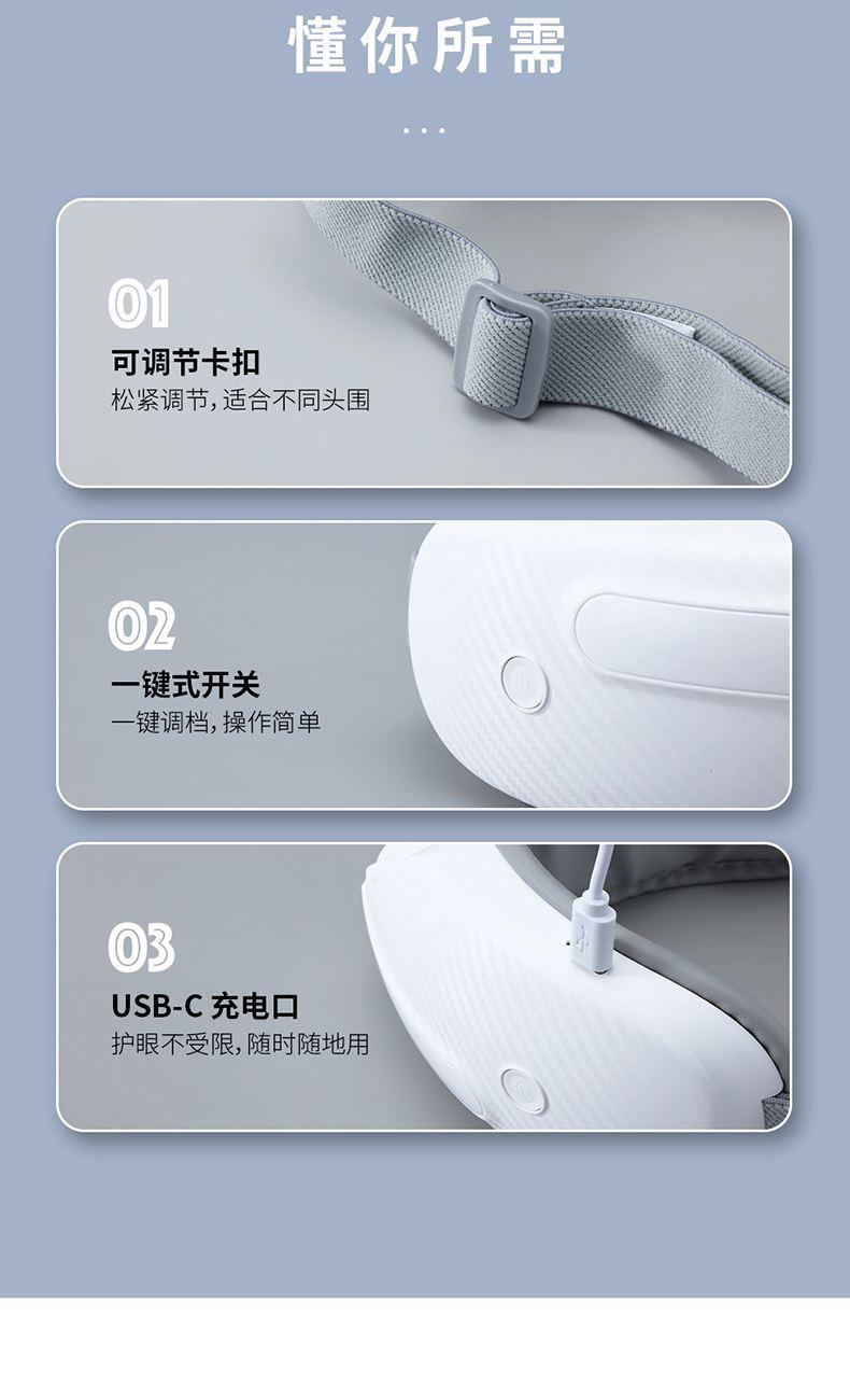 产品规格: 1、额定电压:3.7V 2、额定功率:4.5W 3、电池容量:800mAh 4、外壳材质:ABS 5、眼罩材质:PU皮 6、工作时长:10min 7、产品颜色:白色 产品特点: 1、可180°折叠,方便携带; 2、激光精雕碳纤维纹理工艺,凸显与众不同; 3、智能气压,疏通眼部神经系统,缓解疲劳; 4、42±3℃恒温热敷,活化眼部血液循环,缓解干涩; 5、内置舒缓减压音乐,按摩同时放松身心; 6、三档工作模式,多场合可用。