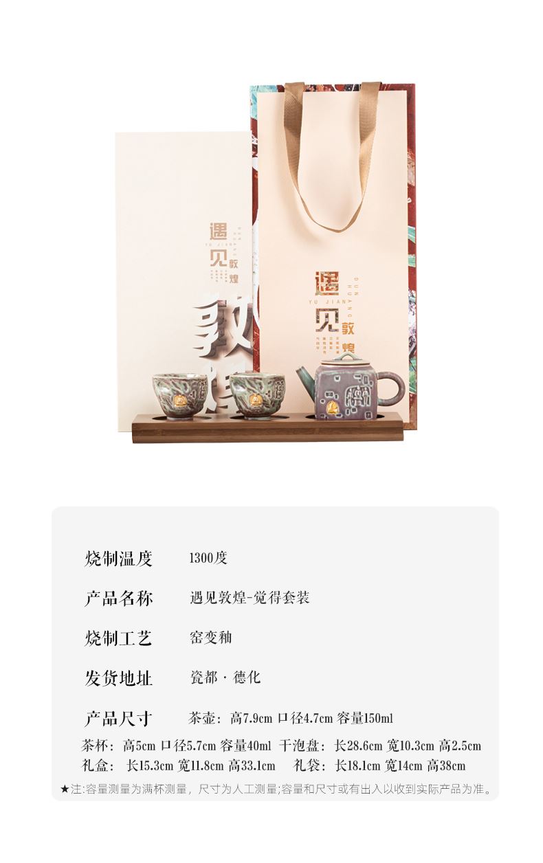 配置:茶壶*1,茶杯*2,竹制干泡盘*1. 尺寸:茶壶 高7.9cm口径4.7cm 容量150ml, 茶杯 高5cm口径5.7cm 容量40ml, 干泡盘 长28.6cm宽10.3cm高2.5cm, 礼盒 长15.3cm宽11.8cm高33.1cm, 礼袋 长8.lcm宽14cm高38cm。