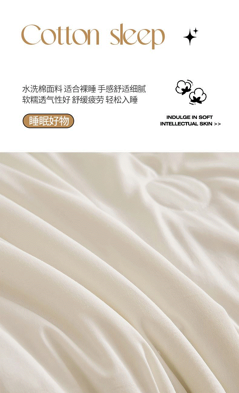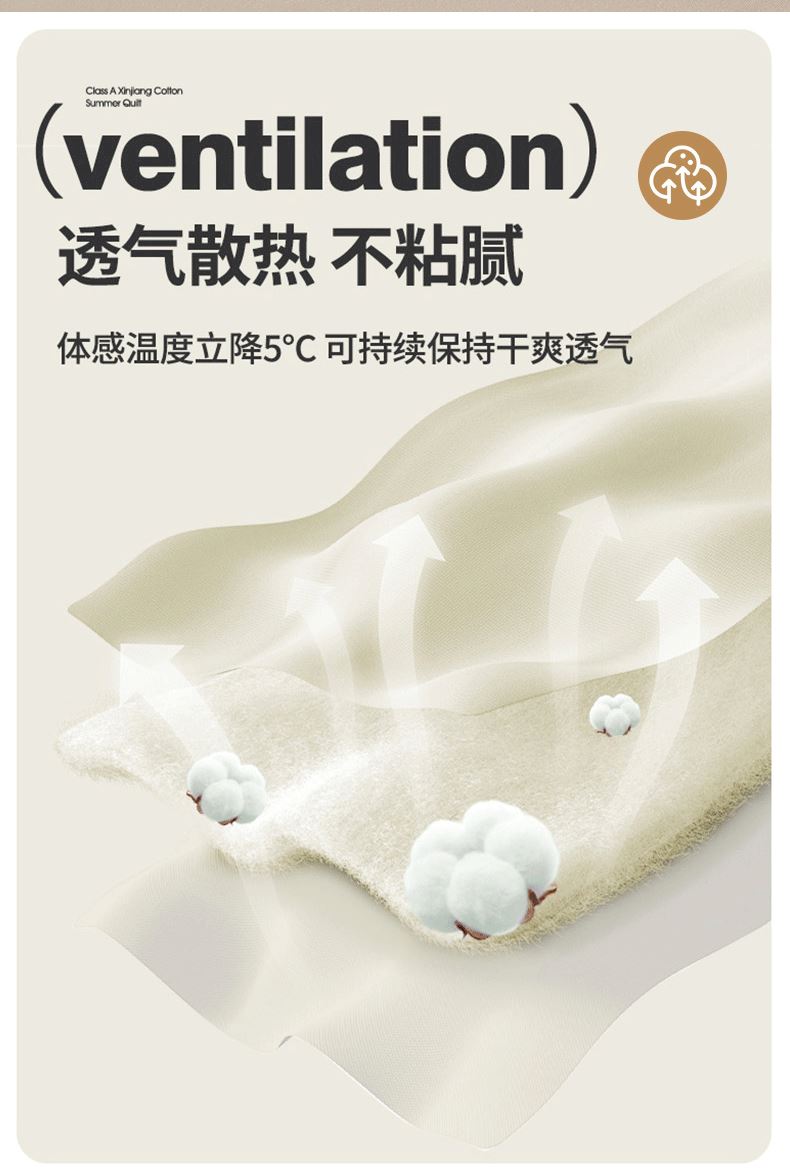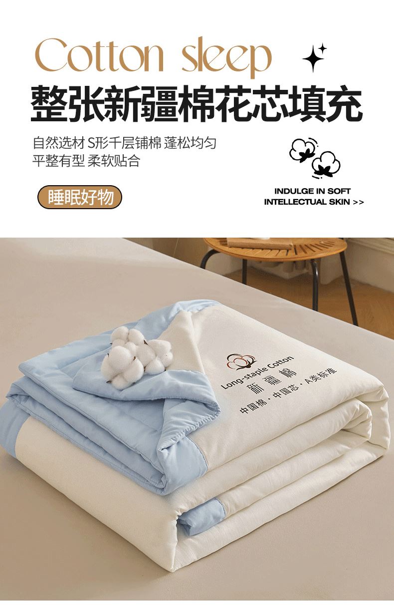 尺寸:150*200cm 面料:水洗棉 填充:新疆棉花 执行标准:GB/T22796-2021 安全类别:GB18401-2010 B类 1.臻选水洗棉面料,源于自然的绵软触感 质感丰盈软糯与肌肤零距离接触,弹性更优良。 2.填充超柔羽丝纤维适合肌肤敏感,零压体验,释放身心压力:科学分区设计:根据人体工学原理,将被子划分为不同区域,承托身体各部位,有效缓解压力,促进血液循环。