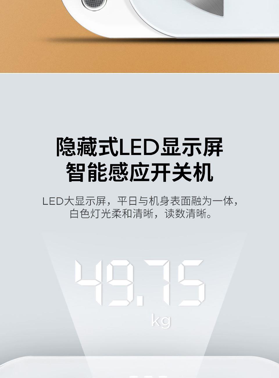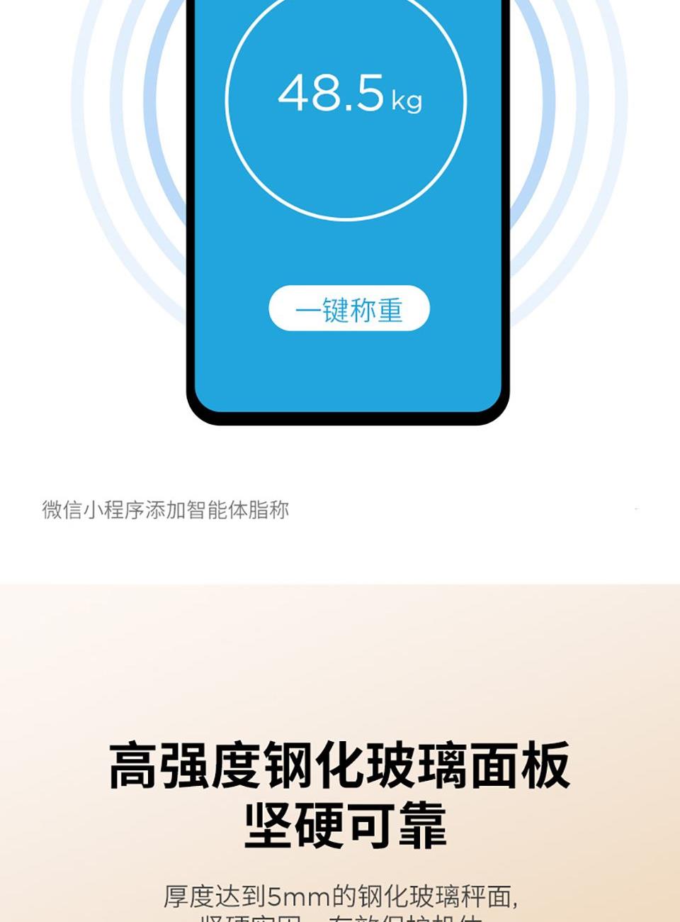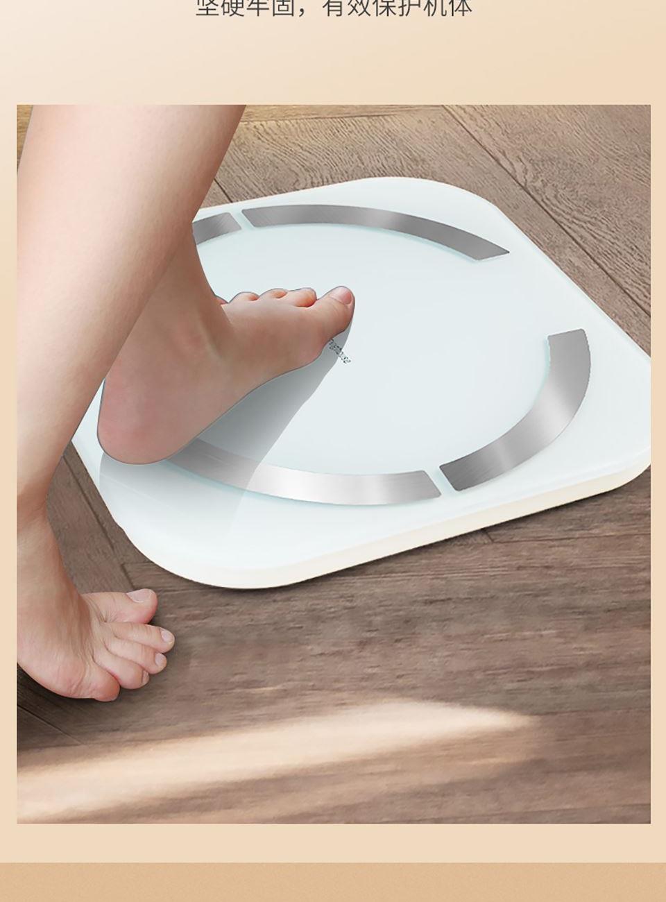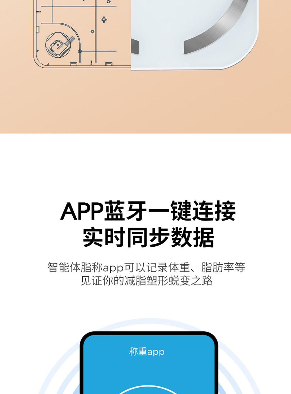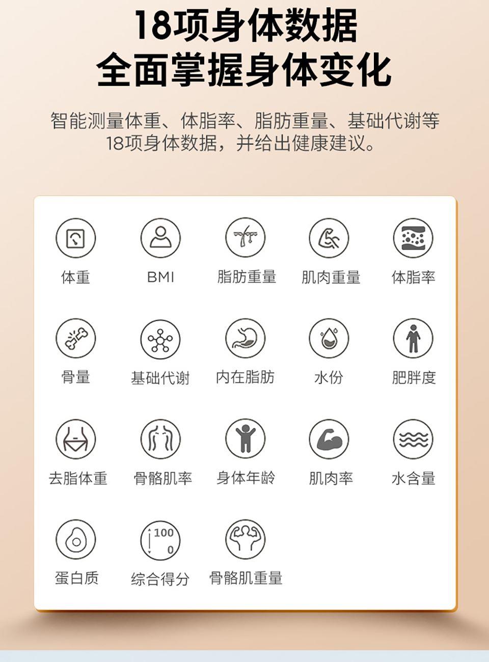 5、通过蓝牙连接手机app, ,支持蓝牙4.0及以上手机,智能测试体重、体脂率、脂肪重量、基础代谢、肌肉率、肌肉重量、内脏脂肪、水份、水含量、蛋白质、骨量、肥胖度、BMI、身体年龄、去脂体重、体型、身体得分等18项数据,并据此生成专属体质报告,给出健康建议。