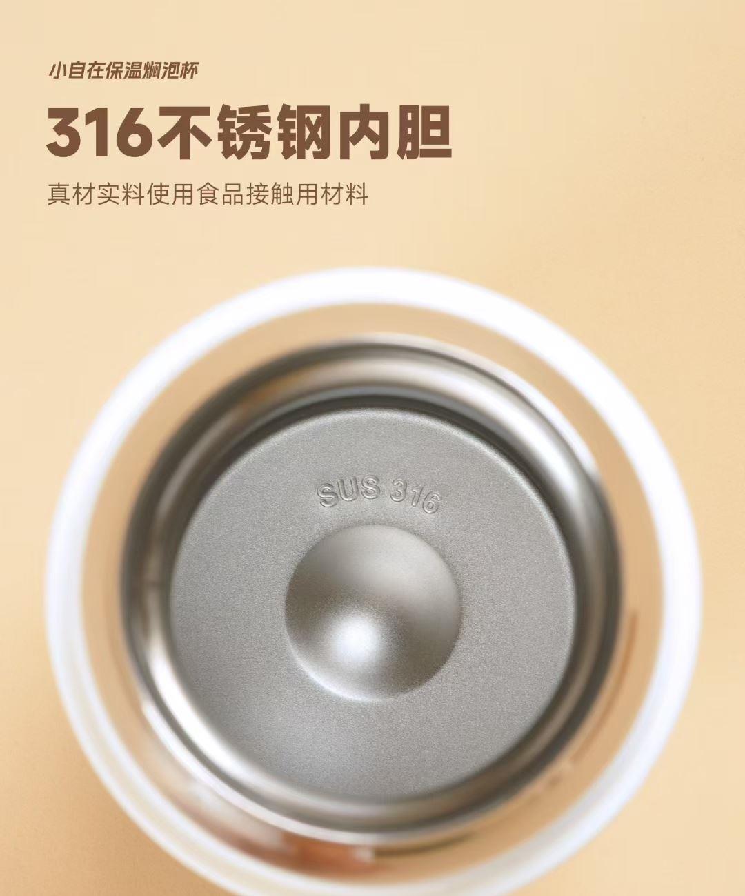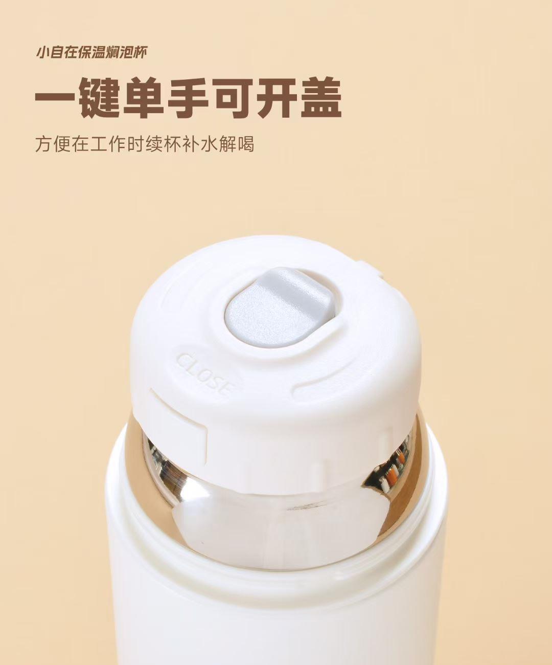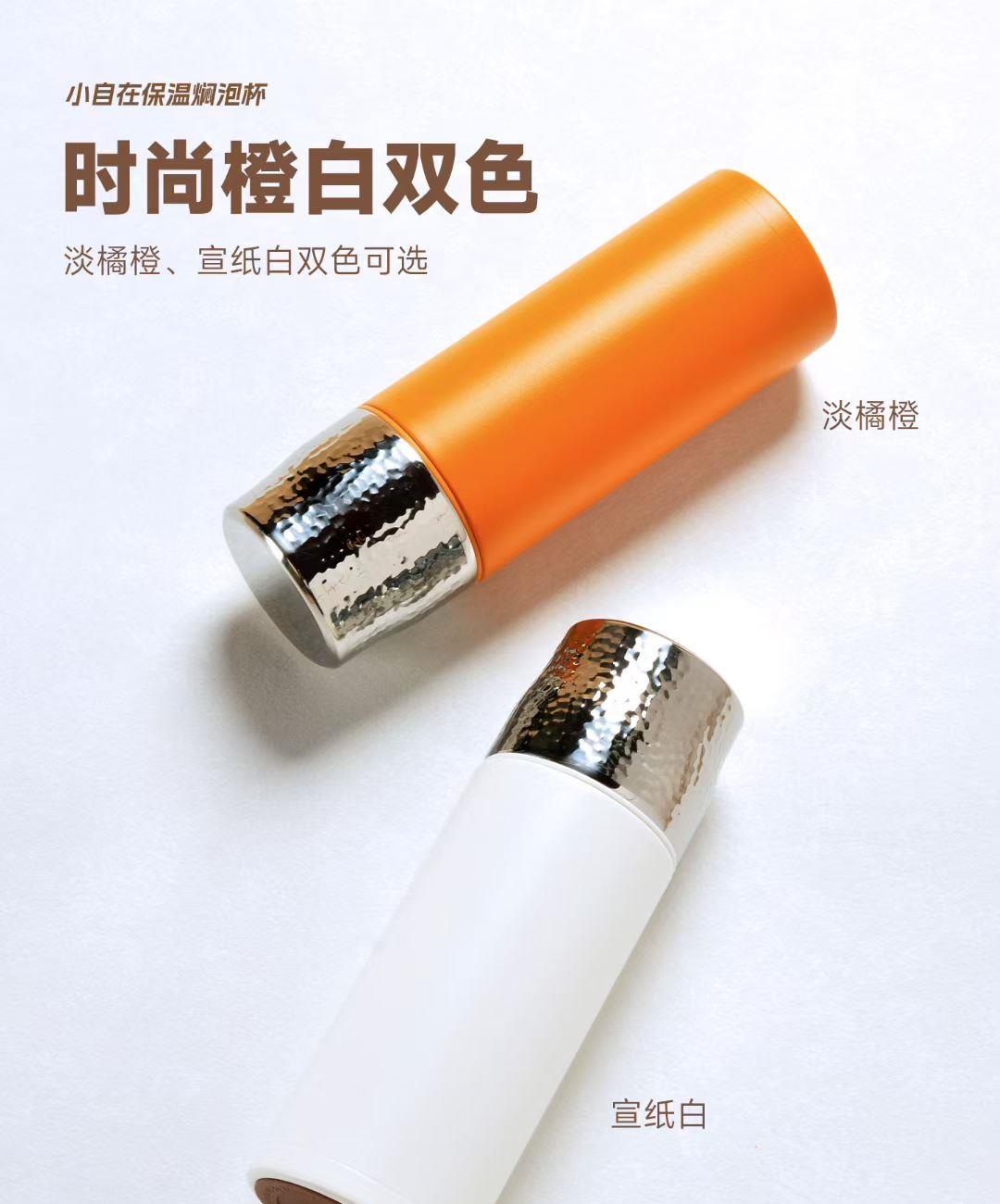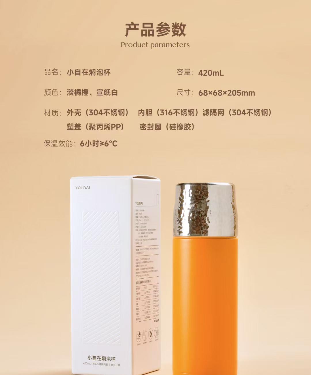 316不锈钢,保鲜易清洗; 茶隔分离茶叶,优雅品茗; 双层防烫全钢锤纹盖,一盖两用; 一键开启内塞,单手可操作; 参数(材质): 内 胆 :奥氏体型不锈钢 (SUS316) 外 壳 :奥氏体型不锈钢06Cr19Ni10(SUS304) 塑料件:聚丙烯(PP) 密封件:硅橡胶 颜色:淡橘橙、宣纸白 尺寸:68x68x205mm 容量:420ml 净重:290g 外箱 : 455*385*250cm 毛重:12Kg