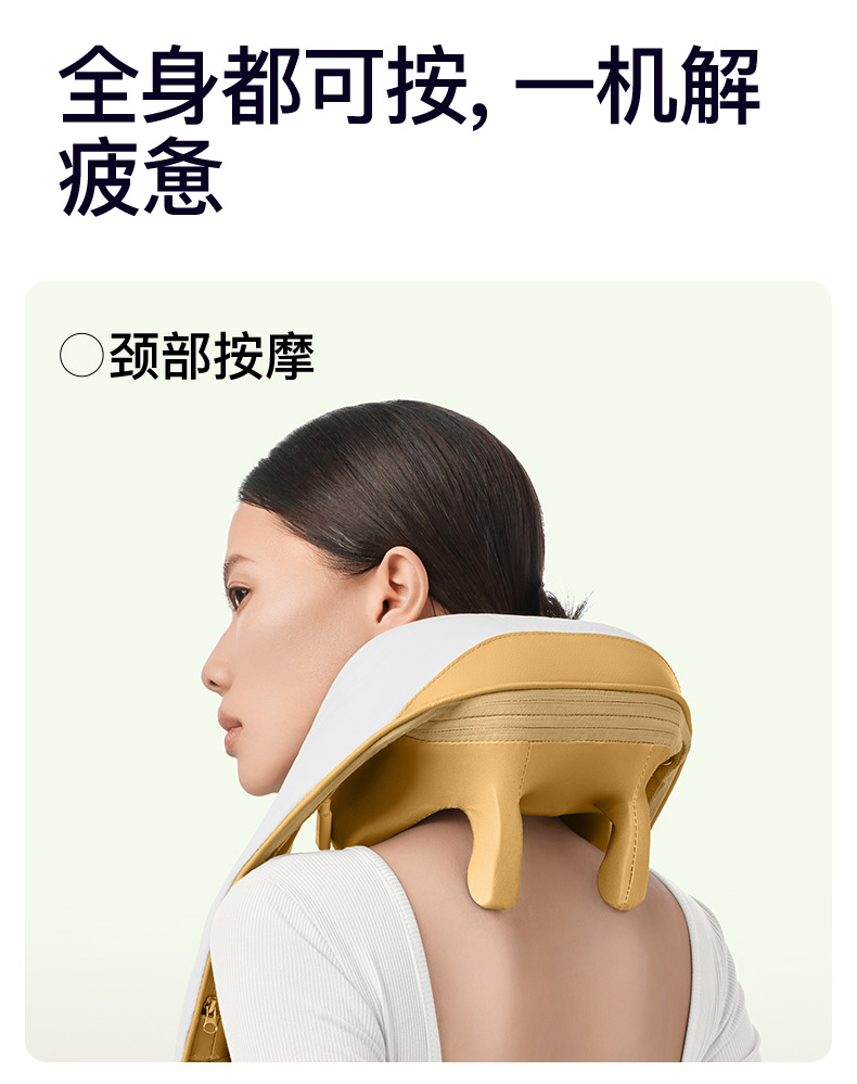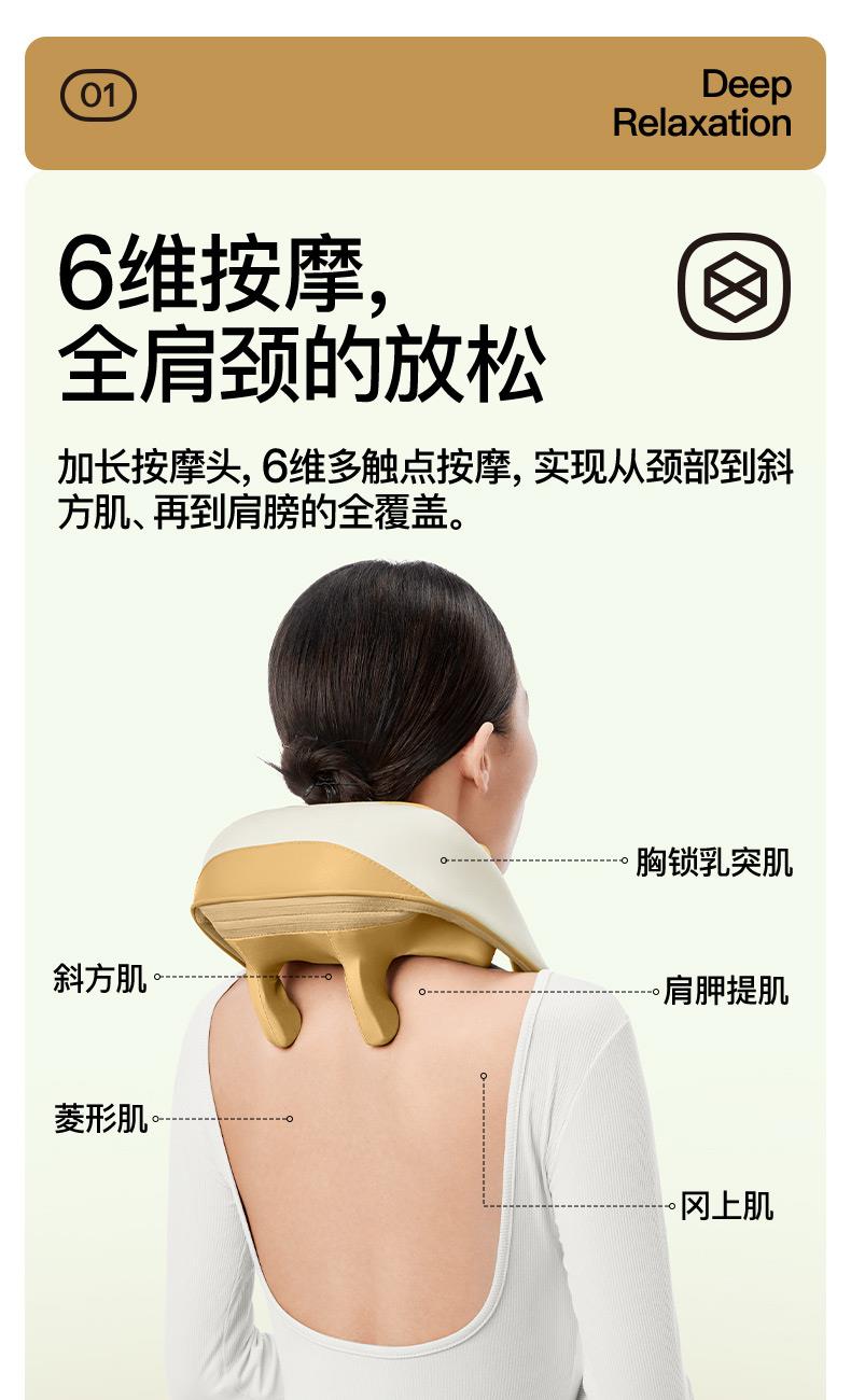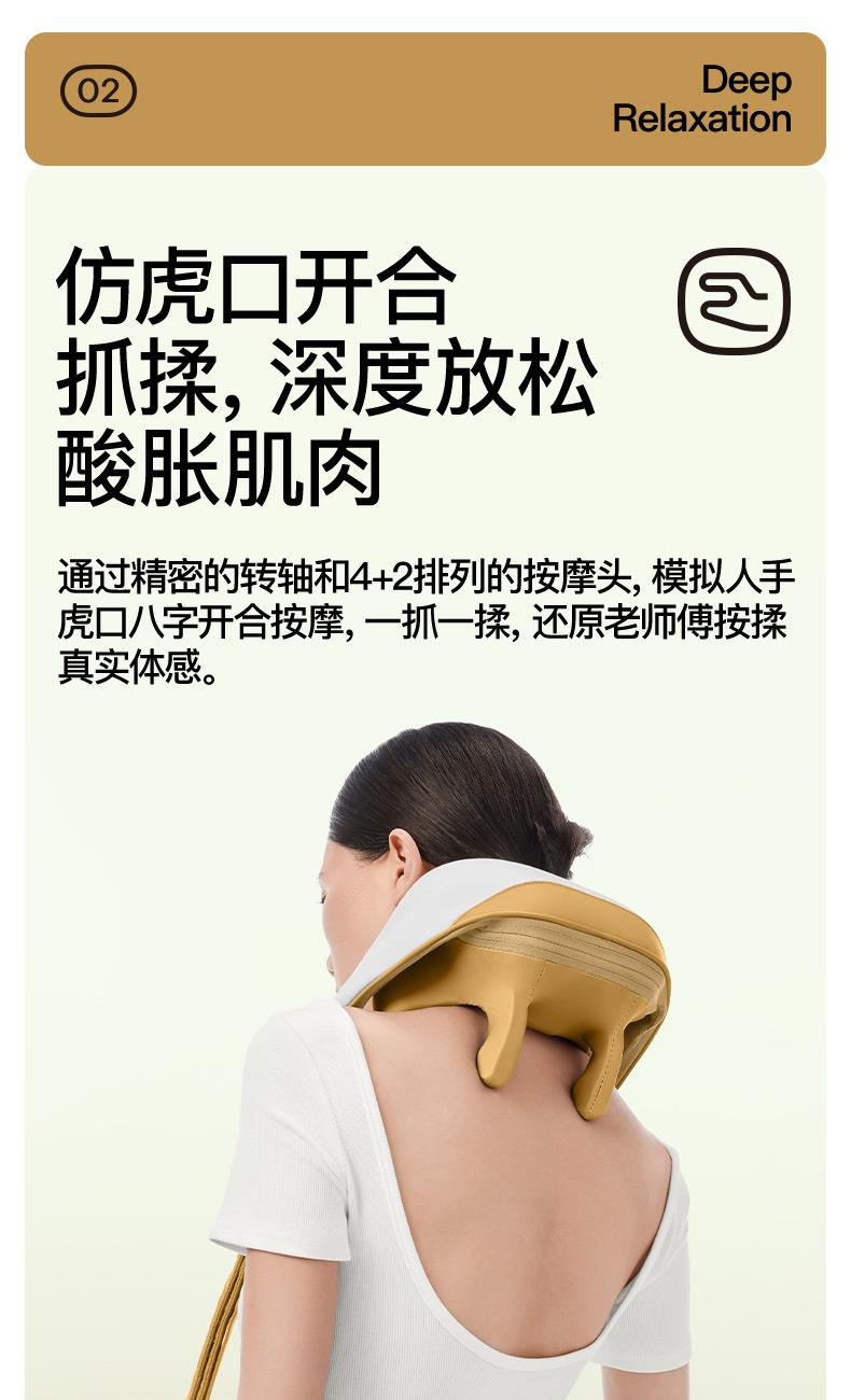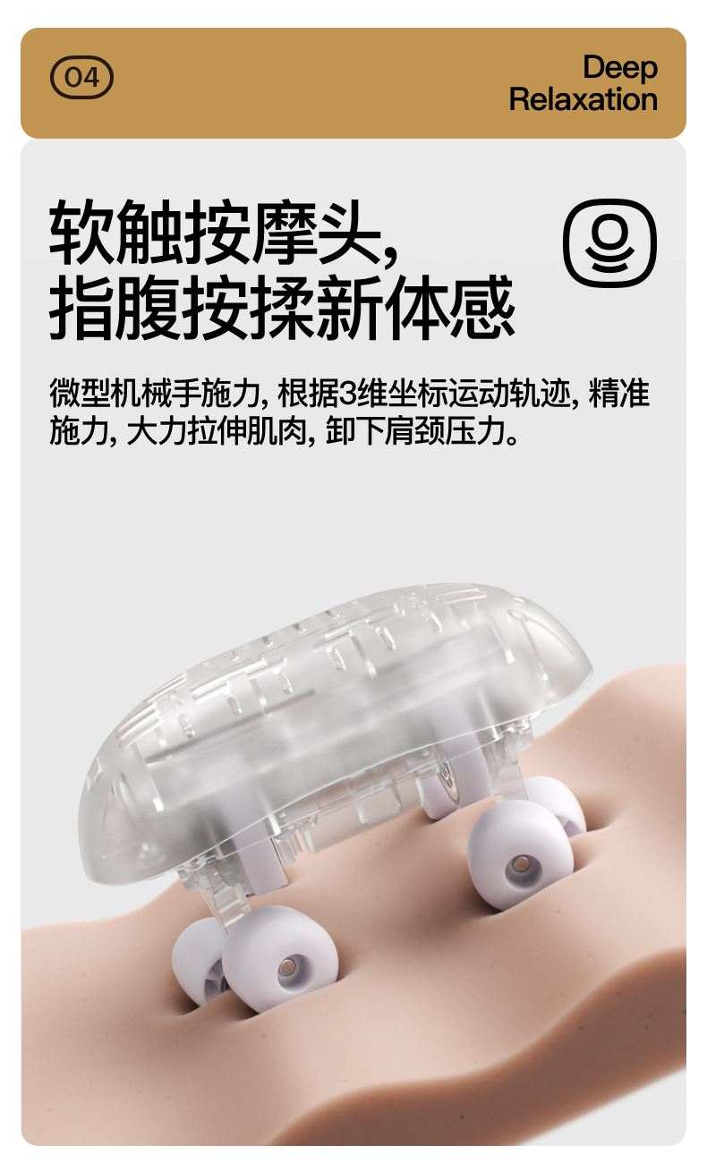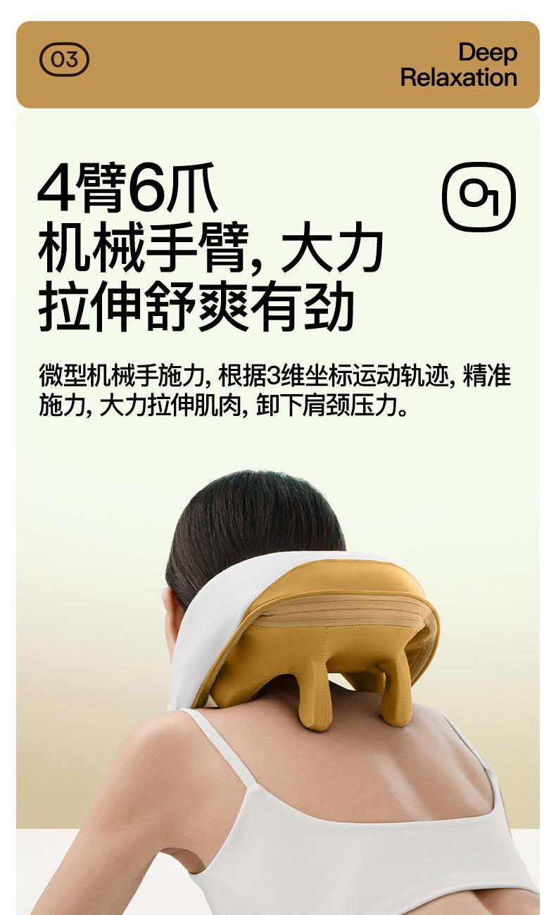 ●6维按摩,全肩颈的放松,加长按摩头,6维多触点按摩,实现从颈部到斜 方肌、再到肩膀 的全覆盖。 ●仿虎口开合抓揉,深度放松酸胀肌肉,通过精密的转轴和4+2排列的按摩头,模拟人手虎 口八字开合按摩,一抓一揉,还原老师傅按揉 真实体感。4臂6爪 机械手臂,大力 拉伸舒爽 有劲 微型机械手施力,根据3维坐标运动轨迹,大力拉伸肌肉,卸下肩颈压力。 ●软触按摩头, 指腹按揉新体感 微型机械手施力,根据3维坐标运动轨迹,大力 拉伸肌肉,卸下肩颈压力。 ●动态纤维发热, 暖透易疲肌肉群 通过科学排列组合,研发的波浪式动态发热技术,在快 速发热的同时,让热感随着按摩深入 肌肉筋膜层。