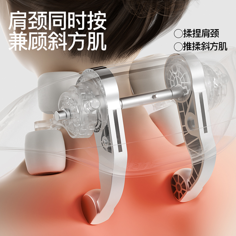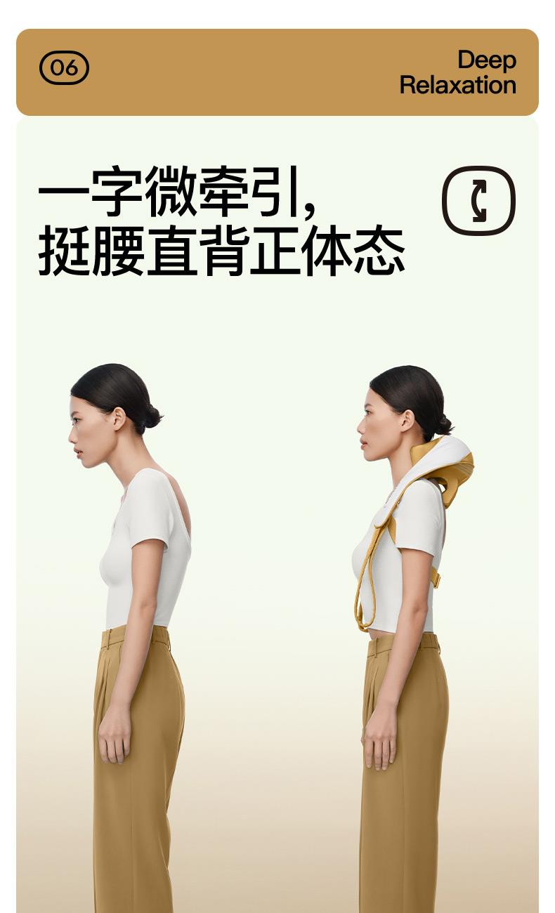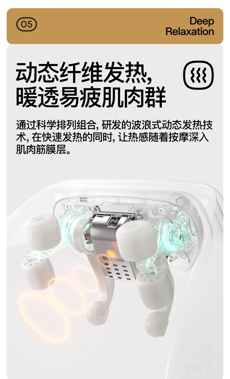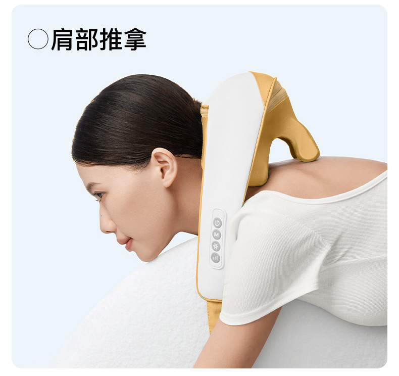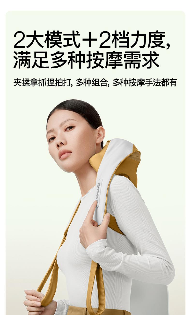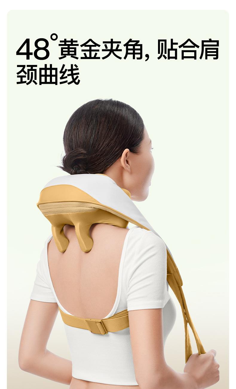 ●6维按摩,全肩颈的放松,加长按摩头,6维多触点按摩,实现从颈部到斜 方肌、再到肩膀 的全覆盖。 ●仿虎口开合抓揉,深度放松酸胀肌肉,通过精密的转轴和4+2排列的按摩头,模拟人手虎 口八字开合按摩,一抓一揉,还原老师傅按揉 真实体感。4臂6爪 机械手臂,大力 拉伸舒爽 有劲 微型机械手施力,根据3维坐标运动轨迹,大力拉伸肌肉,卸下肩颈压力。 ●软触按摩头, 指腹按揉新体感 微型机械手施力,根据3维坐标运动轨迹,大力 拉伸肌肉,卸下肩颈压力。 ●动态纤维发热, 暖透易疲肌肉群 通过科学排列组合,研发的波浪式动态发热技术,在快 速发热的同时,让热感随着按摩深入 肌肉筋膜层。