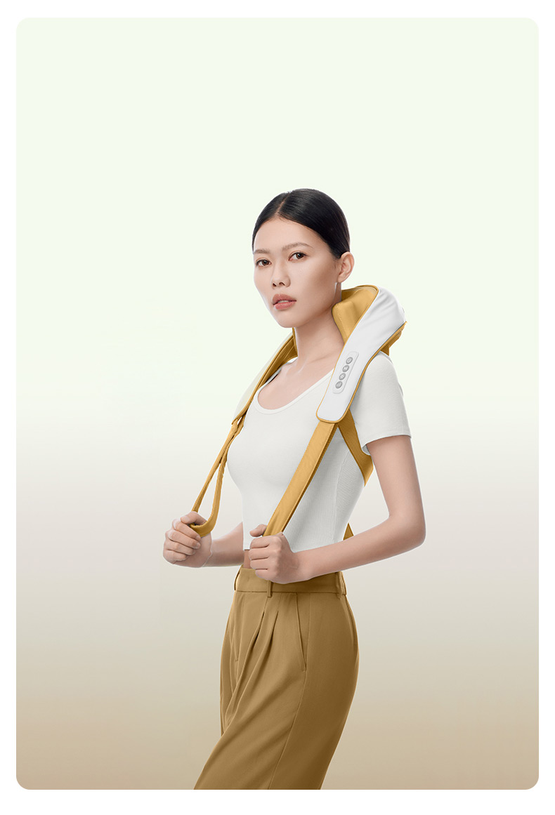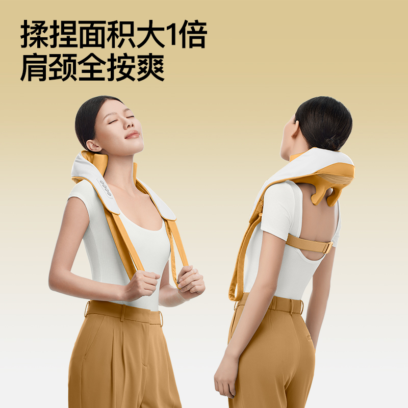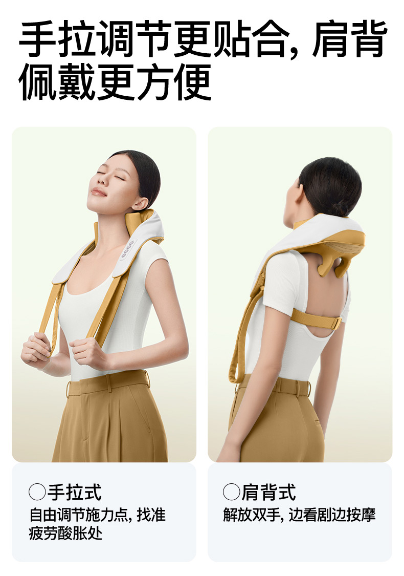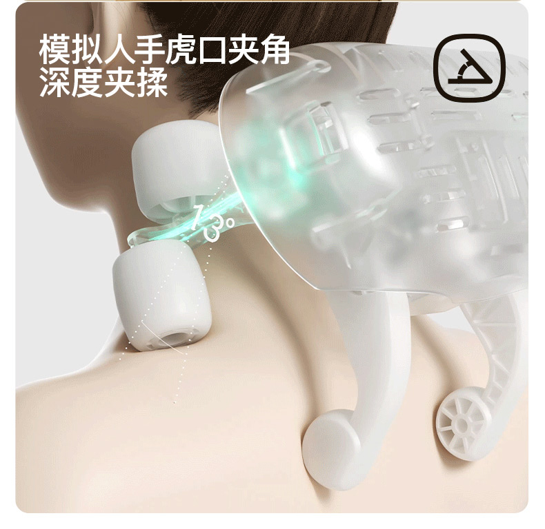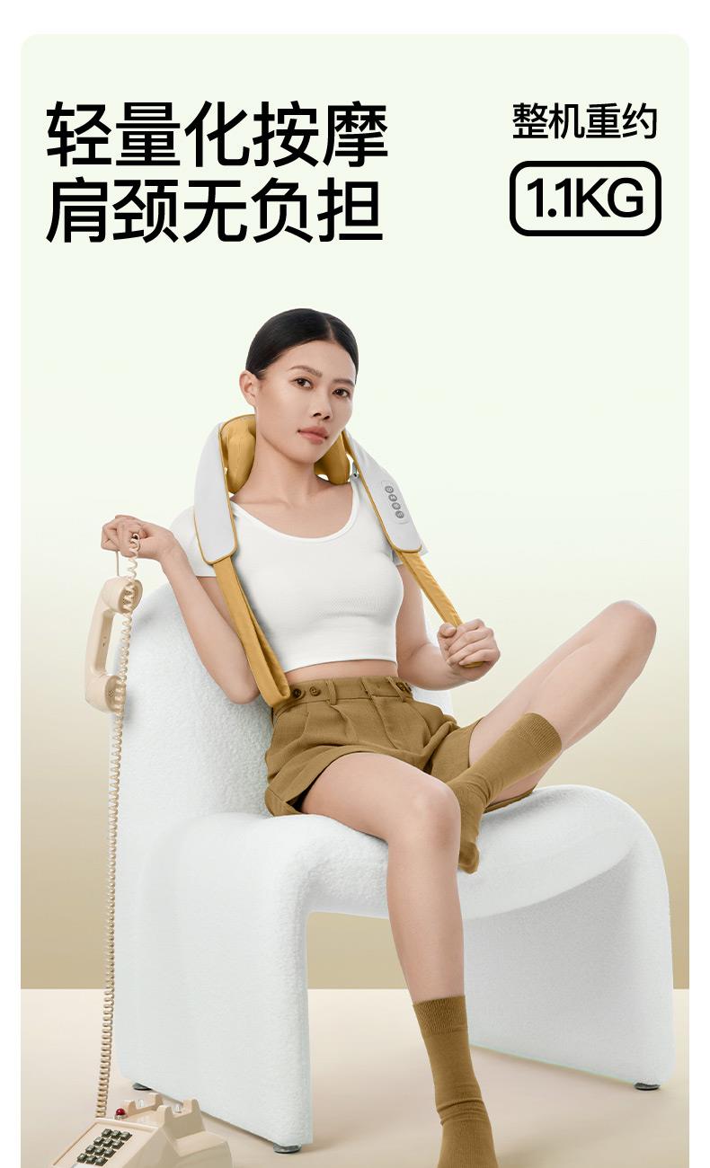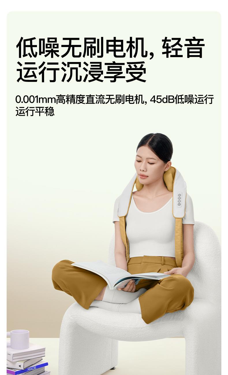 ●6维按摩,全肩颈的放松,加长按摩头,6维多触点按摩,实现从颈部到斜 方肌、再到肩膀 的全覆盖。 ●仿虎口开合抓揉,深度放松酸胀肌肉,通过精密的转轴和4+2排列的按摩头,模拟人手虎 口八字开合按摩,一抓一揉,还原老师傅按揉 真实体感。4臂6爪 机械手臂,大力 拉伸舒爽 有劲 微型机械手施力,根据3维坐标运动轨迹,大力拉伸肌肉,卸下肩颈压力。 ●软触按摩头, 指腹按揉新体感 微型机械手施力,根据3维坐标运动轨迹,大力 拉伸肌肉,卸下肩颈压力。 ●动态纤维发热, 暖透易疲肌肉群 通过科学排列组合,研发的波浪式动态发热技术,在快 速发热的同时,让热感随着按摩深入 肌肉筋膜层。