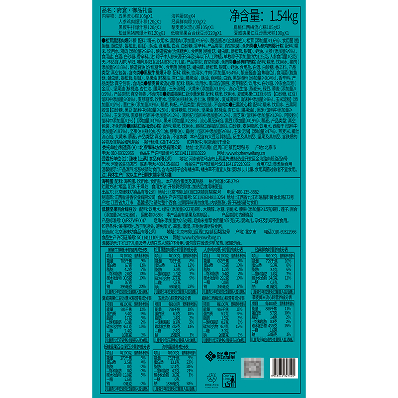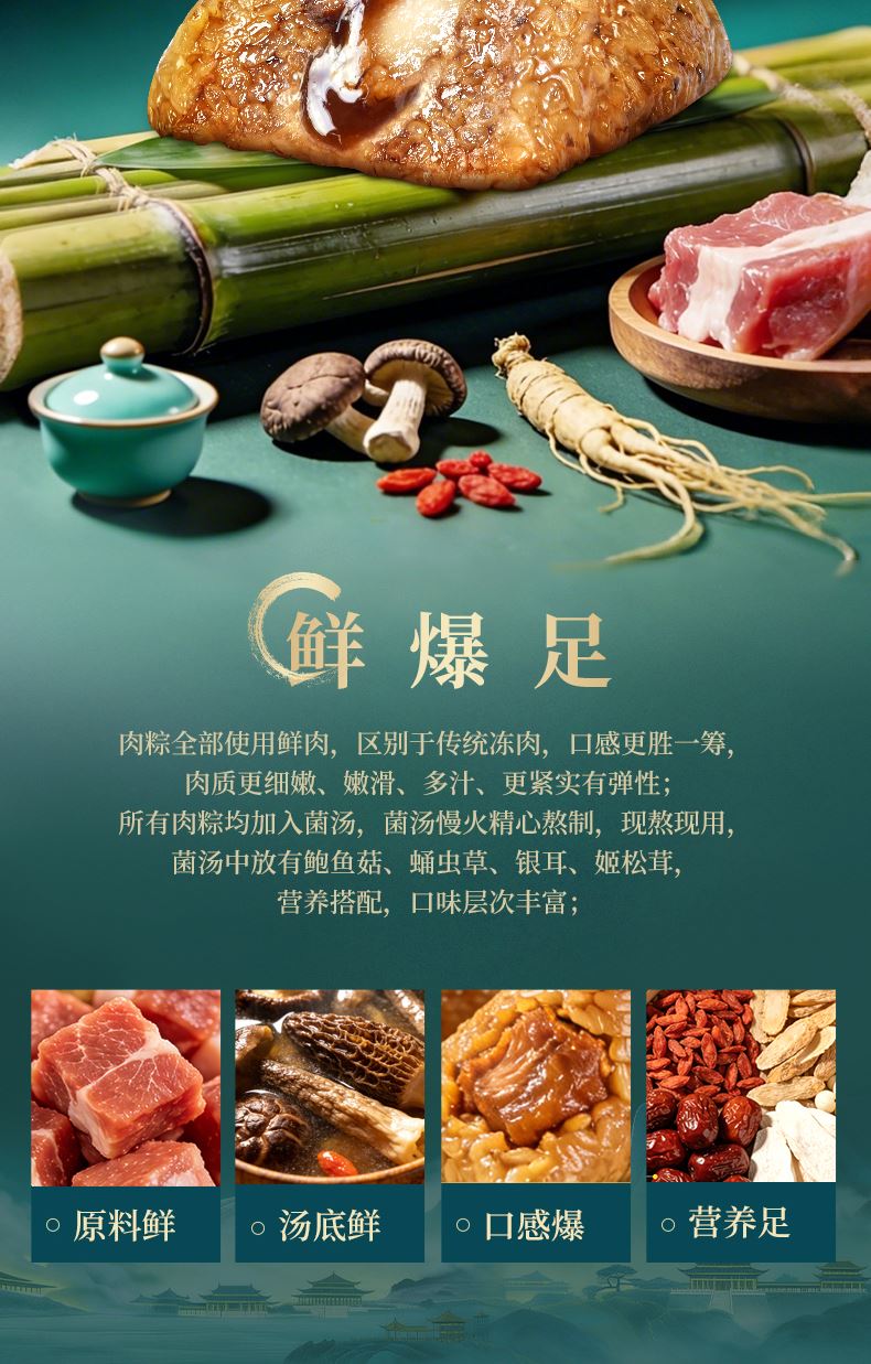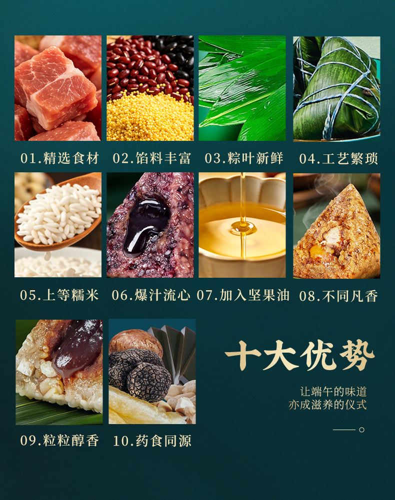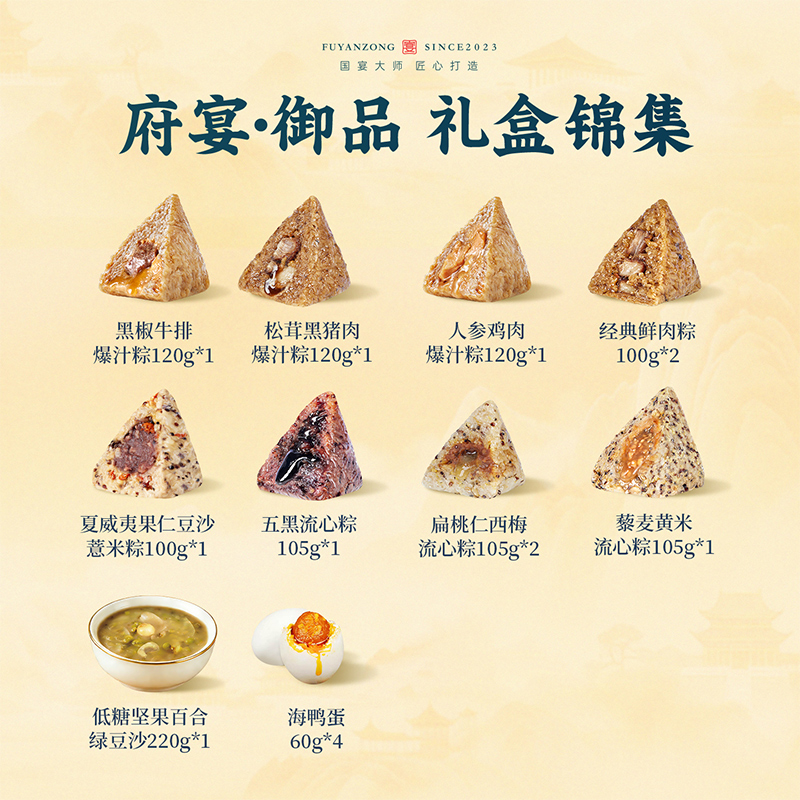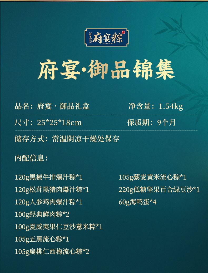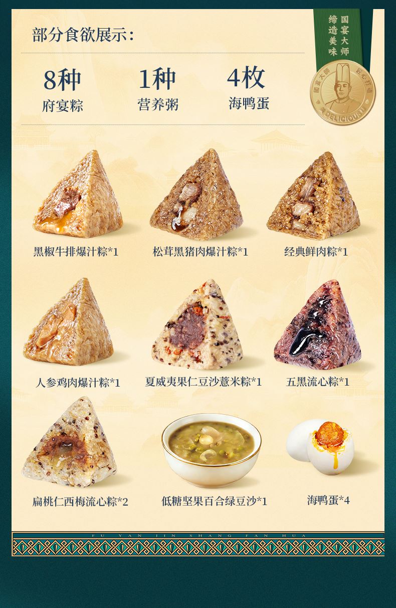 120g黑椒牛排爆汁粽*1 120g松茸黑猪肉爆汁粽*1 120g人参鸡肉爆汁粽*1 100g经典鲜肉粽*2 100g夏威夷果仁豆沙薏米粽*1 105g五黑流心粽*1 105g扁桃仁西梅流心粽*2 105g藜麦黄米流心粽*1 220g低糖坚果百合绿豆沙*1 60g海鸭蛋*4