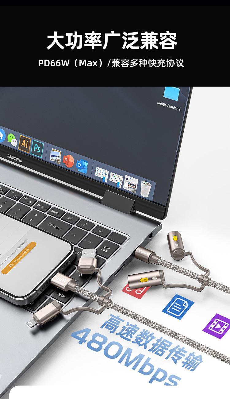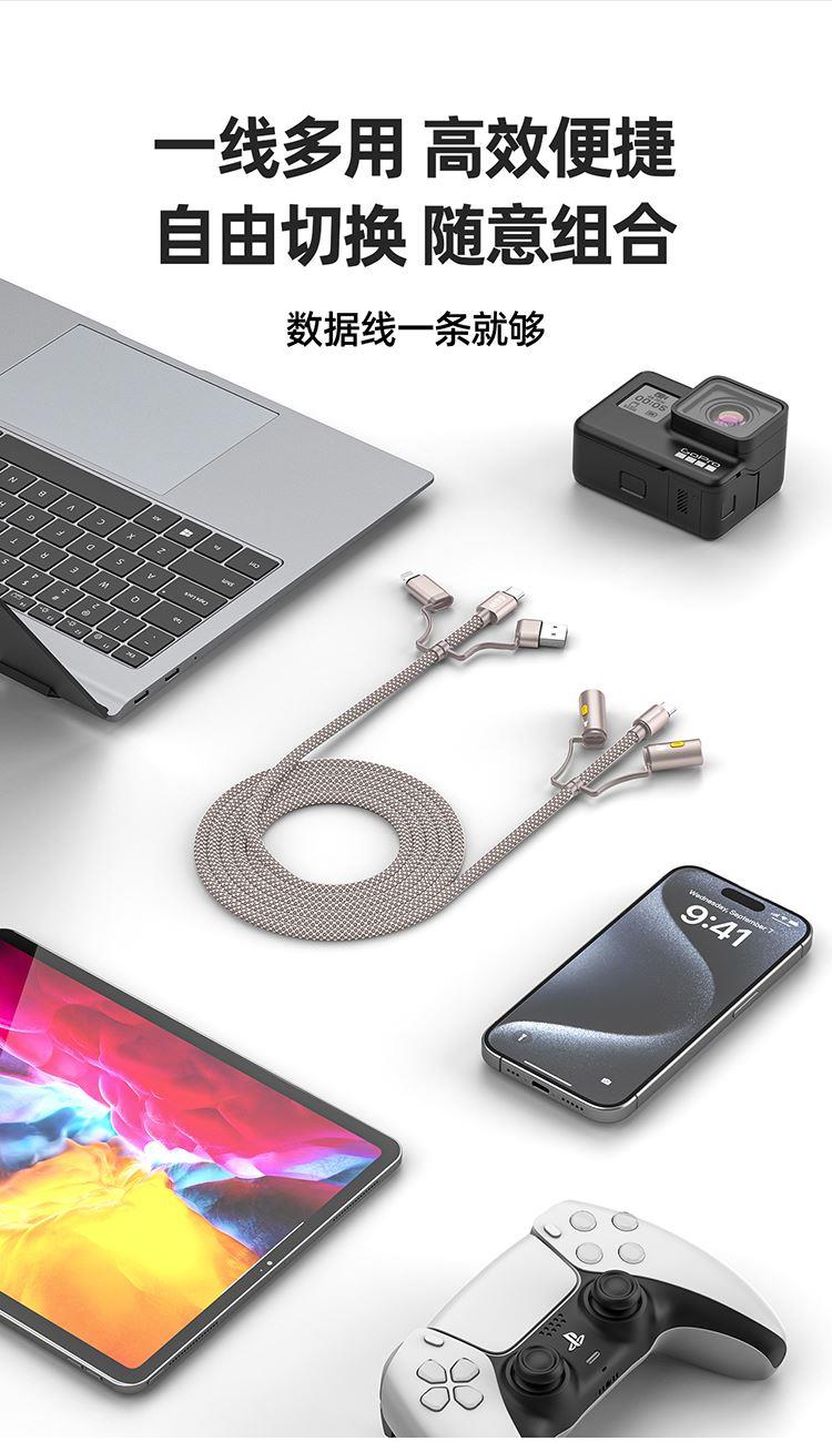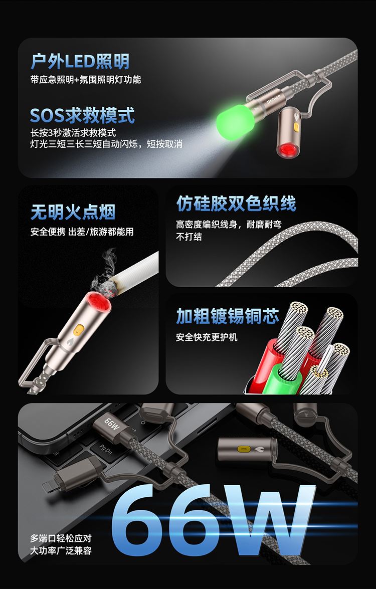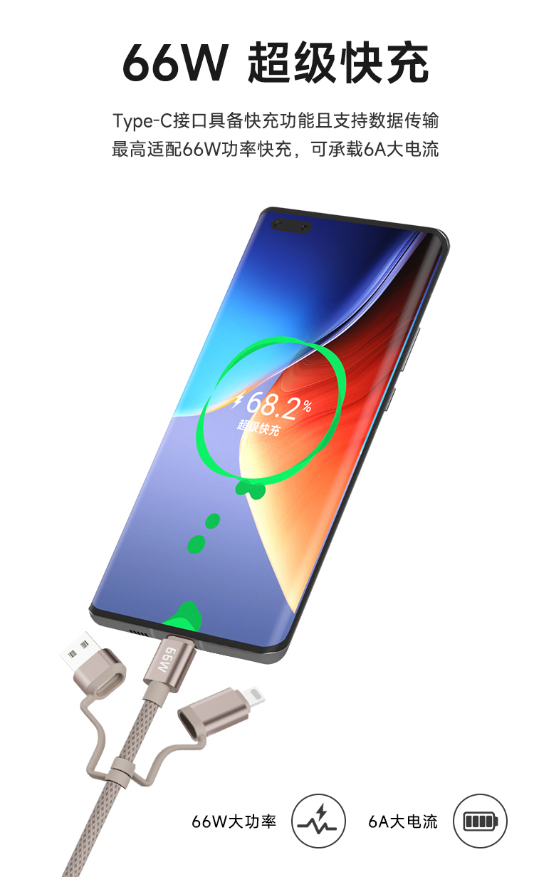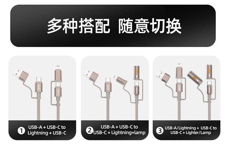 接口:USB-A、Type-C、lightning 材质:铝合金+编织线+TPE 线长:1.2米 功能:快充、数据传输 电流:5A 功率:66W (Max) 一线多用 高效便携,自由切换 随意组合,数据线一条就够 仿硅胶双色织线,高密度编织线身,耐磨耐弯不打结 加粗镀锡铜芯,安全快充更护机 66W超级快充 多接口轻松应对,大功率广泛兼容