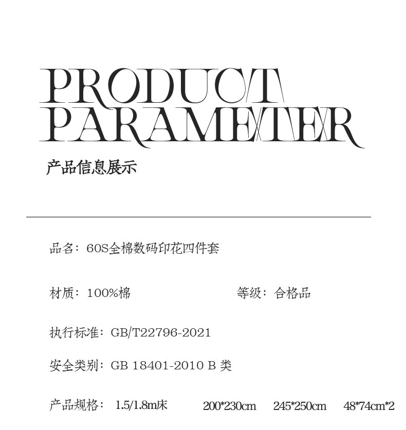 被套:200×230cm 床单:245×250cm 枕套:48×74cm 适用:1.5M-1.8M床 面料:60支全棉 风格:数码印花 甄选60支全棉面料,手感细腻亲肤,透气贴肤,呵护舒适睡眠,活性印花工艺,色彩靓丽,色牢度高,不易起球透气贴肤,细腻柔软,刺绣工艺,不褪色,轻奢美观。