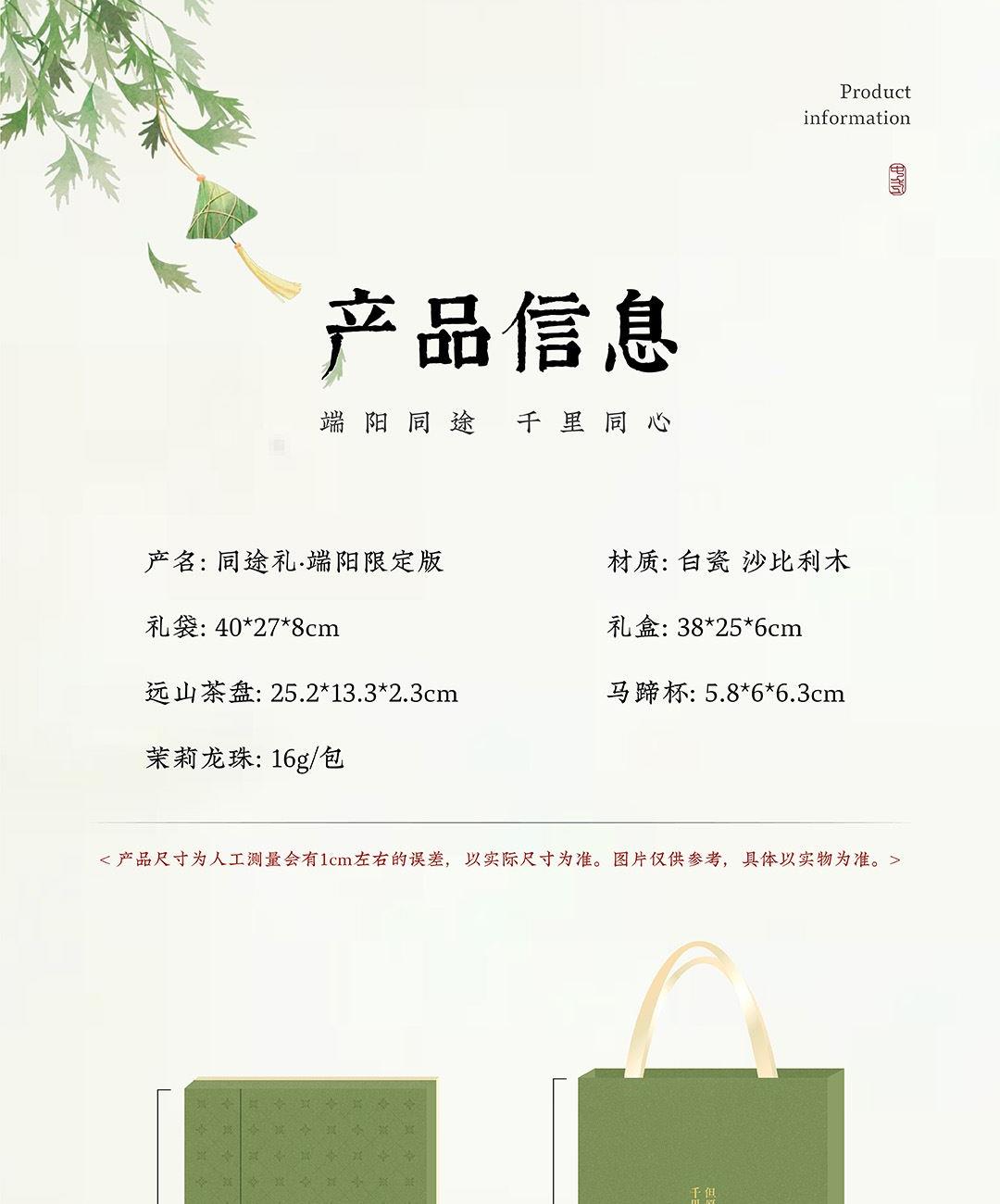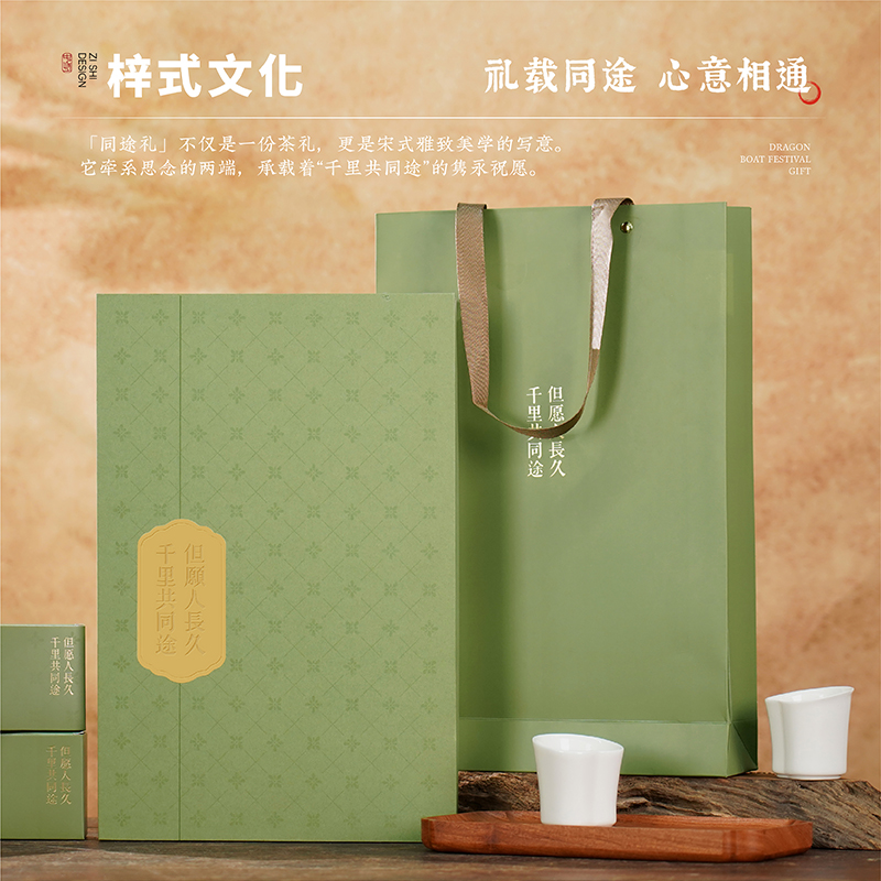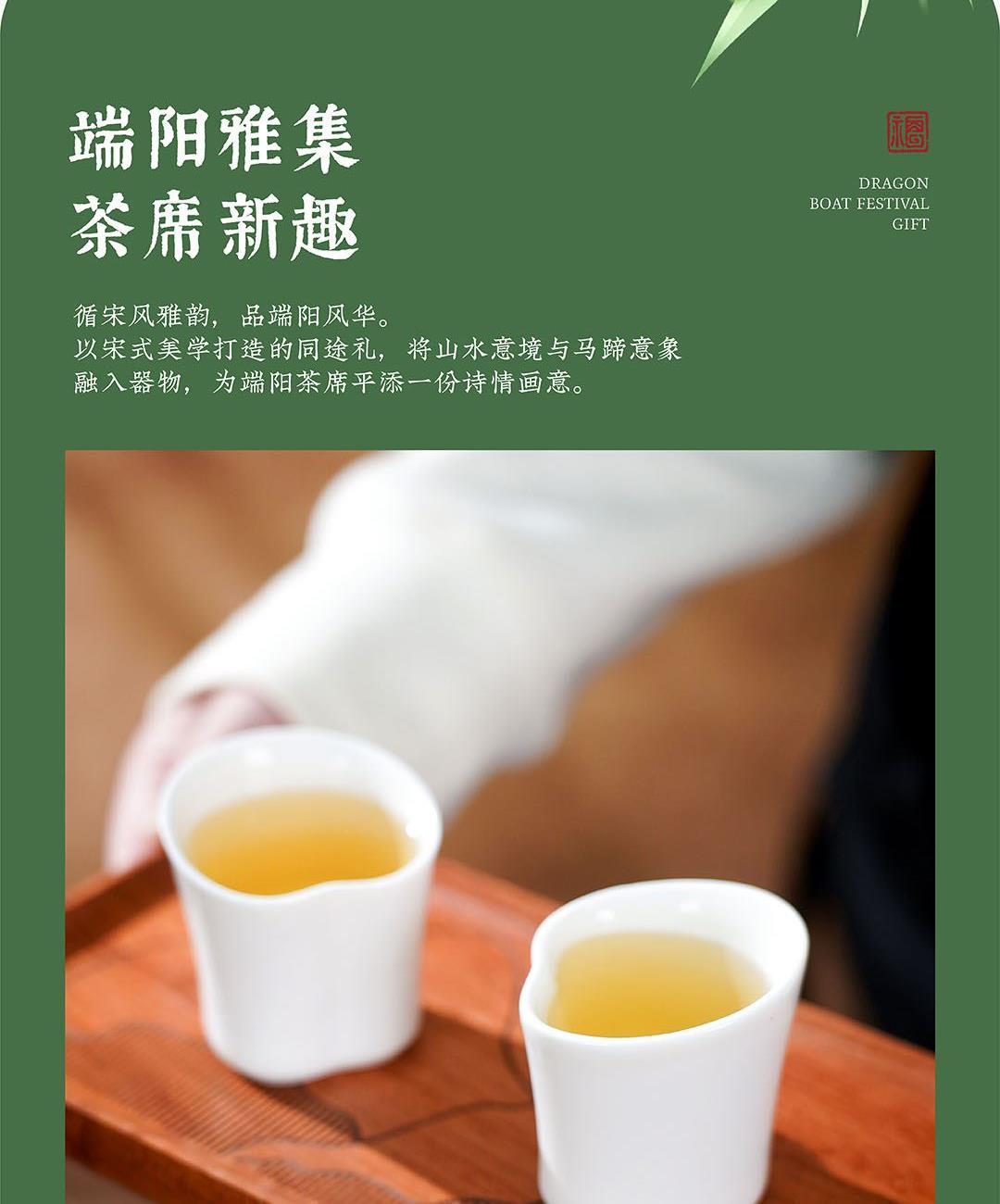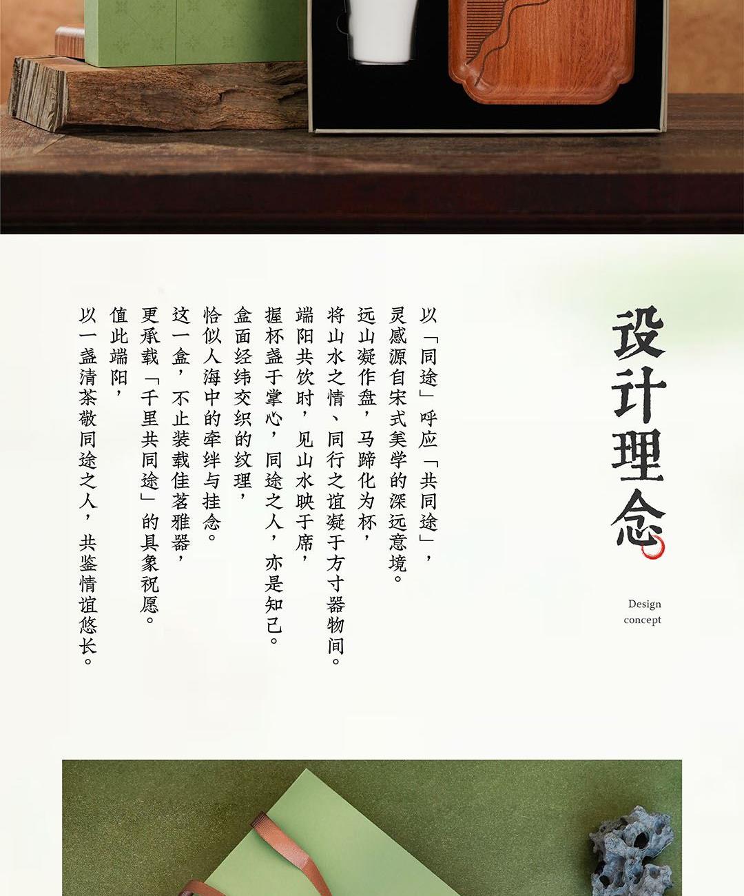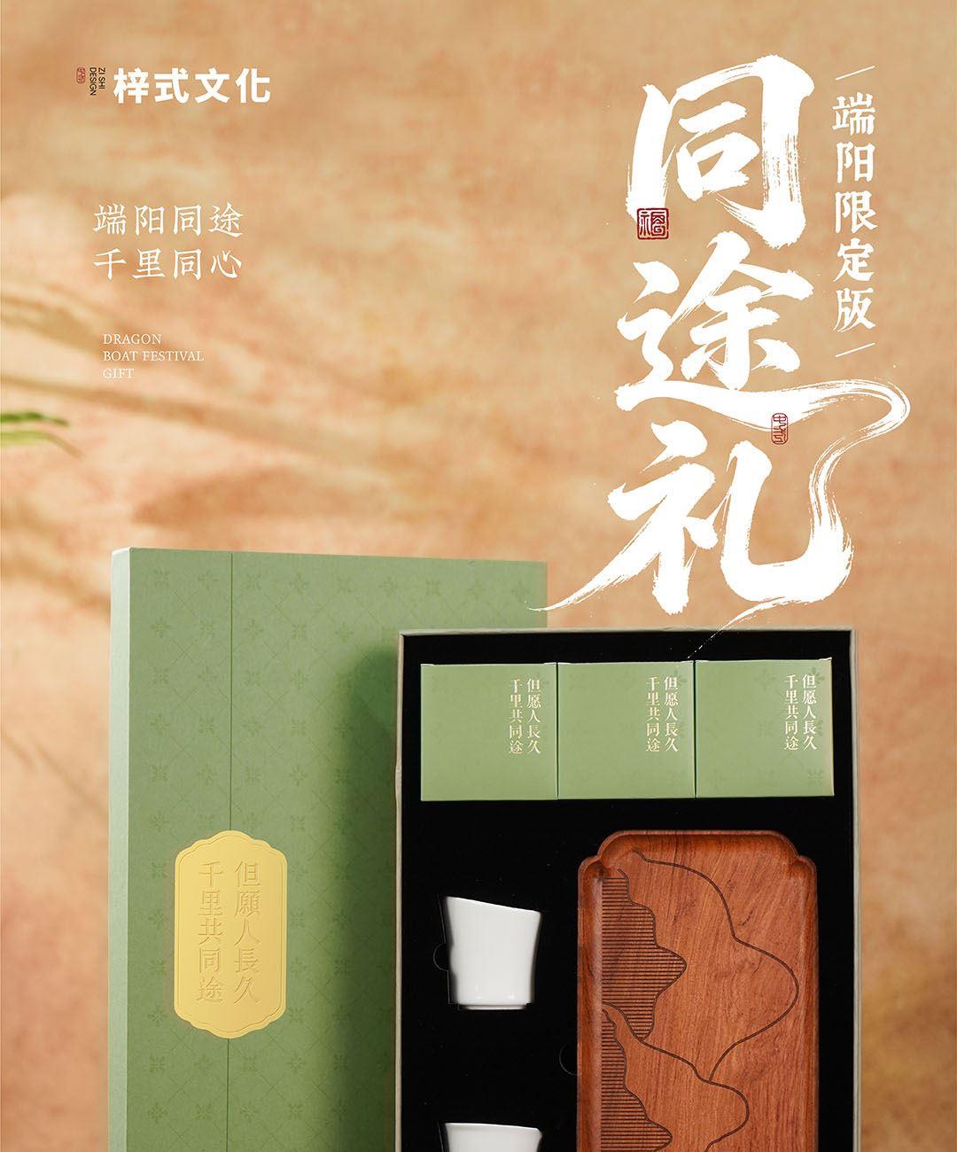 以“同途”呼应“共同途”,灵感源自宋式美学的深远意境。远山凝作盘,马蹄化为杯,将山水之情、同行之谊凝于方寸器物间。端阳共饮时,见山水映于席,握杯盏于掌心,同途之人,亦是知己。盒面经纬交织的纹理,恰似人海中的牵绊与挂念。这一盒,不止装载佳茗雅器,更承载“千里共同途”的具象祝愿。值此端阳,以一盏清茶敬同途之人,共鉴情谊悠长。