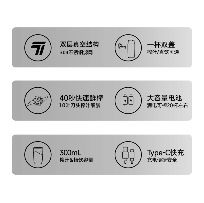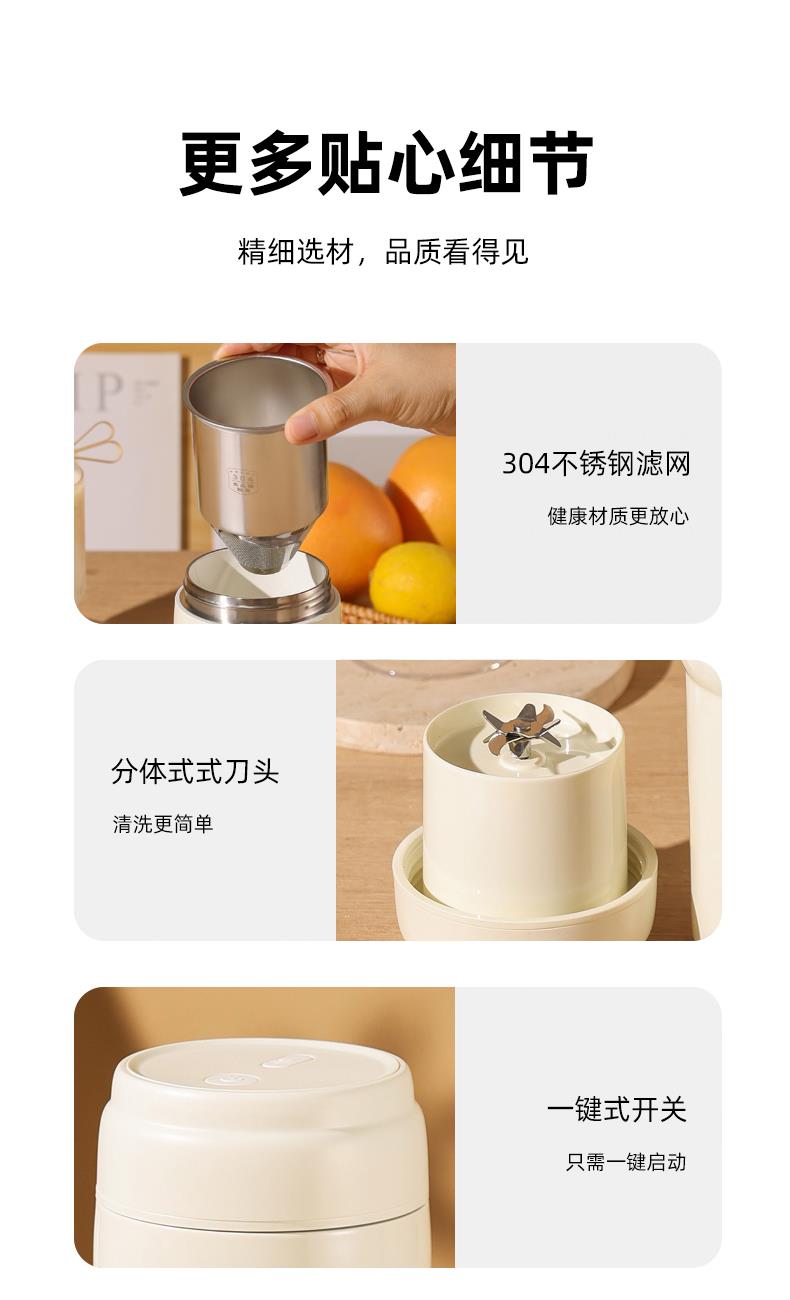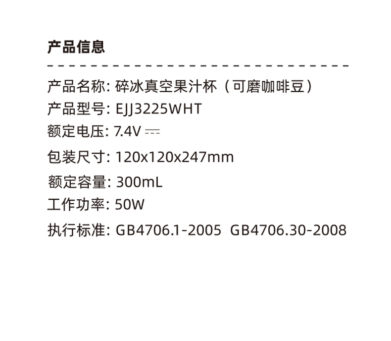 功率:50W 电压:7.4V 容量:300mL 毛重:0.8Kg 材质:外壳304材质 彩盒包装尺寸:120*120*247mm 外箱包装尺寸:625*500*265mm 推荐理由: 1、304不锈钢真空陶瓷釉内胆,可保温保冷 2、动力强劲,可碎冰打冰沙,可打果汁,可研磨咖啡豆,现磨咖啡 3、带不锈钢滤网,咖啡豆研磨后可直接过滤冲泡 4、双饮模式,一杯双盖,机头盖和提手直饮盖。 5、不仅是果汁杯,还是保温杯,直饮盖,秒变保温杯 6、300ml容量,小巧可爱,陶瓷釉内胆,不粘易清洗