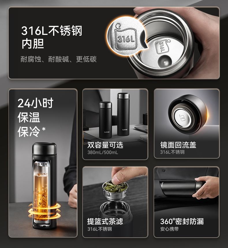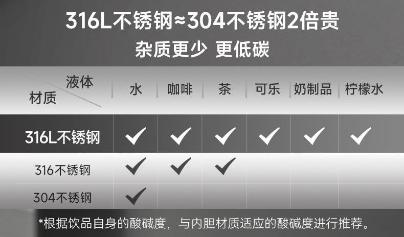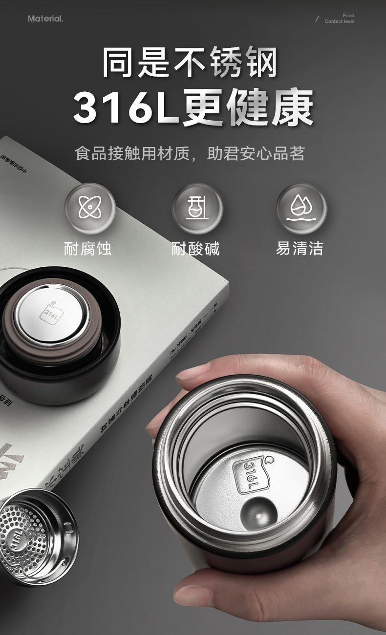 规格参数 功能卖点 1、316L不锈钢,耐磨耐用耐腐蚀 2、饮口轻松拆卸,清洗更便捷 3、轻音杯垫,摆放轻音,不易倒 4、密封设计,倒置不漏