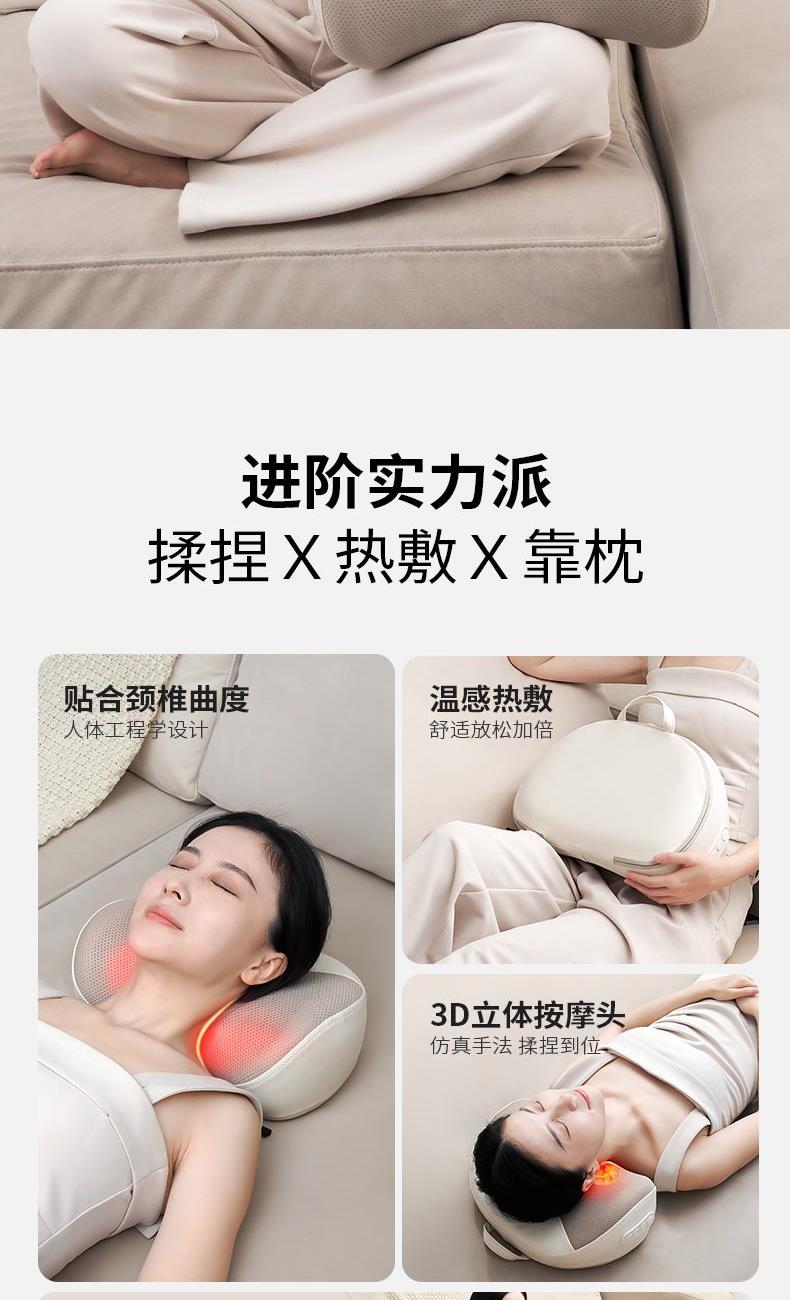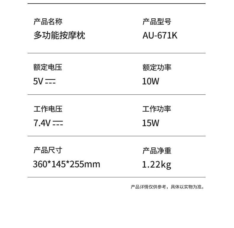 额定电压:5V 额定功率:10W 工作电压:7.4V 工作功率:15W 材 质:PU皮、弹性网 肩部放松,舒腰解乏,背部按摩,腿部养护,多部位使用 一机多用途,三档力度,正反可转,满足全家人使用 简单易操控,一键开机,一键加热,长辈一教就会 仿人手深层揉捏,深度贴合颈椎曲度,按摩放松到位 低分贝设计,轻音不扰人