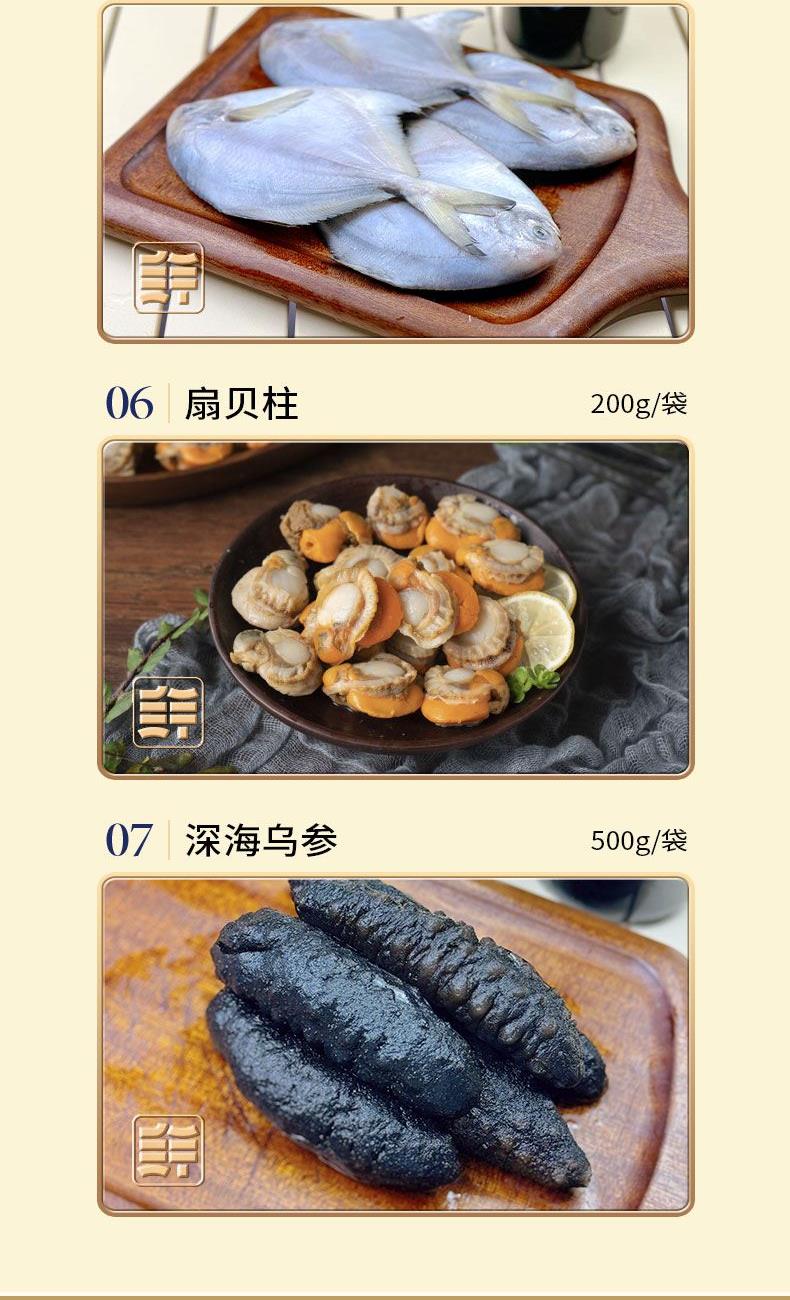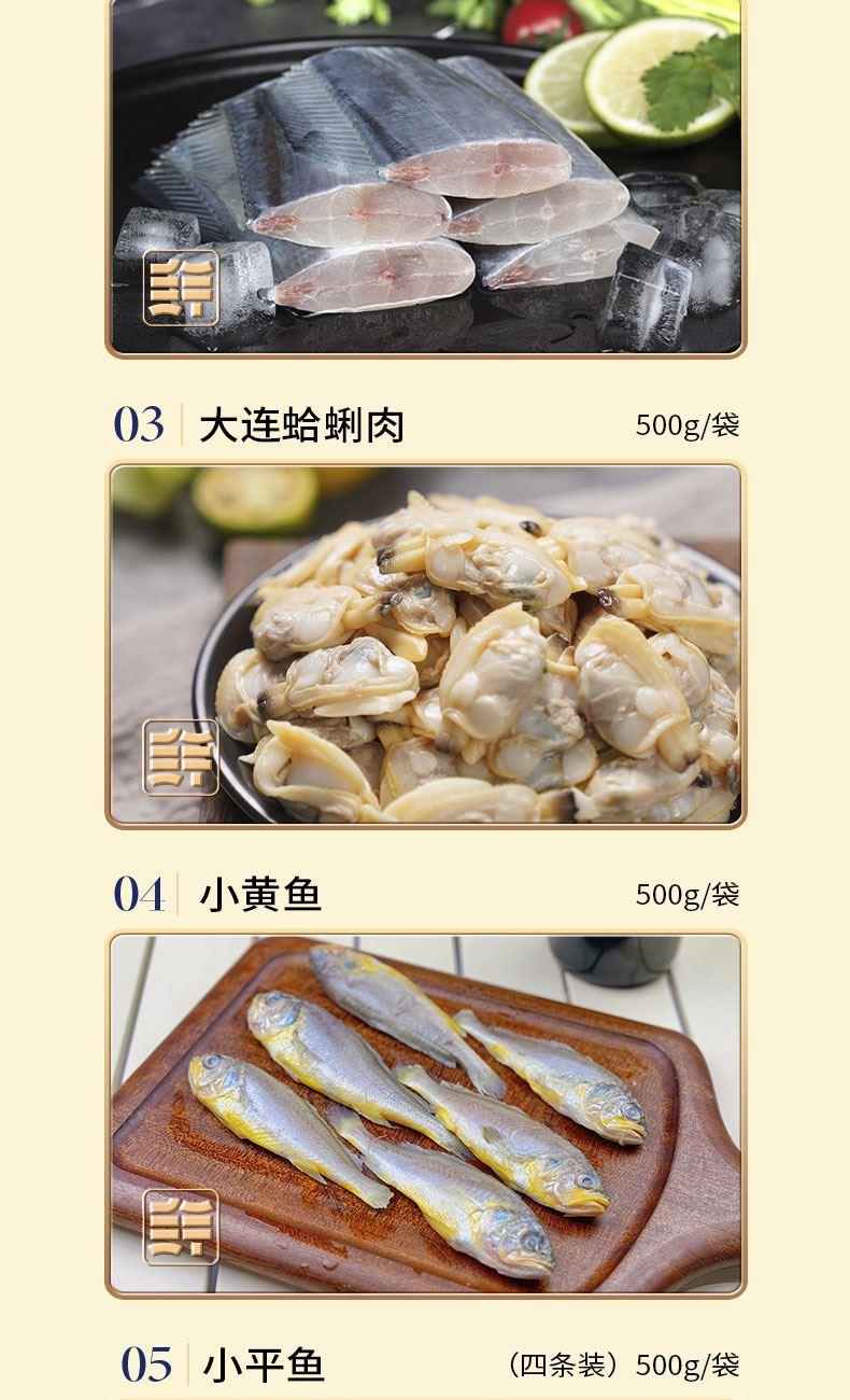 小黄鱼500g*1袋 墨鱼花250g×1袋 深海乌参500g×1袋 扇贝柱200g*1袋 带鱼段800g×1袋 小平鱼(四条装)500g*1袋 大连蛤蜊肉500g×1袋