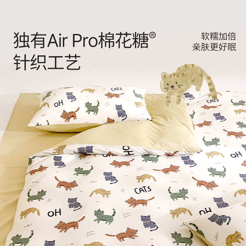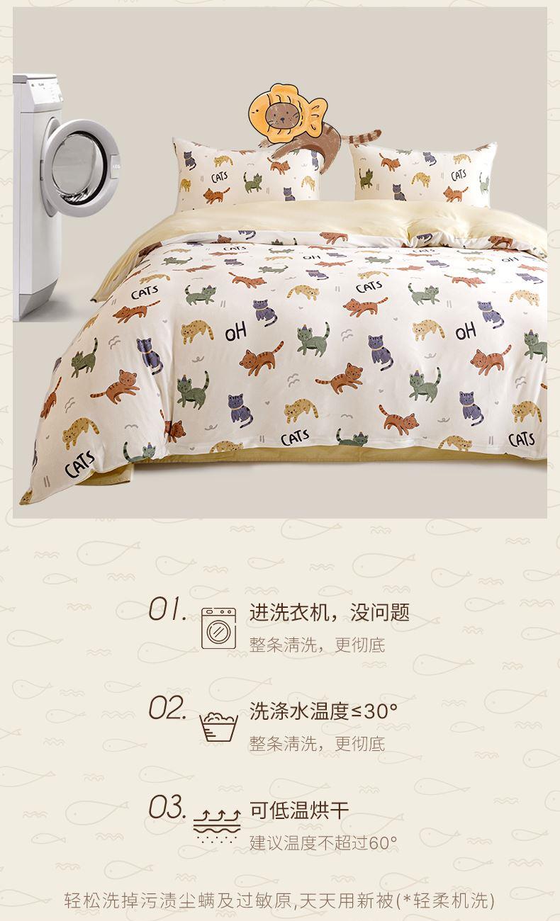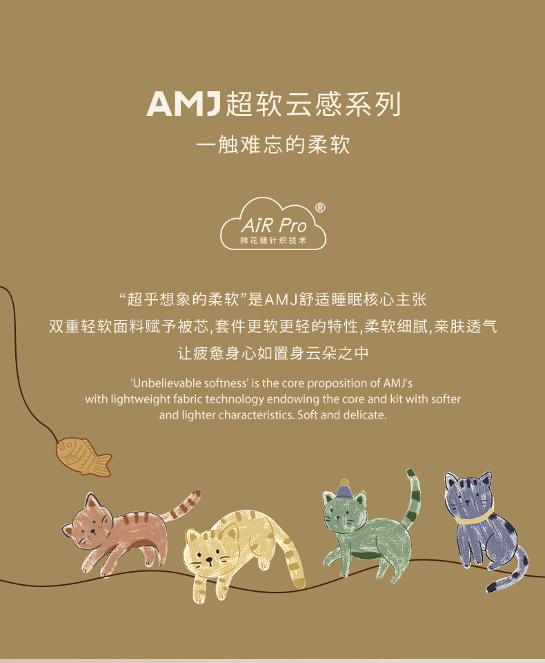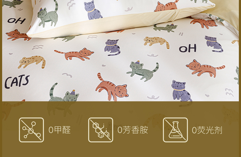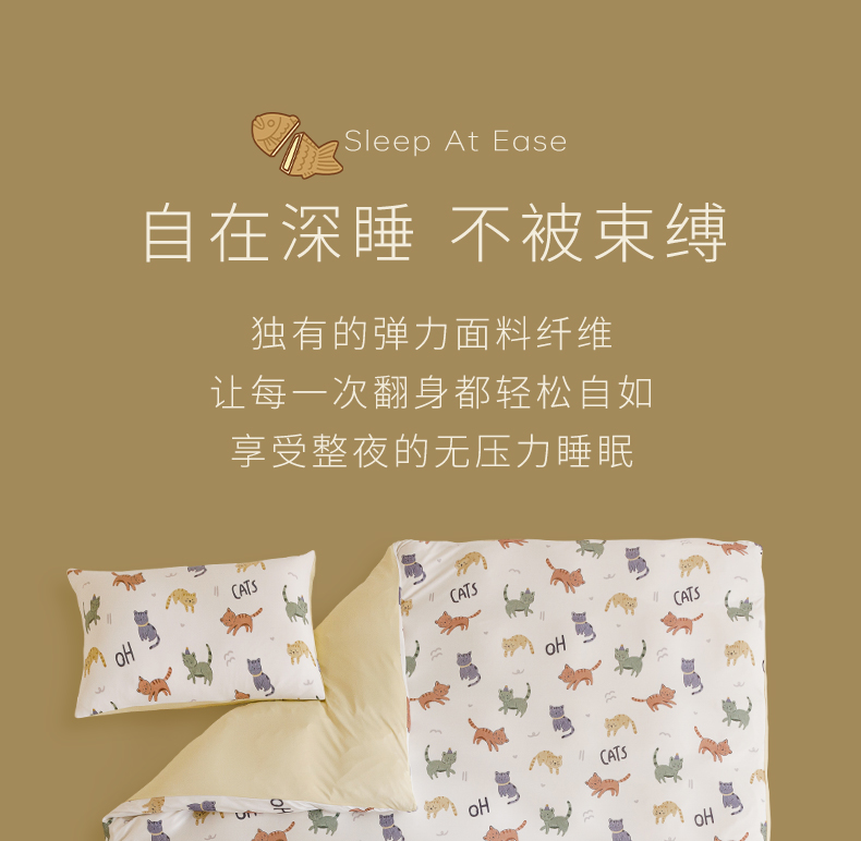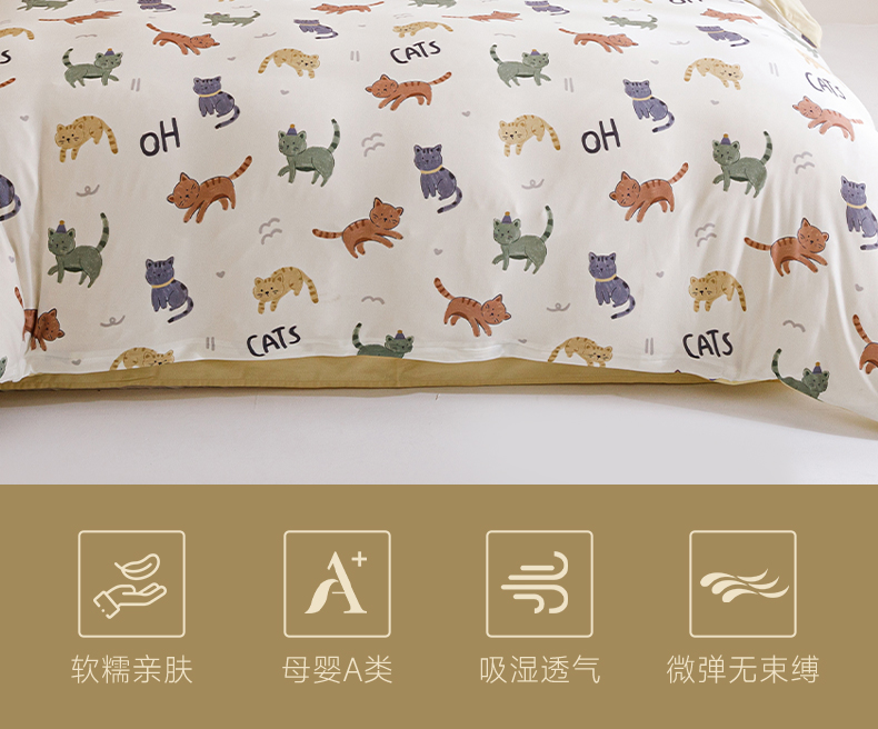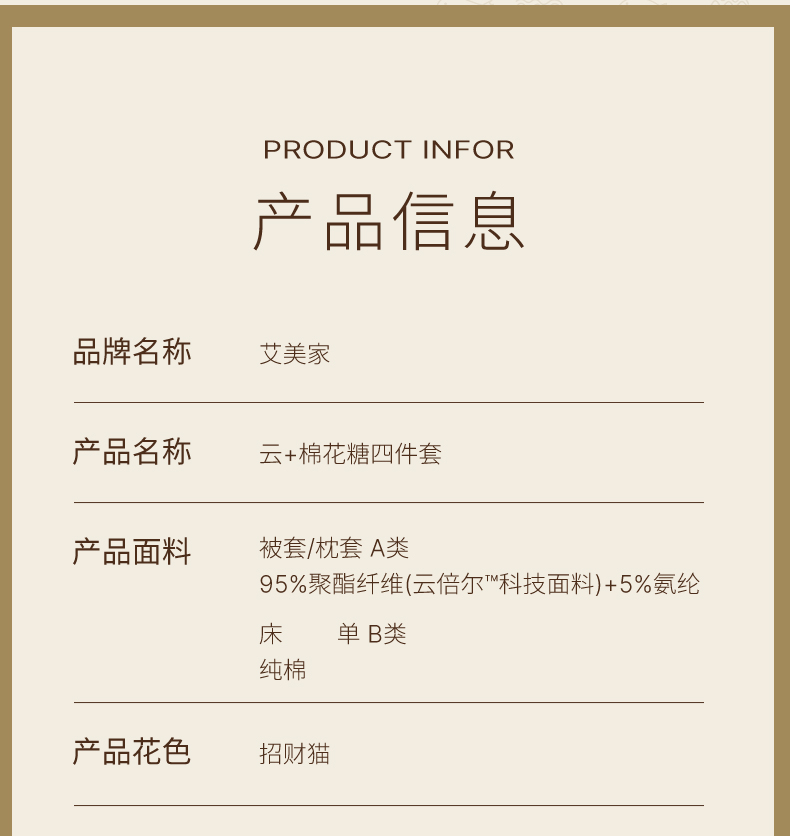 面料:枕套/被套95%聚酯纤维(云倍尔科技纤维)+5%氨纶 床单全棉 四件套 被套:200*230±5cm 枕套:48*74cm*2 床单:240*250±5cm 软,特别软,就是软FUFU~开启云感睡眠新享受,给足睡 眠安全感。面料采用艾美家云感纺纱科技针织织造; ·A类婴儿级,0甲醛,0致癌芳香胺,0荧光剂,适合全家人 睡眠使用。宝宝用好,你用也好; ·简约艺术设计,适应人群及家居氛围广。
