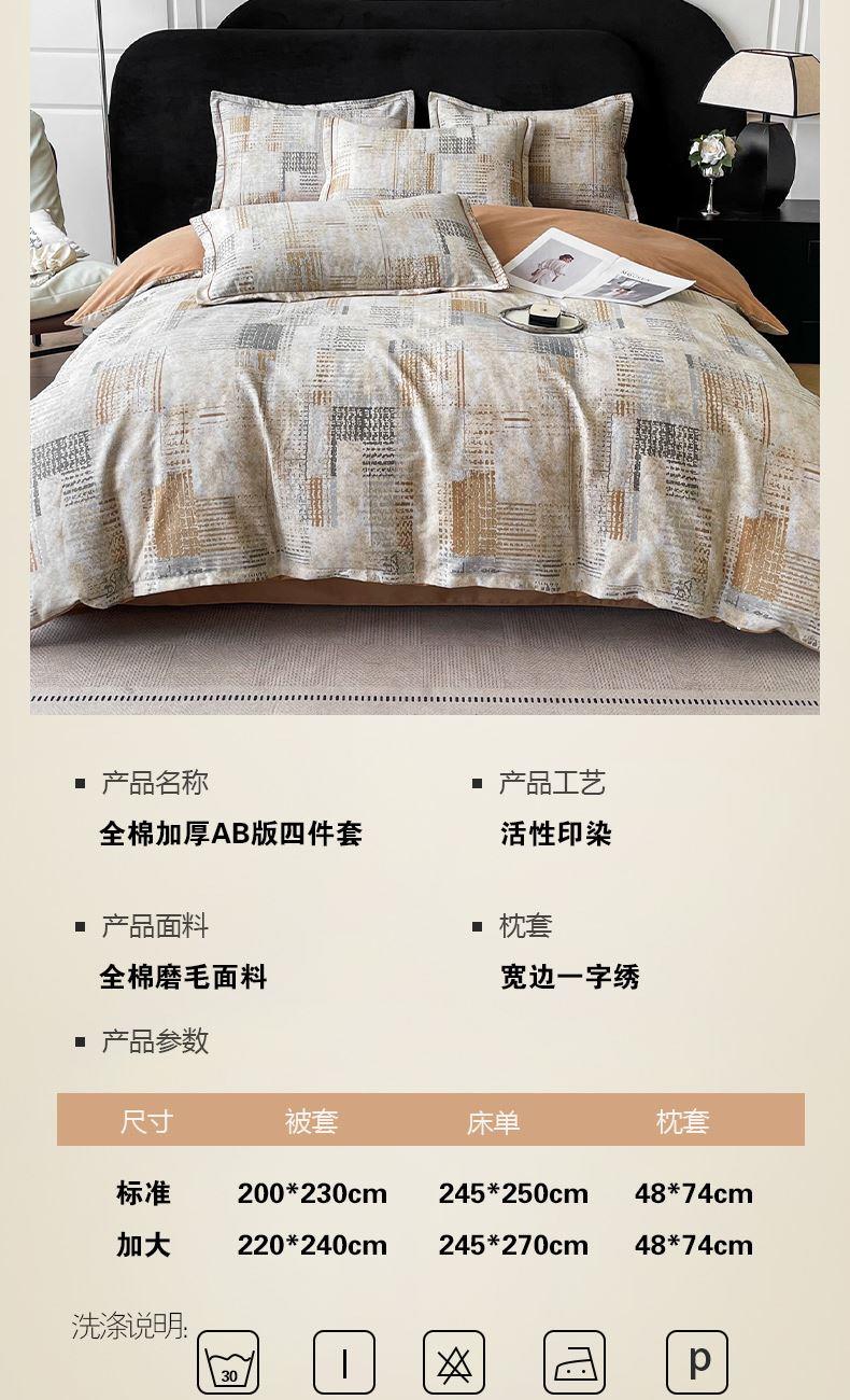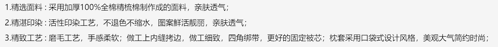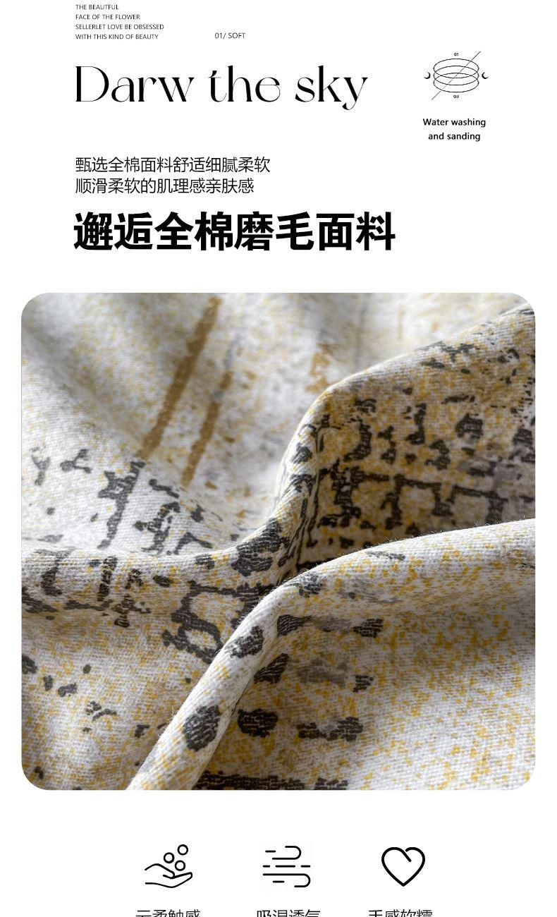 3.精致工艺 : 磨毛工艺,手感柔软;做工上内缝拷边,做工细致,四角绑带,更好的固定被芯;枕套采用口袋式设计风格,美观大气简约时尚;