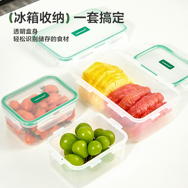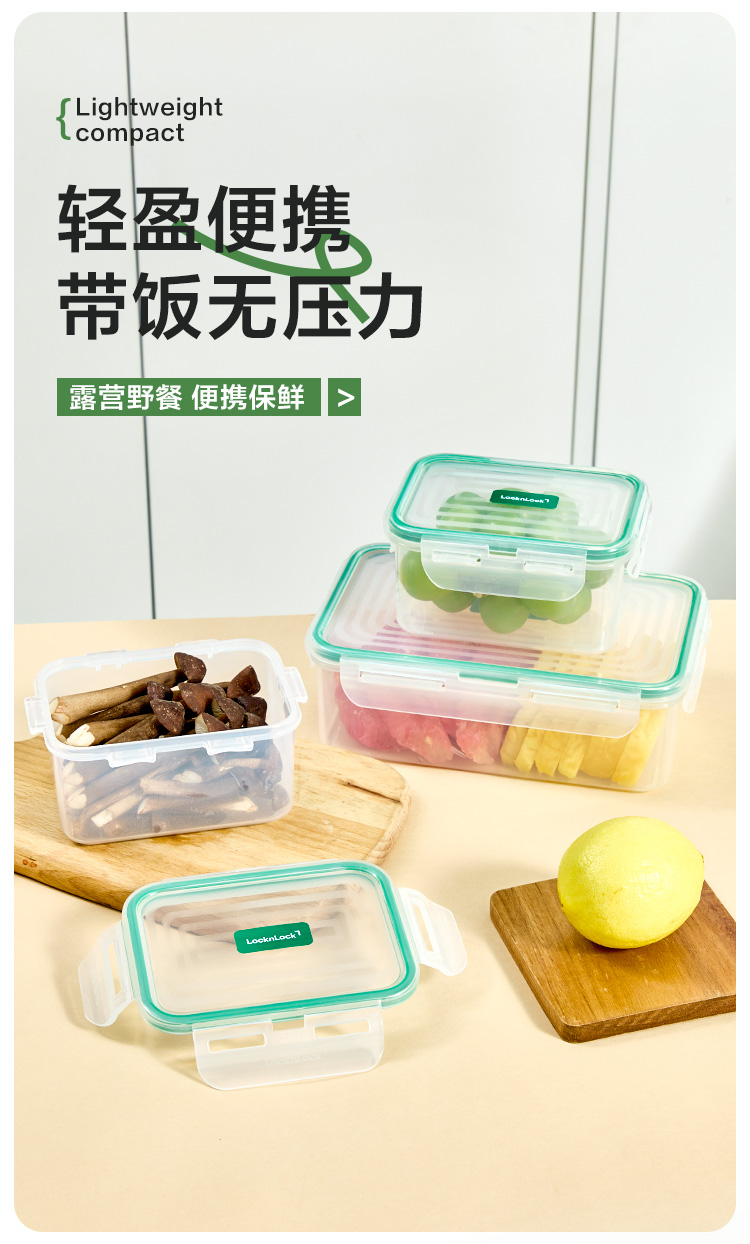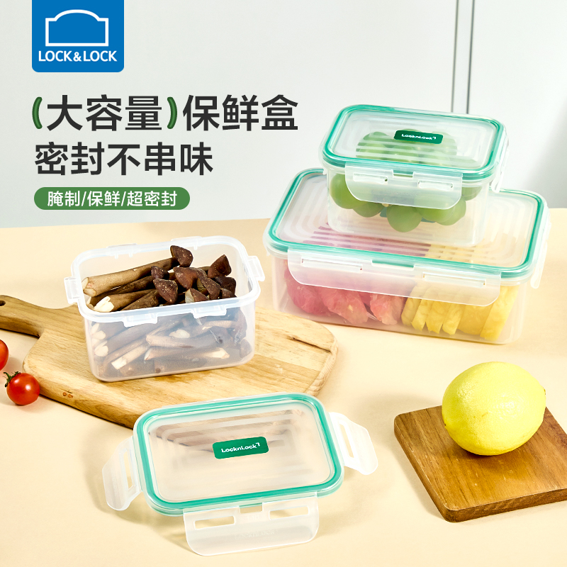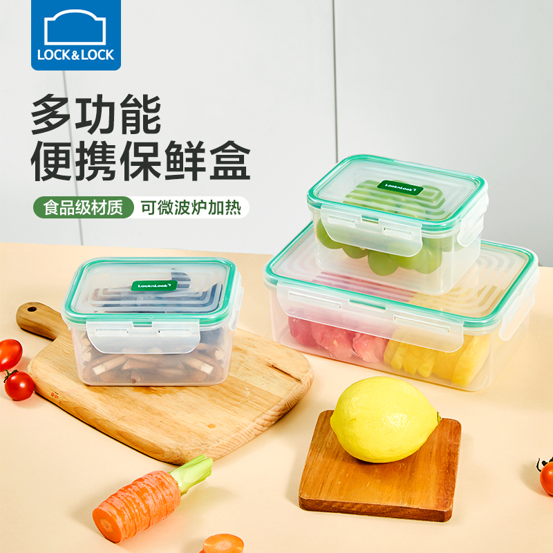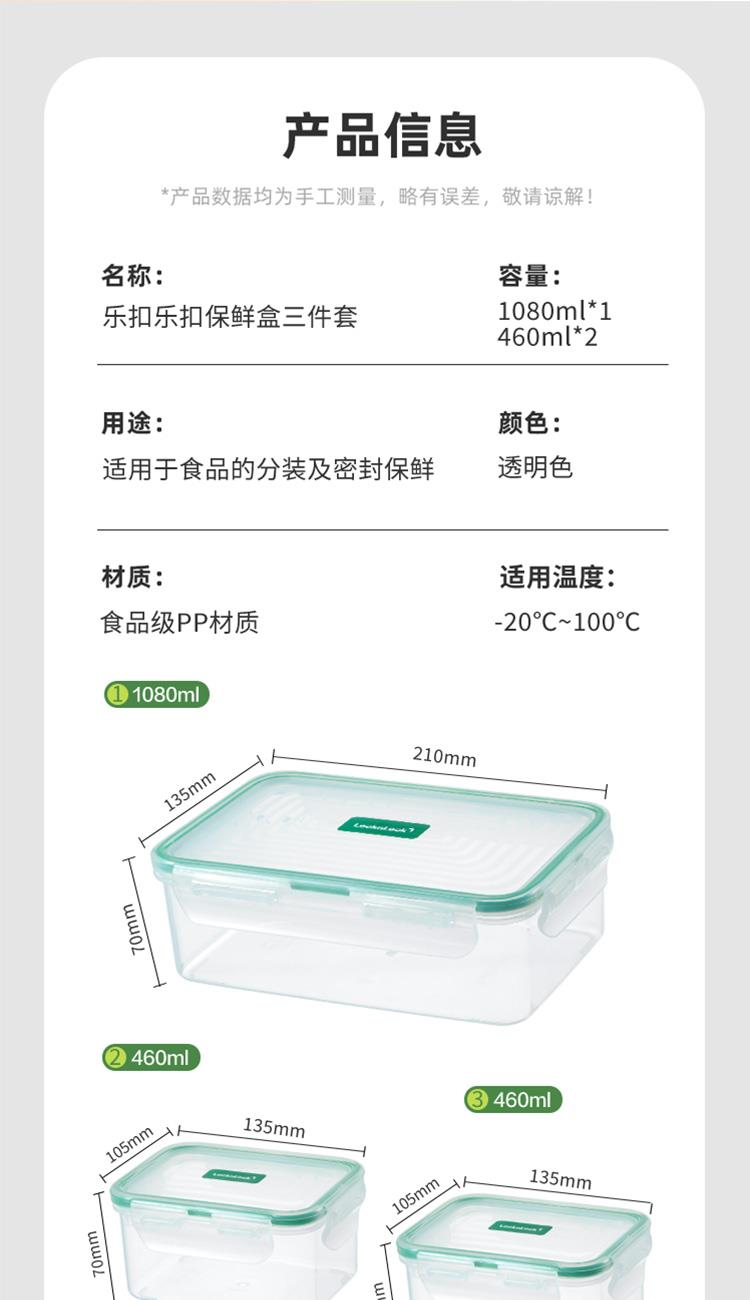 乐扣乐扣保鲜盒3件套 (460ml,135*105*70mm)*2 (1080ml,210*135*70mm)*1 耐热100℃高温,安心健康PP材质。 适用于微波炉、烤箱、冰箱、洗碗机 弯曲扣盖,经久耐用 长久保鲜,四面锁扣,密封性好,有效防止水分流失 健康材质,盒盖采用聚丙烯PP制造,呵护健康,放心使用 硅胶树脂一体式密封圈,保鲜性好