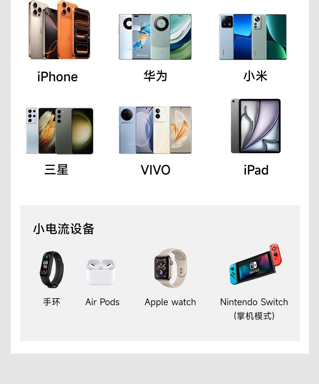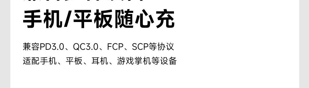兼容PD3.0、QC3.0、FCP、SCP等协议,适配手机、平板、耳机、游戏掌机等设备