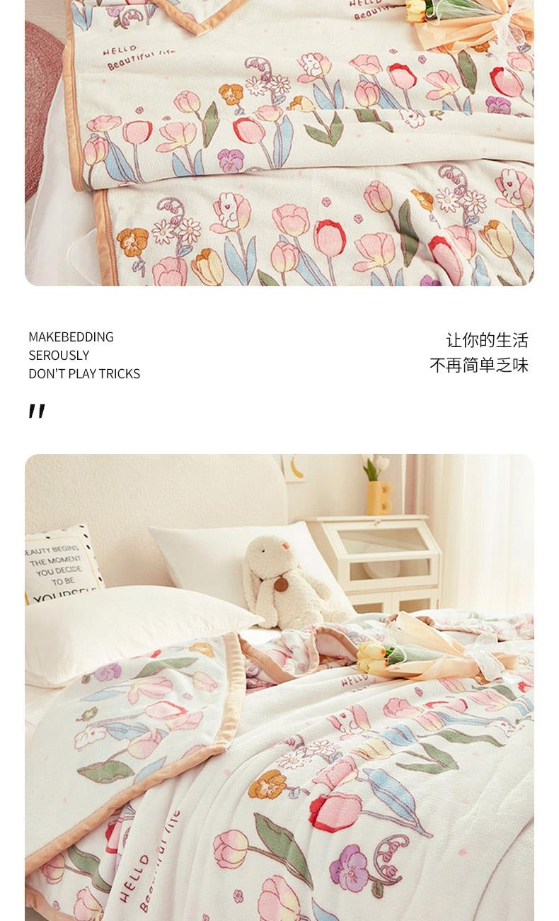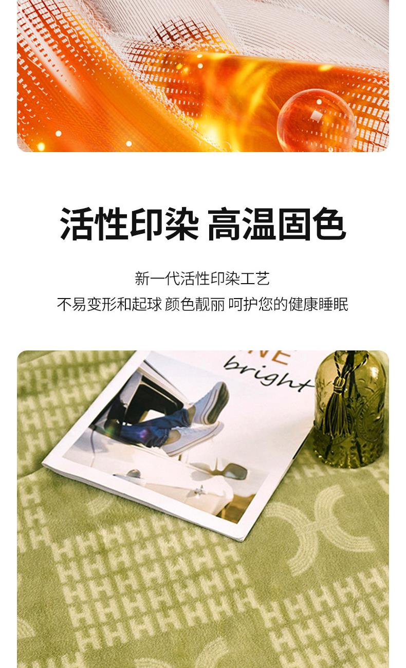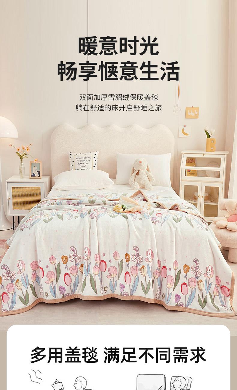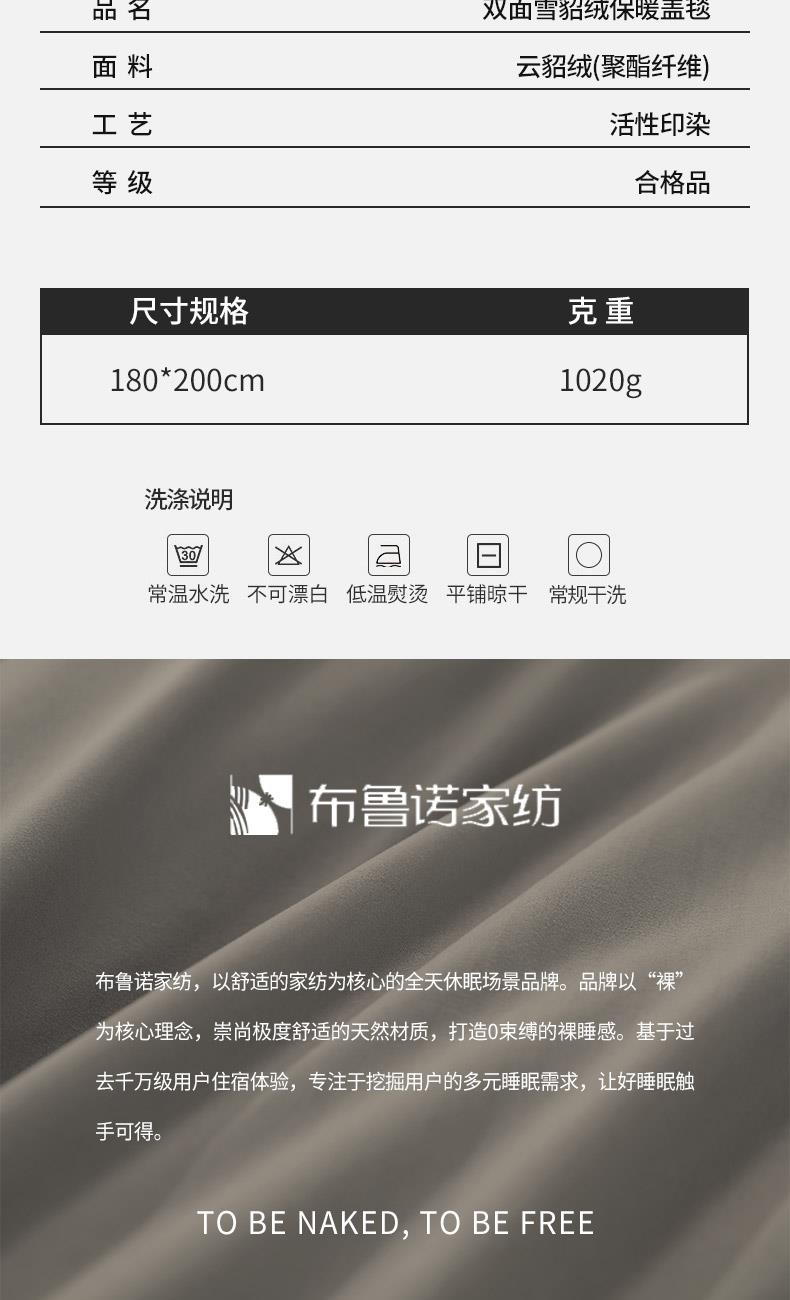 材质:云貂绒(聚酯纤维) 尺寸:180*200cm 产品介绍:1.面料采用A类水洗棉.高支高密,柔软亲肤享受高品质 带来的舒适感 2.触感如脂细腻丝滑,不含任何有害物质, 放心接触更安全双面触感,加宽包边设计更美观.