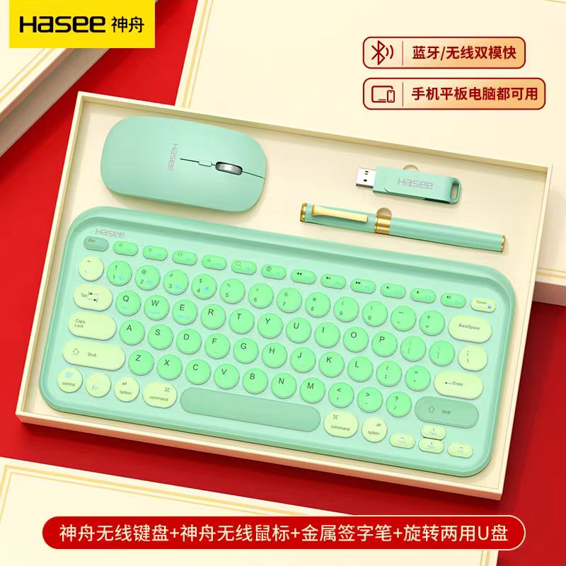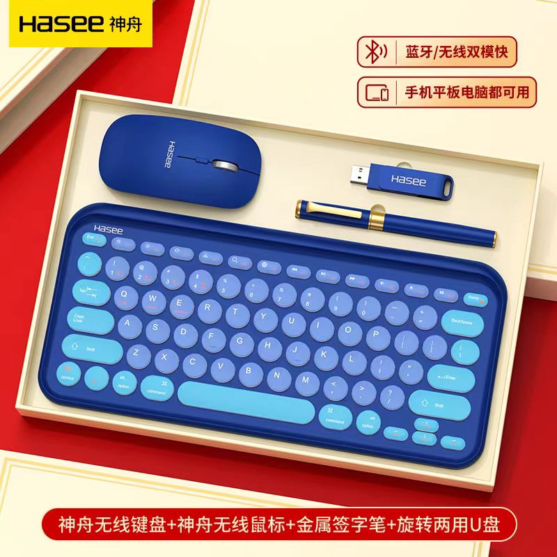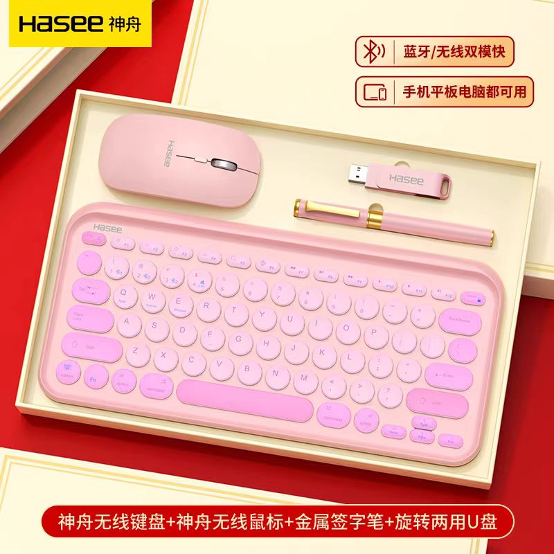 【产品配置】键盘S5+鼠标+u盘+笔 【产品型号】LXX-08 【产品颜色】樱花粉,薄荷绿,宝石蓝 【定制工艺】印刷、雕刻 【包装尺寸】33.4*23.4*3cm