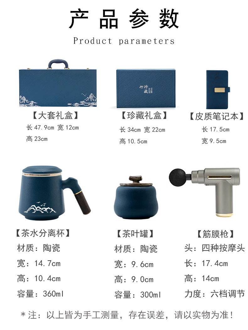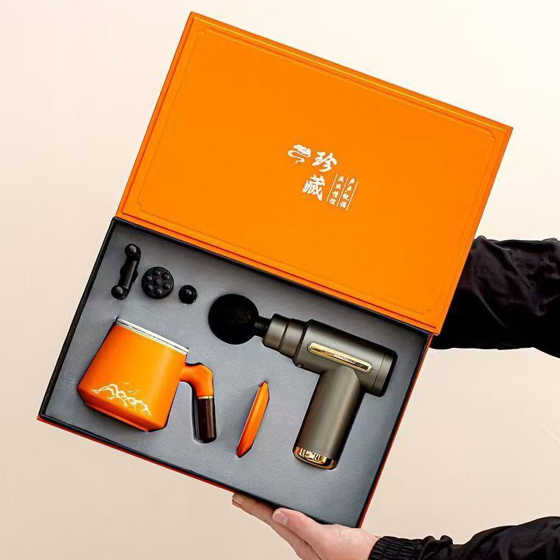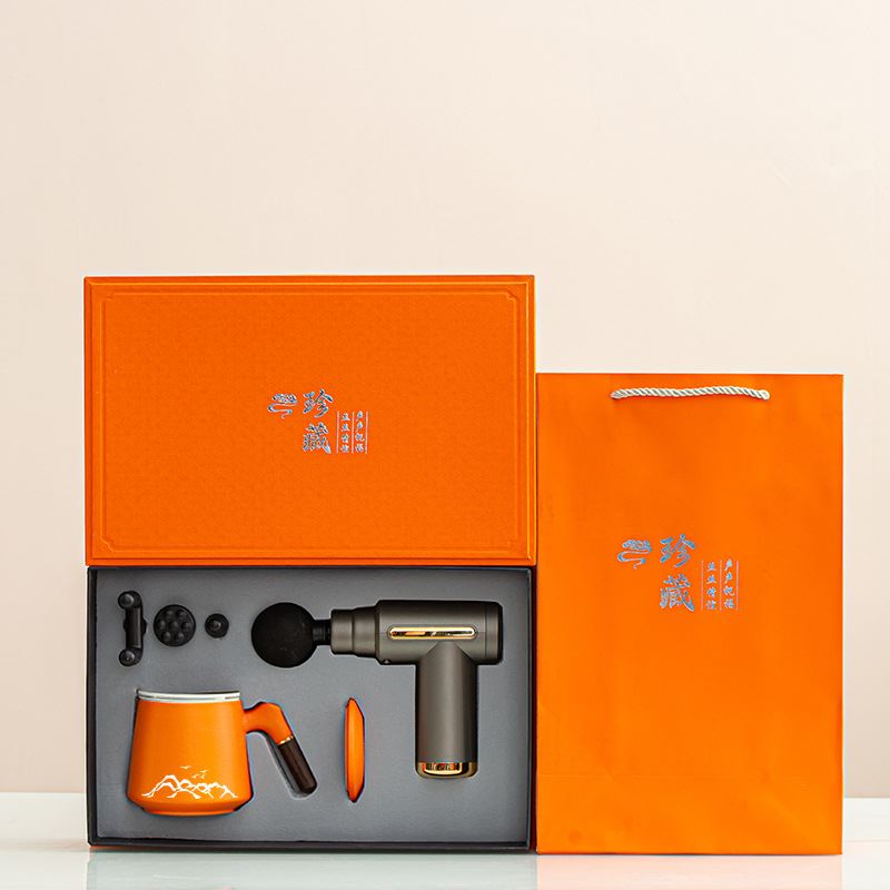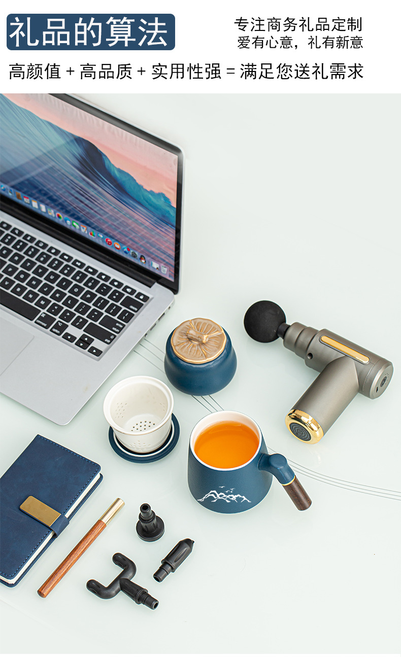 配 制: 1办公杯 1筋膜枪/颈椎仪 1锦盒 手提袋 规格: 办公杯14.5*10.4cm 礼盒38.2*11cm 筋膜枪:17.4*14cm 工艺:商务实用性礼品,上班族刚需产品。粗陶办公杯,带茶漏,专业级筋膜枪,6档变速,4种按摩头,液晶触屏,深度缓解肌肉酸胀。。