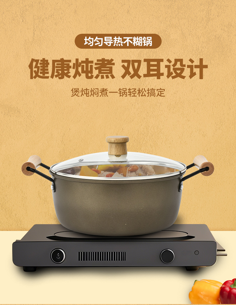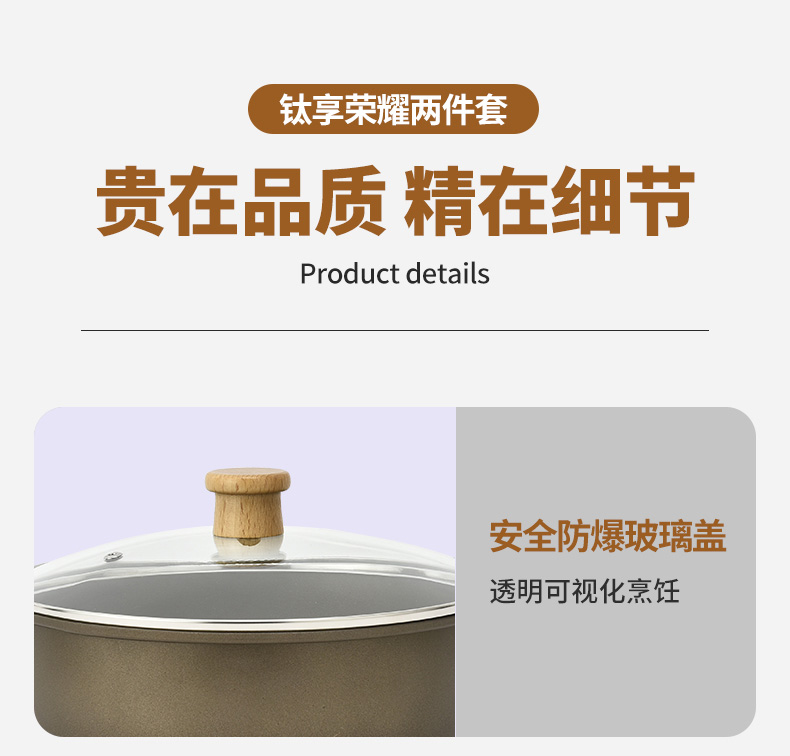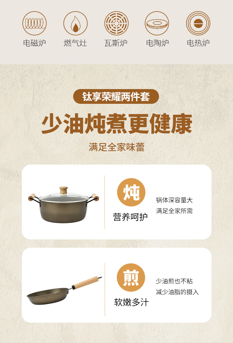 规 格:24cm+24cm 材 质:精铁 包装尺寸:34*15*34cm 锅体采用优质精铁材质,锅底悬浮节能复底技术高温熔喷钛工艺,去除锅体内杂质,使锅体延展性、耐烧性、传热性更强; 表面高温熔钛技术,0氟0涂层不粘技术,使用不粘锅省心省力; 大容量汤锅与煎炒锅组合,给烹饪带来方便; 防爆浮法可视盖子,蒸食物空间更大,锅内情况一目了然,盖珠为柽木防烫材质。手柄榉木材质,可拆卸防烫手设计,环保更健康