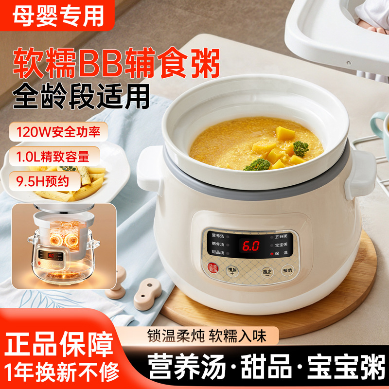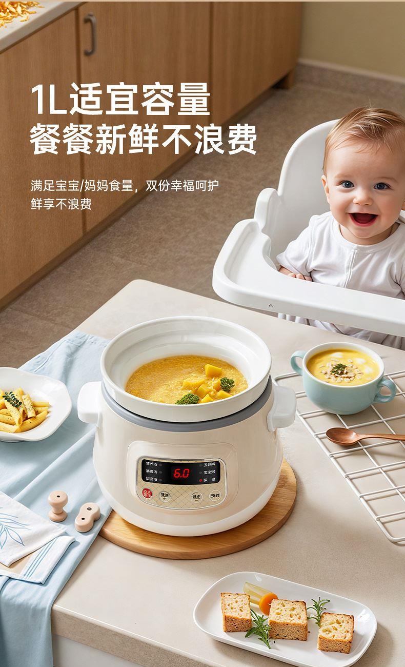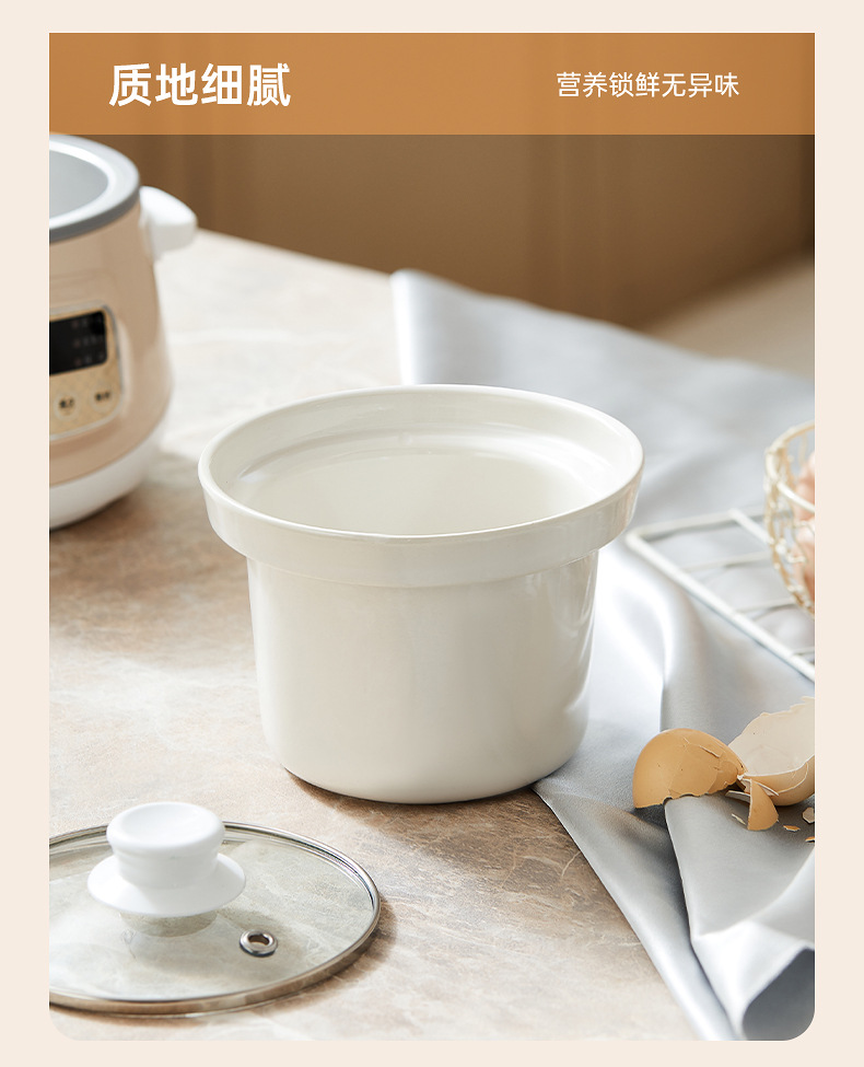 额定功率:120W 额定电压:220V 产品颜色:少女粉粉/天空蓝蓝/魅力杏 主机容量:1L 产品款式:微电脑智能 包装清单:主机、透明盖、蒸格、电源线、说明书 特色功能 1、智能免看管;可视化锅盖,白瓷内胆; 2、6大功能,可预约定时;铝锅发热盘,导热快; 3、PP防烫把手,防止防烫双手; 4、自动断电,防干烧功能;一机多用;