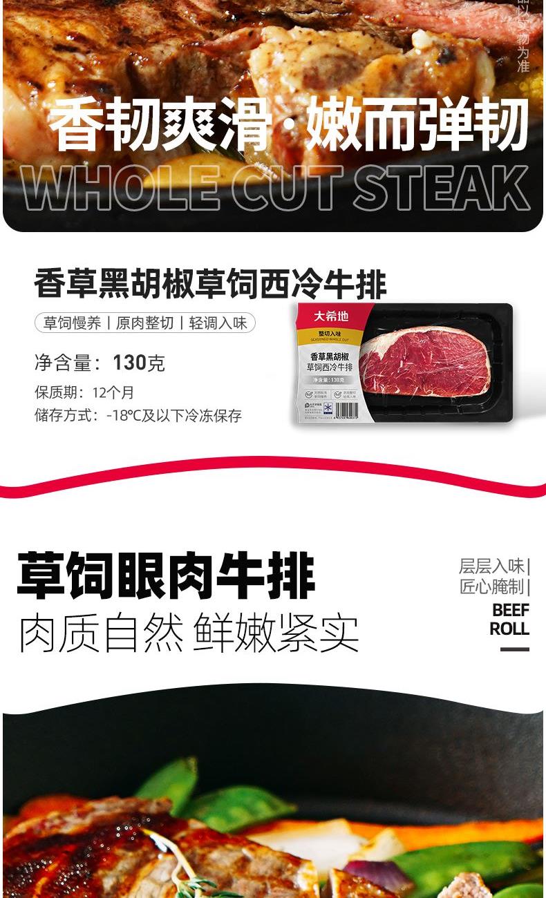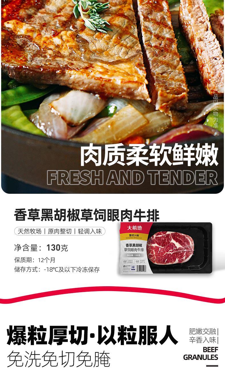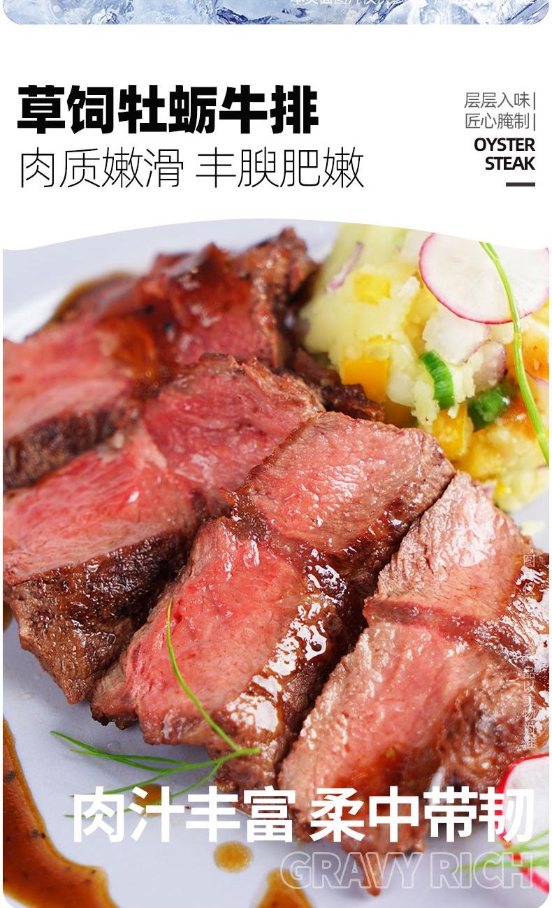 产品参数配置 香草黑胡椒草饲牡蛎牛排:150g,贴肤装,2 片装 香草黑胡椒草饲西冷牛排:130g,贴肤装 香草黑胡椒草饲眼肉牛排:130g,贴肤装, 大一统整切菲力牛排:130g(单份),2 片袋装 撒娇牛肉粒:250g,贴肤装。 2. 产品卖点说明 牛排系列:包含牡蛎、西冷、眼肉、菲力等多种经典部位,品类丰富,能满足不同口感需求。自带风味,简化烹饪流程,适合家庭快速制作。部分牛排多次出现,可满足批量采购需求。