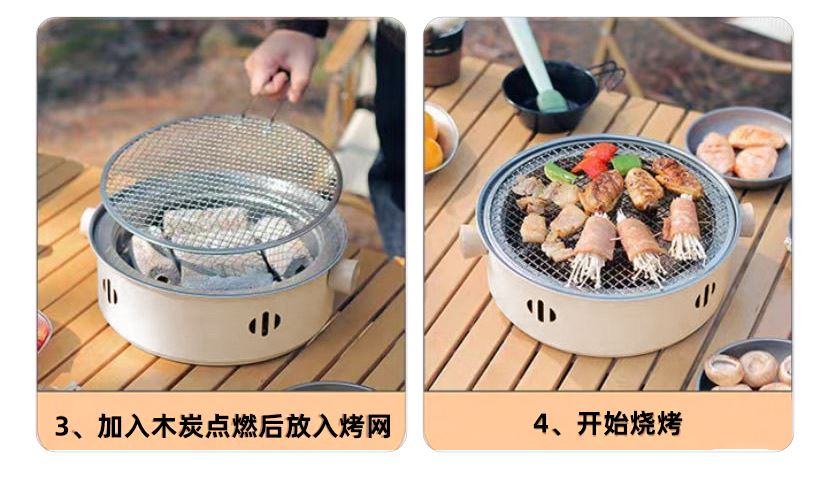 材质 碳钢 颜色 奶白 尺寸 28*10cm(围炉直径28cm高10cm) 重量 净重0.6kg 毛重0.8kg 烤面 烤网直径26.5cm 加密烤网结实耐用 四周多个通网口,快速升温均匀导热 可分离设计安装简易 方便存取 实心木制手柄隔热方便提拿