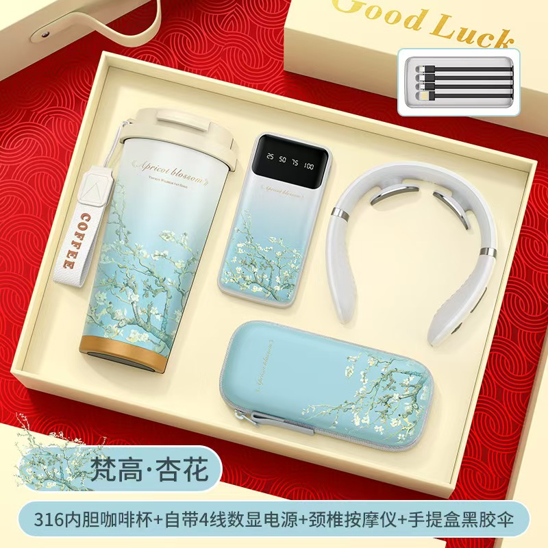 【产品配置】铃兰杯+按摩仪+伞+电源 【产品型号】K-08 【产品颜色】紫薰衣草,蓝玫瑰,绿梵高,金玉兰花,黑再攀高峰 【包装尺寸】40.5*30*10cm 【定制工艺】 印刷、雕刻