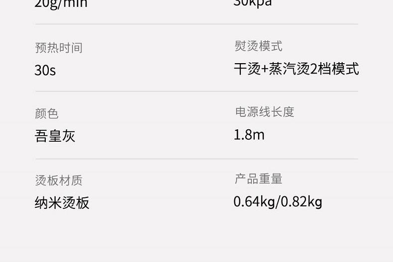 额定功率:1200 出气时间:30s 蒸汽量:16g/min 电源线长:1.8M 支撑方式:手持 产品净重:0.64 档位选择:一档 水箱容量(C):120mL 1. 1200W大功率,预热时间快,持续澎湃蒸汽,达到快速渗透衣物定型的效果 2. 不锈钢面板,丝滑不粘衣,预热均匀,熨烫效果更优 3. 多种熨烫方式,平烫强力定型、挂烫高效除皱,一机搞定 4. 四季衣物皆可熨,多种材质随心烫,满足用户各种需求