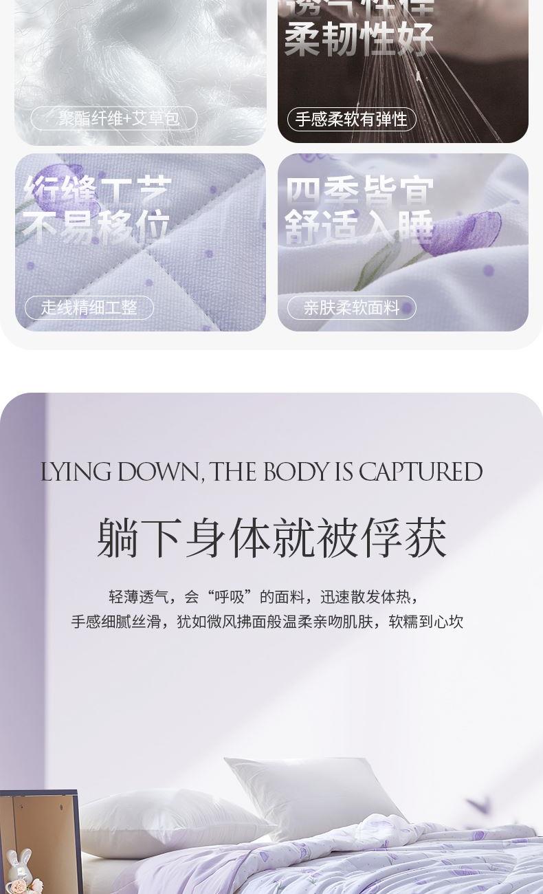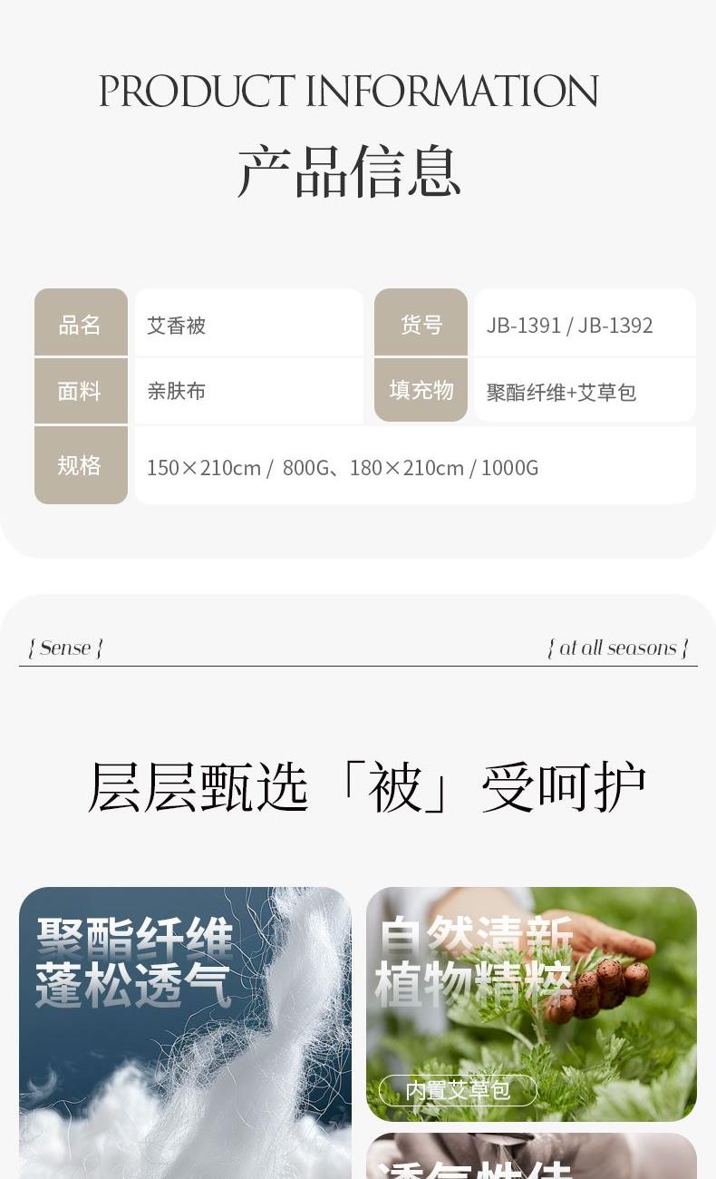 货 号:JB-1392 规 格:180×210cm 面 料:亲肤布 填 充:聚酯纤维+艾草包 克 重:1000G 淡淡艾草香 清新入眠 艾草是天然植物、默默无“蚊”过夏天、伴着清香、闭目养神。采用超细纤维为原材精致而成、冬暖夏凉、吸湿透气、呵护睡眠、适合空调房使用