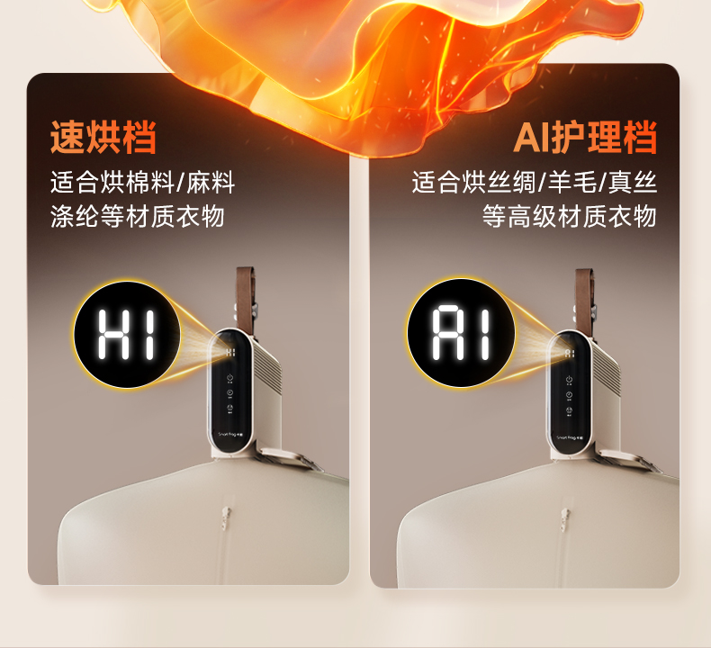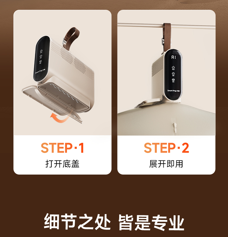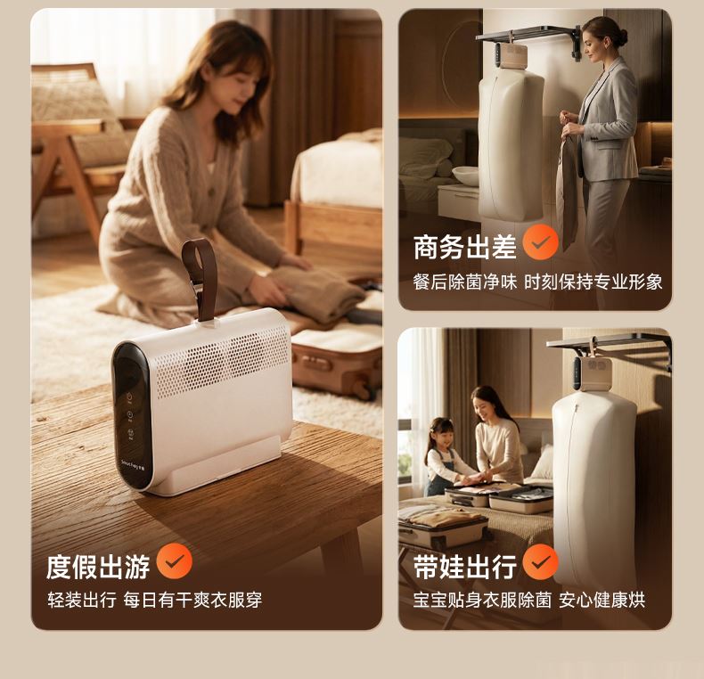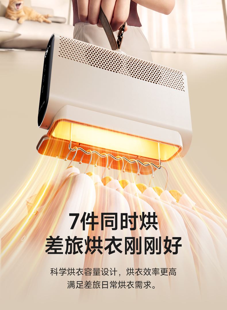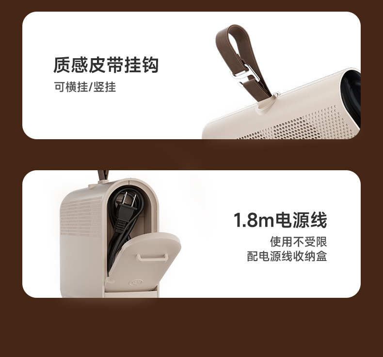 搭配两档干衣模式,1档强力档,2档智能档UV 1-8H定时随心设定 可旋转的皮带挂钩,方便安装悬挂,双八显示 电源线和布罩,轻松一体收纳,一提就走