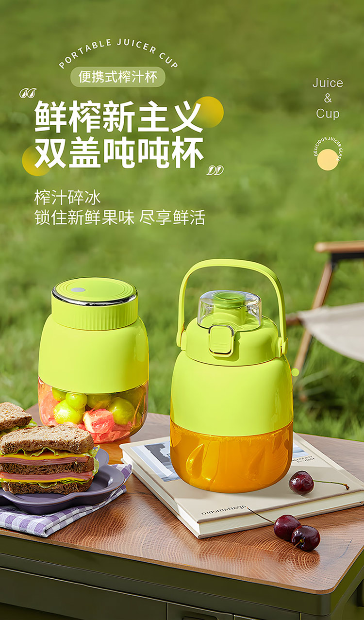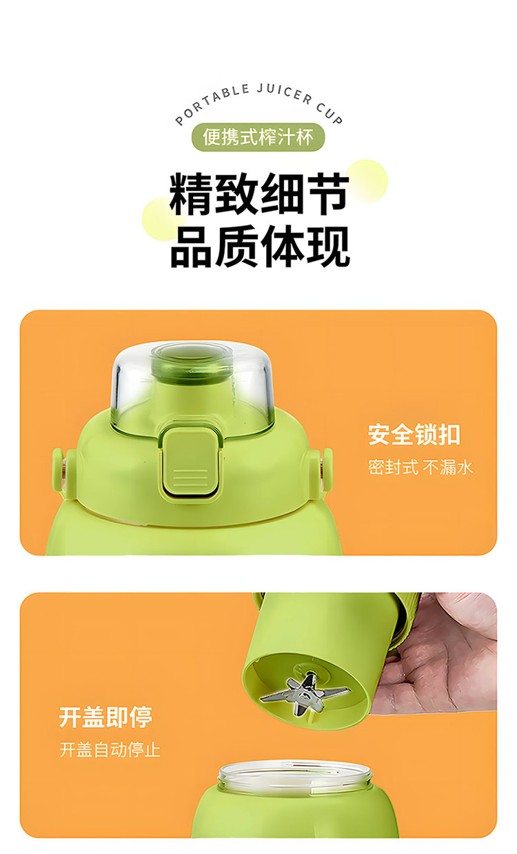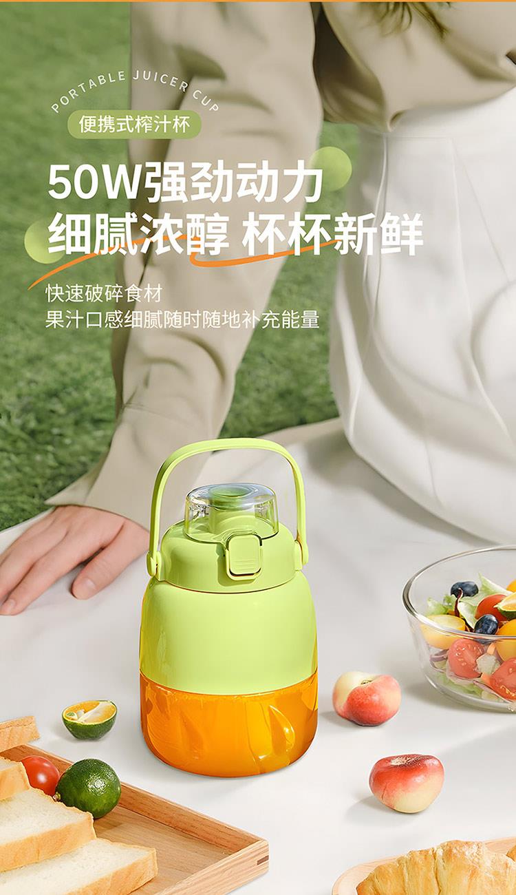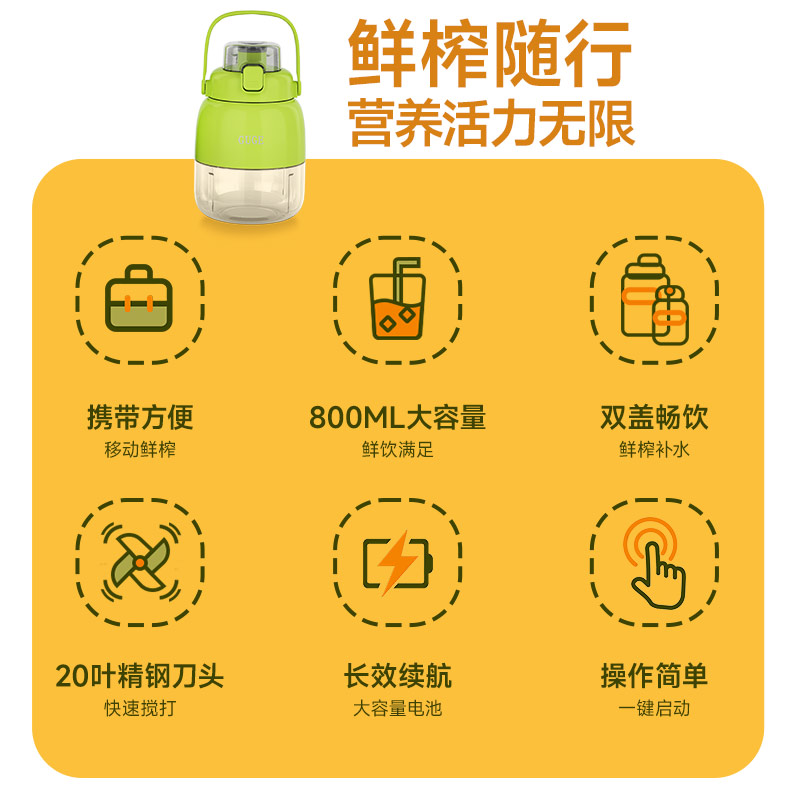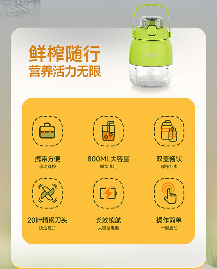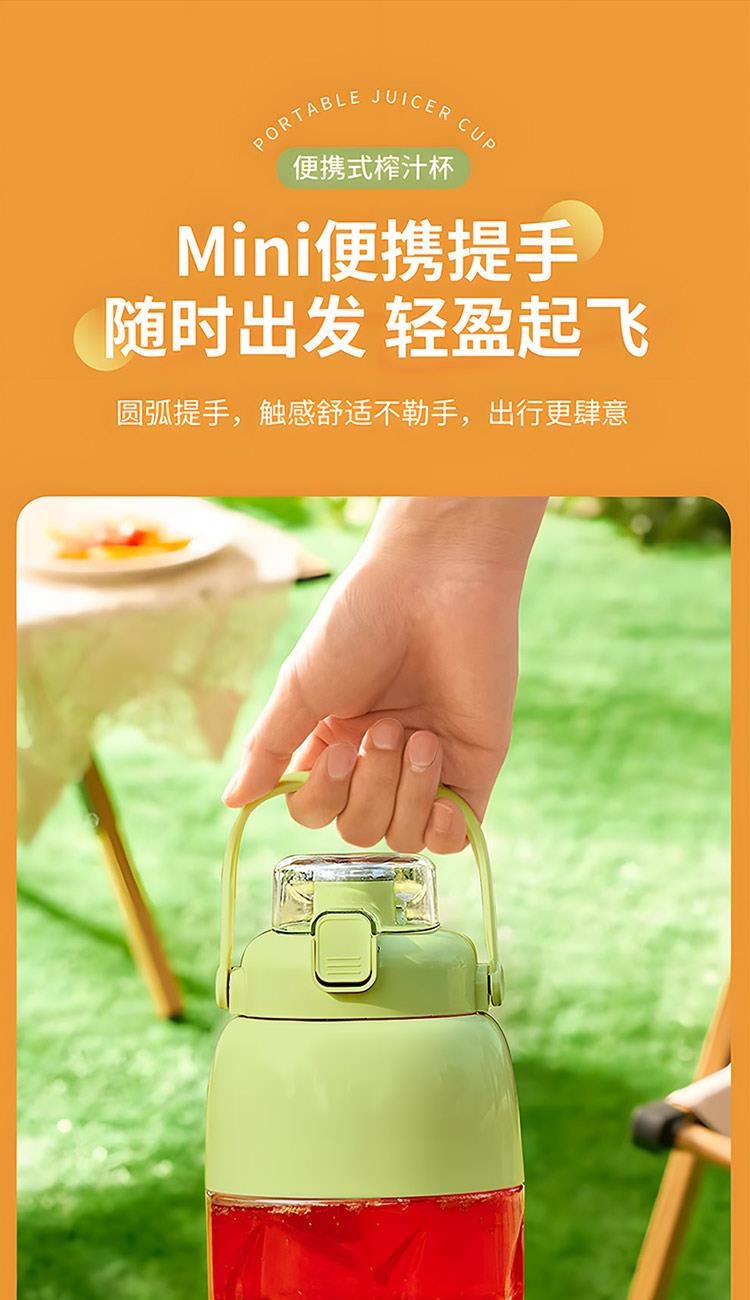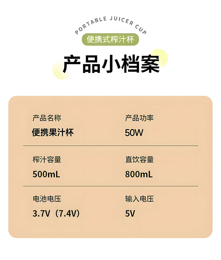 产品功率:50W 榨汁容量:0.5L 直饮容量:0.8L 电池电压:3.7V 输入电压:5V 额定电压:220V 产品尺寸:205*230*430mm 包装方式:提手彩盒+邮箱 ● 双盖随心换榨汁直饮二合一。 ● 800ml大肚量,畅享不续杯,专属水分补给站。 ● 现榨鲜喝,精钢利刃均匀搅碎,打出细腻口感。 ● 20叶精钢刀头,搭载强劲电机。 ● 50W强劲动力,Type-C快充。 ● 2600mAh,大电量续航。 ● mini便携提手,随shi出发,轻盈起飞