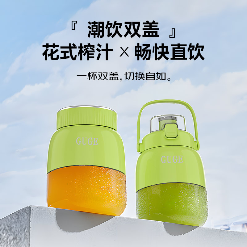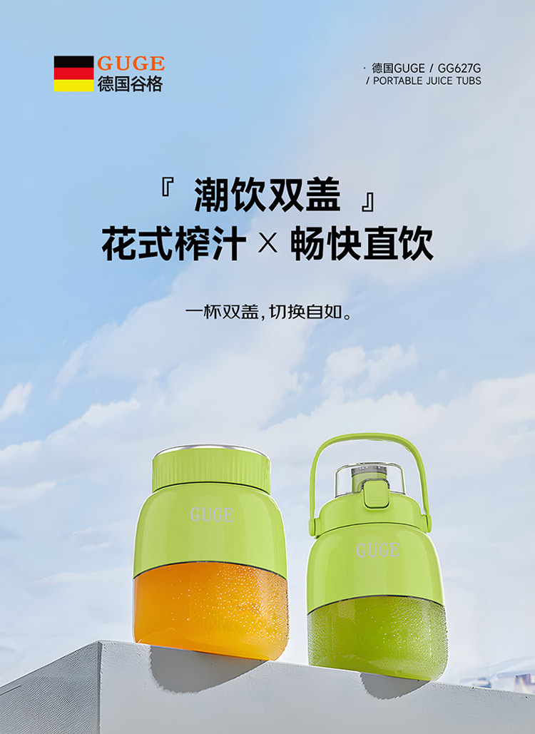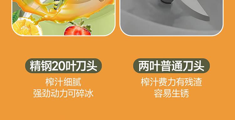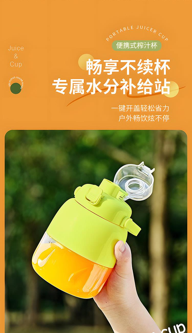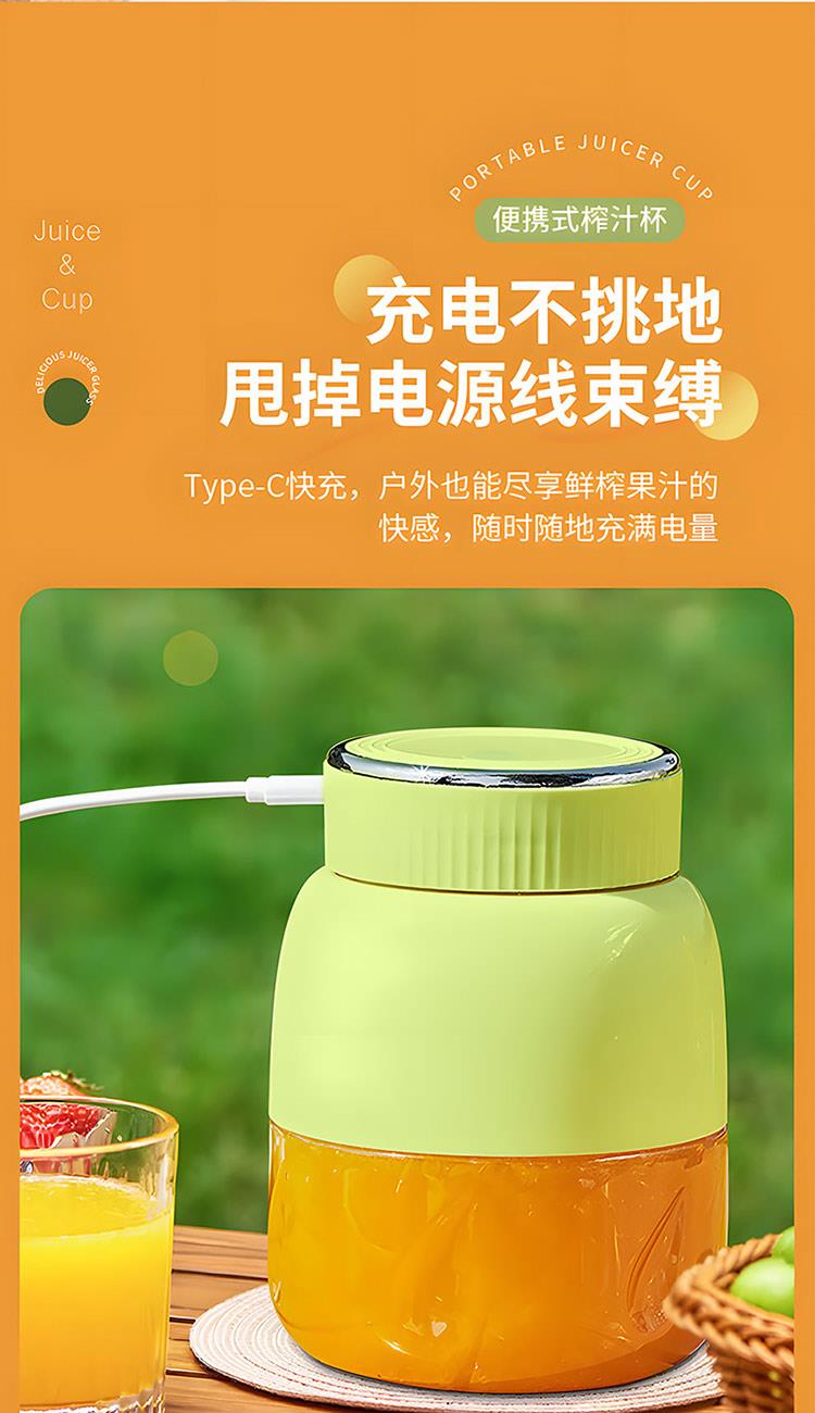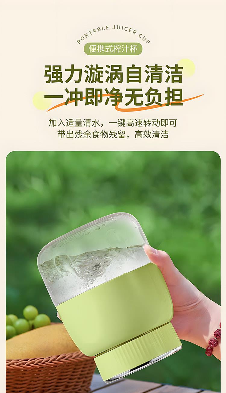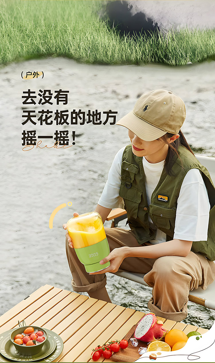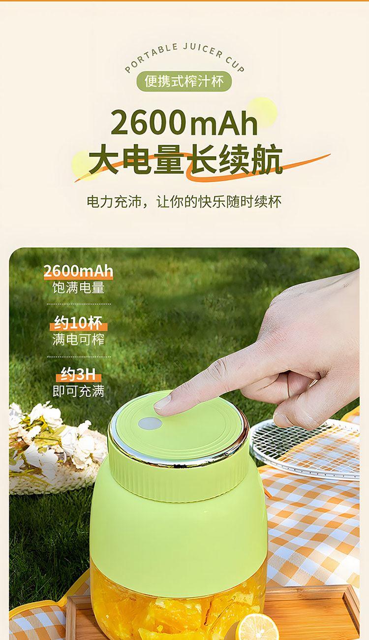产品功率:50W 榨汁容量:0.5L 直饮容量:0.8L 电池电压:3.7V 输入电压:5V 额定电压:220V 产品尺寸:205*230*430mm 包装方式:提手彩盒+邮箱 ● 双盖随心换榨汁直饮二合一。 ● 800ml大肚量,畅享不续杯,专属水分补给站。 ● 现榨鲜喝,精钢利刃均匀搅碎,打出细腻口感。 ● 20叶精钢刀头,搭载强劲电机。 ● 50W强劲动力,Type-C快充。 ● 2600mAh,大电量续航。 ● mini便携提手,随shi出发,轻盈起飞