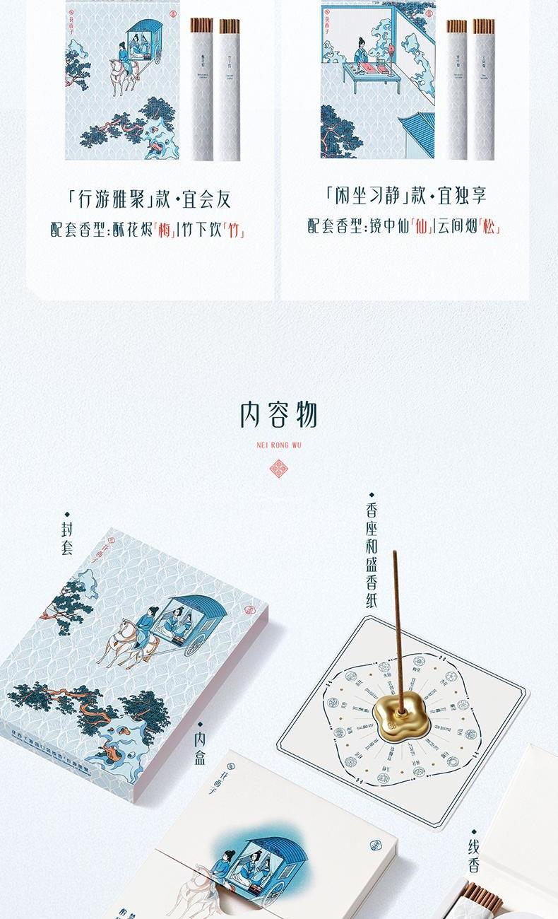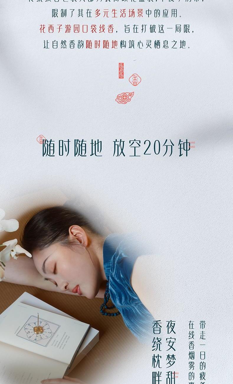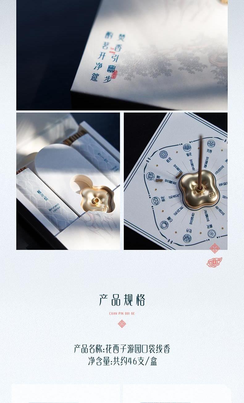 规格:46/盒 卖点: 1.传统线香包装大都为长简或礼盒装,不便于携带,限制了其在多元生活场景中的应用。 2.花西子游园口袋线香,旨在打破这一局限,让自然香韵随地构筑心灵栖息之地。