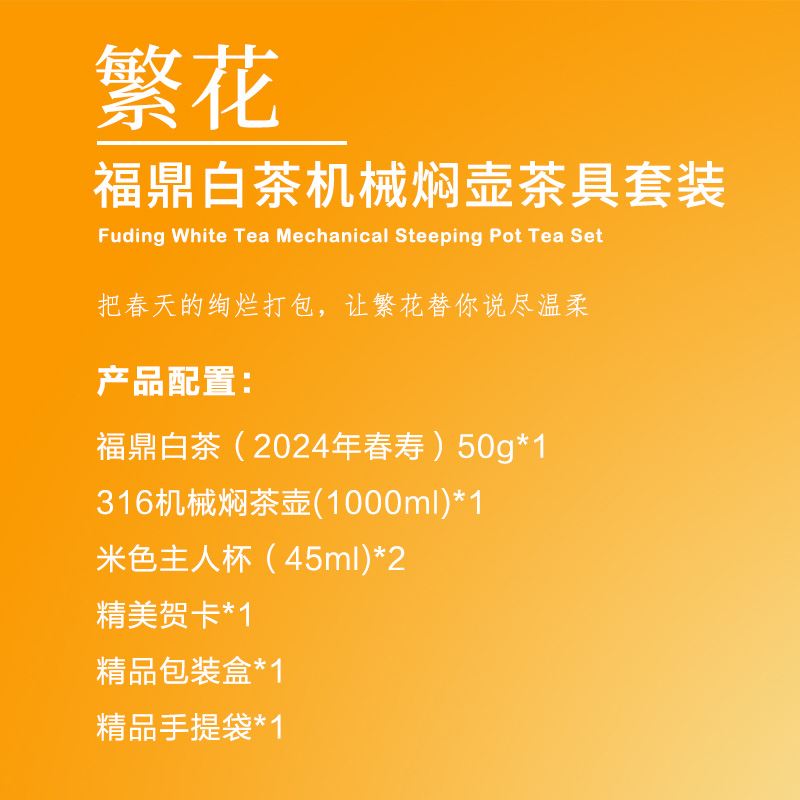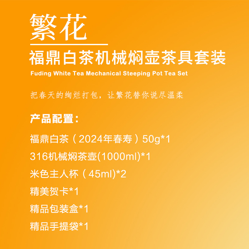 【产品配置】 焖泡壶*1 茶杯*2 福鼎白茶*1 礼盒*1 礼袋*1 【产品说明】 精致艺术礼盒,印象派油画烫金设计,适用于商务节日赠礼; 智能焖茶壶,316不锈钢一键焖泡,大容量可控温; 福鼎春寿眉白茶,核心产区老树茶,越存越醇香; 全套精致配件,主人杯+礼盒手提袋,开箱即用; 采用焖泡技术,充分释放白茶甘醇,每一口都是春天滋味。