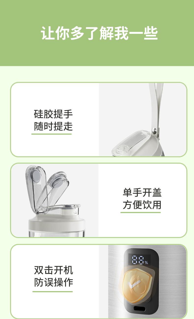 单手开盖设计,加高直饮口,无需吸管,饮用更方便;加配底部外带盖,出门无需携带机头,更轻便;