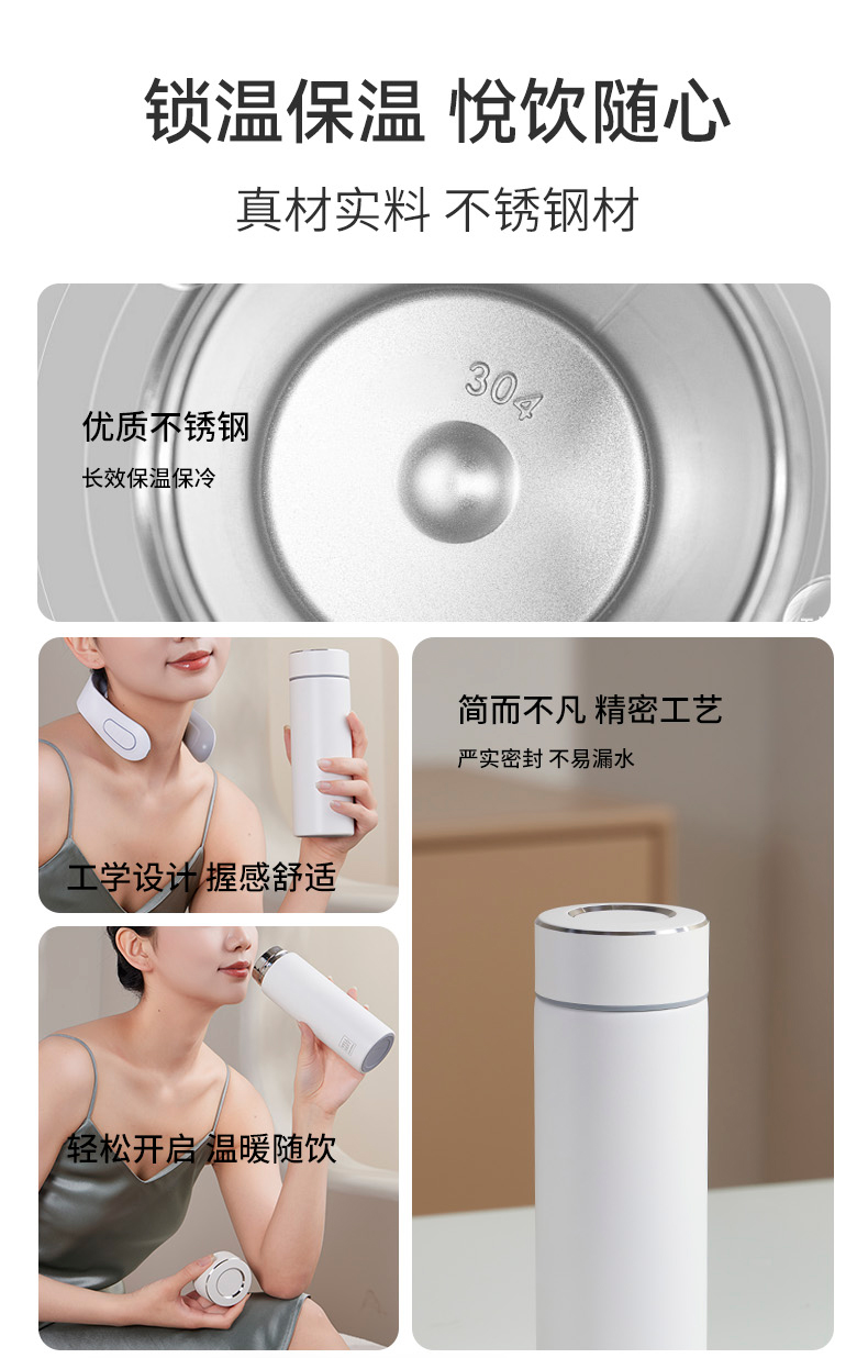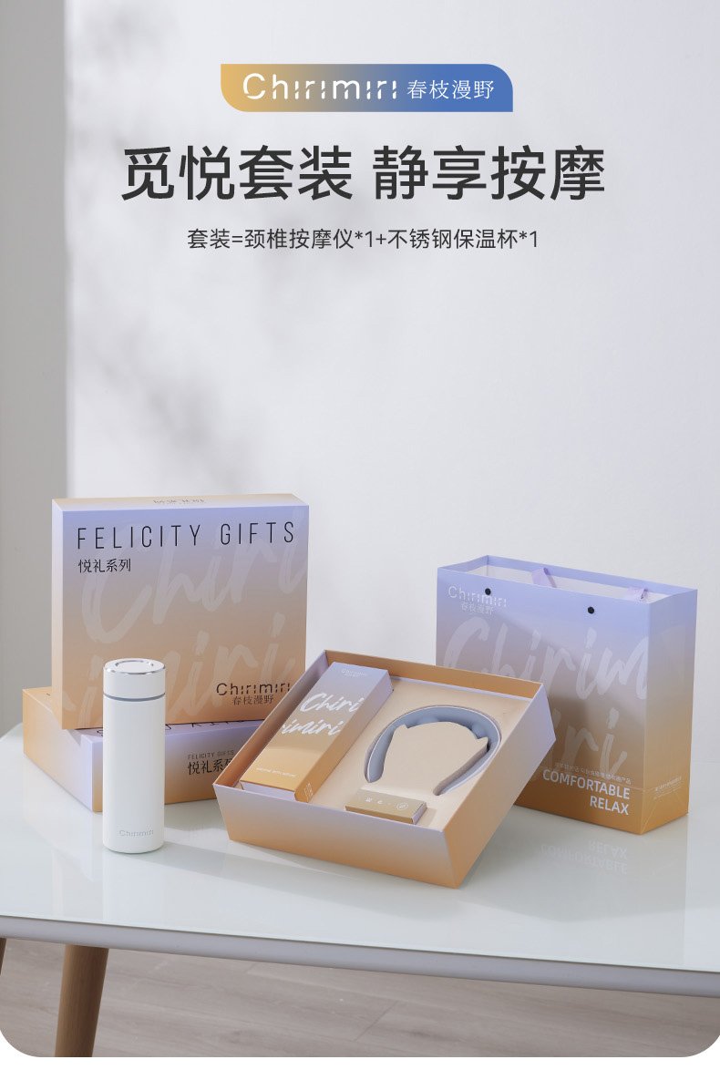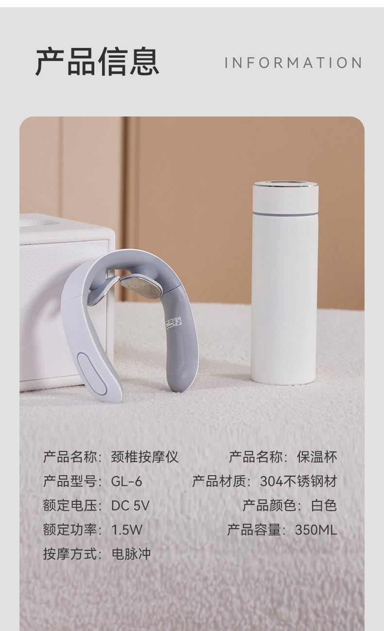 智能颈椎按摩仪: 微电流脉冲按摩,助力每日元气满满 人体工程学设计,给你更好的体验 重新定义EMS智能微电技术 轻巧便携,走到哪按到哪儿 水杯: 轻奢时尚,简印有型 双层真空,防止温度流失 长效保温,全天候的温暖护航 密封设计,倒置不漏 精致茶隔,饮茶伴侣