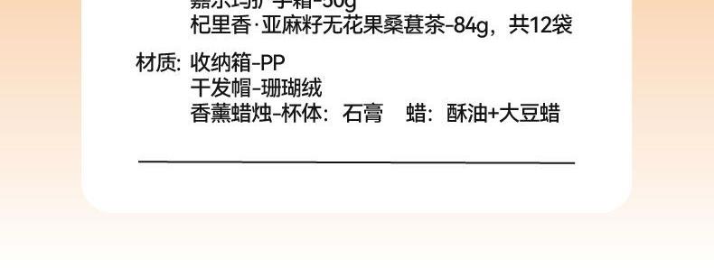 在宇宙的秩序里,每一颗星都有其轨迹与光芒 而你,无需被定义,也不必总在照亮他人 愿你在这属于自己的节日里,拥抱那份「我即光芒」的笃定 不只为今天,更为每一个你选择闪闪发光的昼夜 内配: 配置一:收纳箱x1 配置二:干发帽x 1 配置三:香薰蜡烛x1 配置四:嘉乐玛护手霜x1 配置五:杞里香·亚麻籽无花果桑葚茶x12