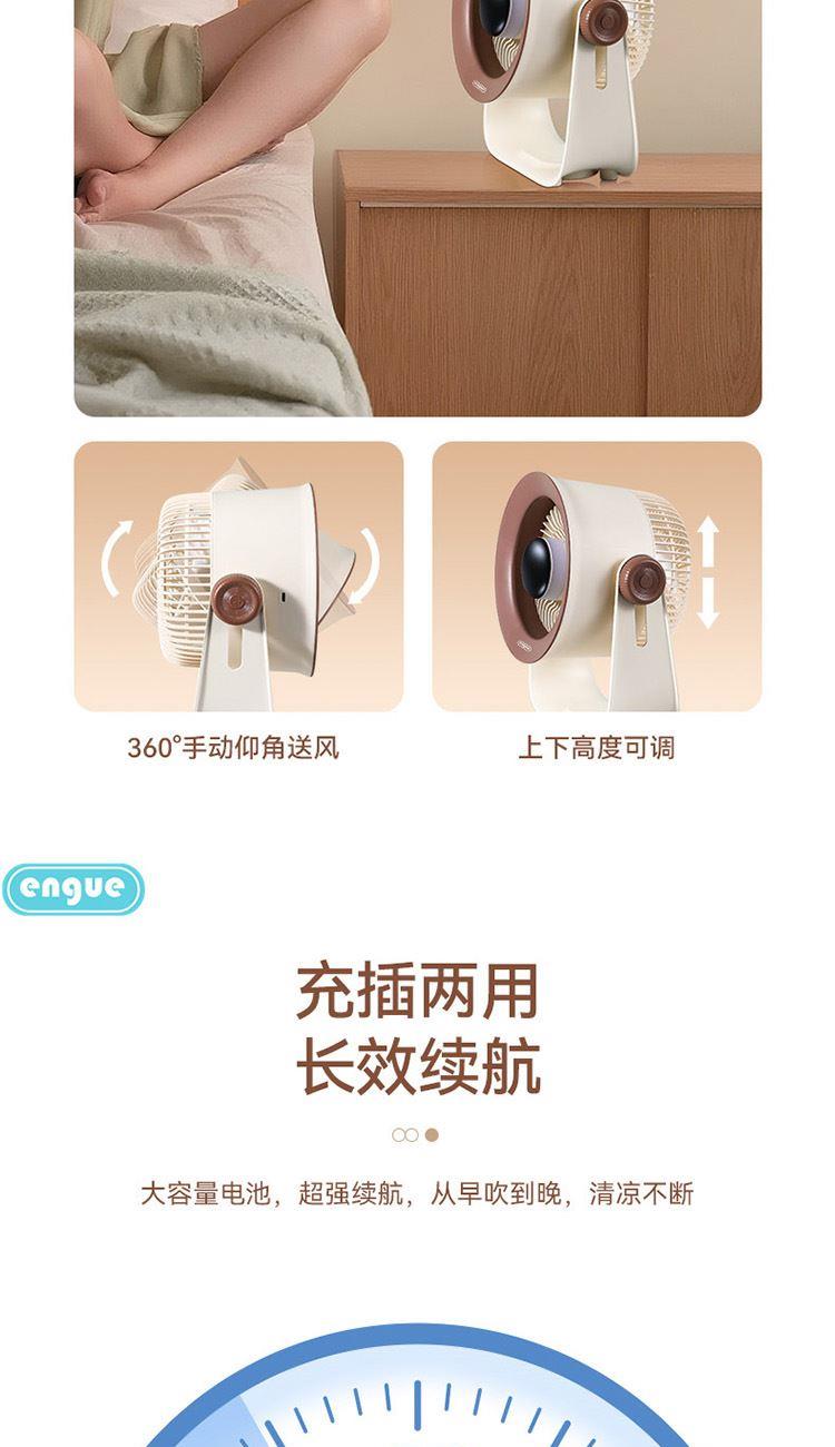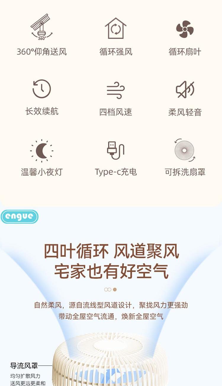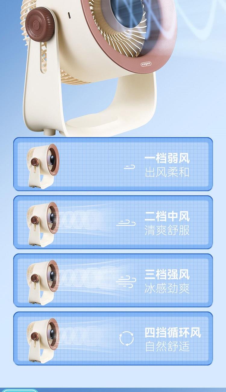 "叶光源种类:LED灯(12PCS SMD LED) 额定容量:3600mAh/3.7V 配 色:米色 产品参数: 额定功率:10W 额定电压:5V 额定电流:2A " ·四叶循环,风道聚风 ·强风远送,大空间循环也在线 ·360°仰角送风,清凉无死角 ·四档风力,一键可控 ·充插两用,长效续航 ·无刷电机,运作音更轻 四档风力一键可控循环风 ·小夜灯设计,起夜不摸黑 ·旋转扇罩,即可轻松拆洗