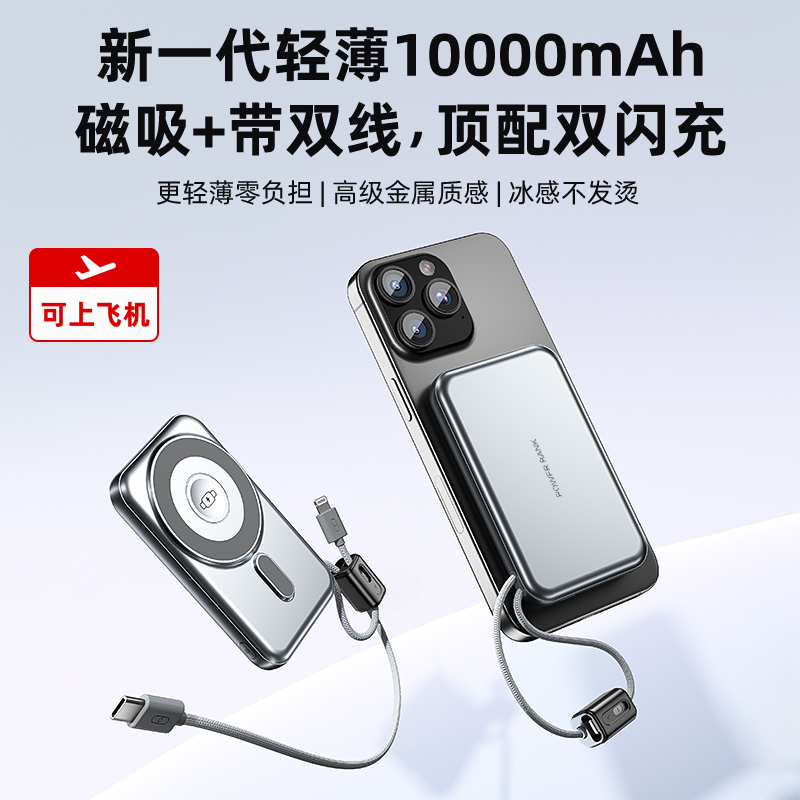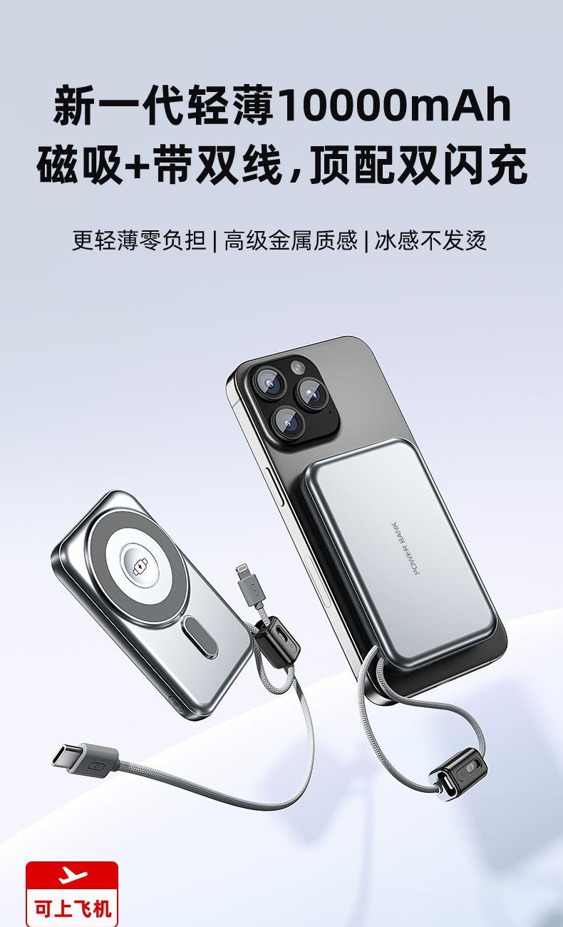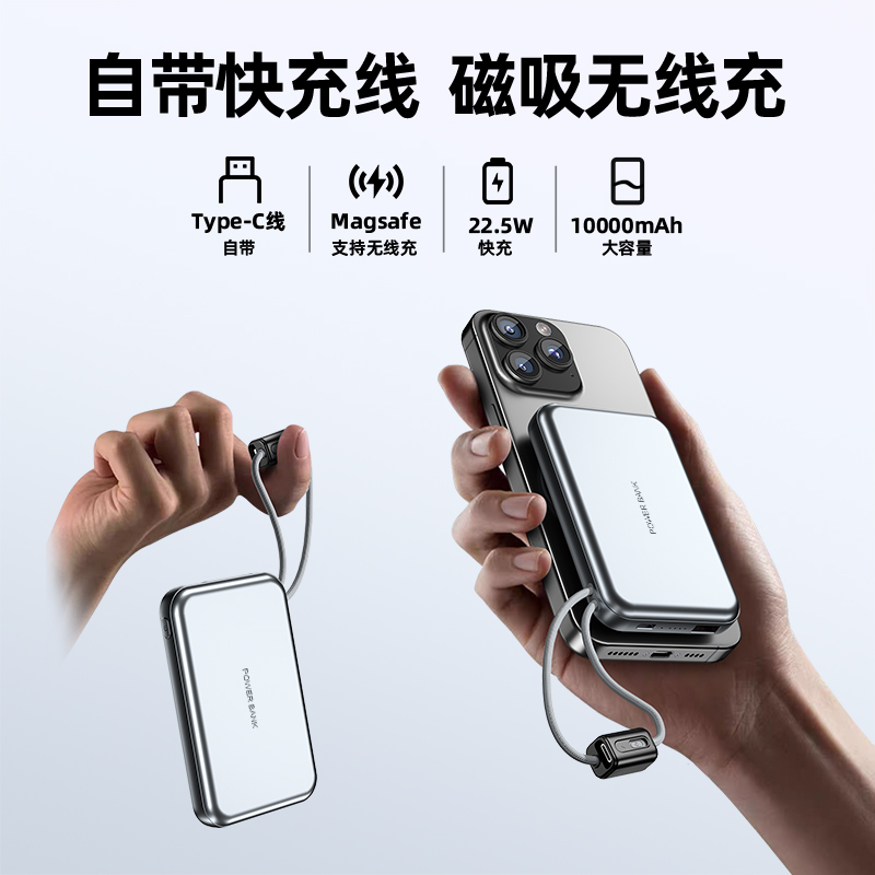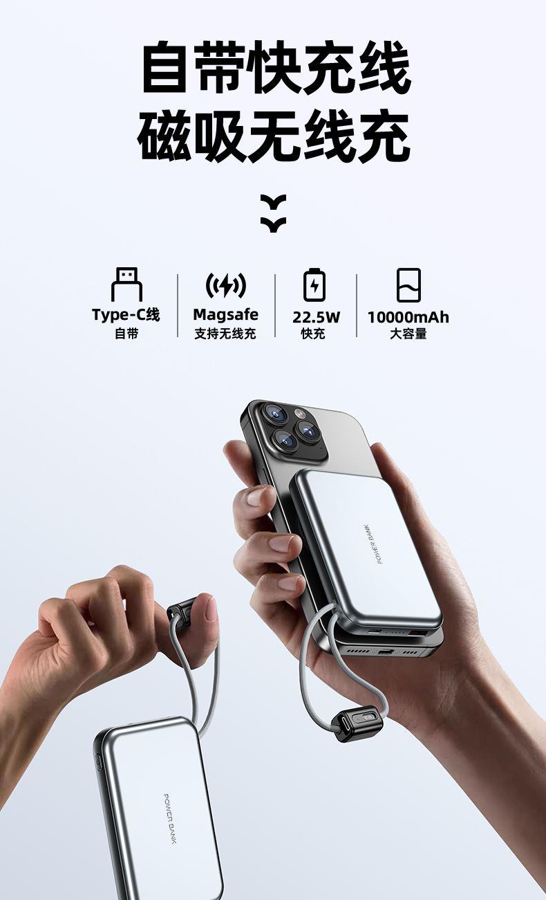 【推荐理由】: 10000毫安容量,3C安全认证 15W磁吸无线充,兼容苹果华为手表 22.5W超级快充,兼容PD20W 自带苹果/Type-C接口满足各种手机充电 挂绳设计,携带方便 符合民航局标准,可随身携带