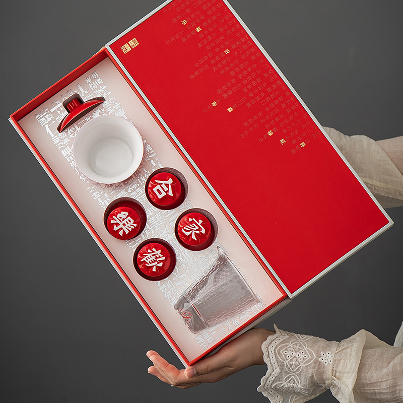 配置:汉字杯*4(合家欢乐) 御福盖碗*1 锤纹玻璃公道*1 (赠送红包袋) 材质:白玉瓷胎 颜色:中国红 尺寸:包装400*160*95mm 容量:壶150ml公道150ml杯50ml 1:汉字杯历经1300度以上高温烧制,不含铅和镉等重金属。 2:杯型源自竹节,一字一模,手工塑形。 3:传统中国红,结合汉字书法魏碑字体,相得益彰