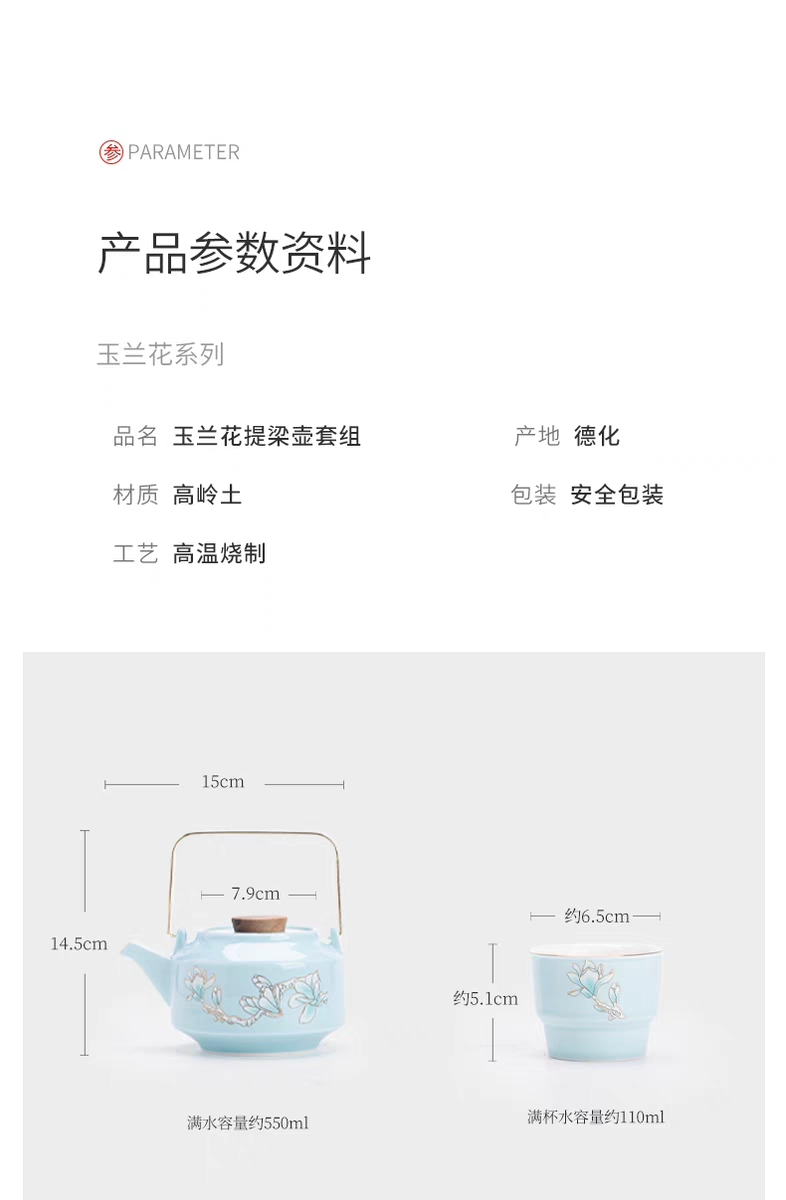 配置:提梁壶*1,茶杯*4,干泡盘*1, 礼盒*1. 尺寸:提梁壶15*14.5cm 容量550ml, 茶杯6.5*5.1cm 容量110ml, 干泡盘32*18.4*1.7cm, 礼盒34.2*13.1*19.5cm.