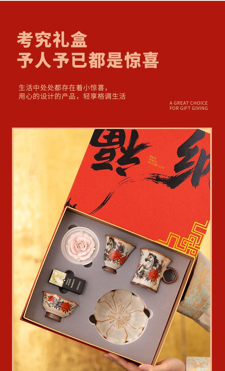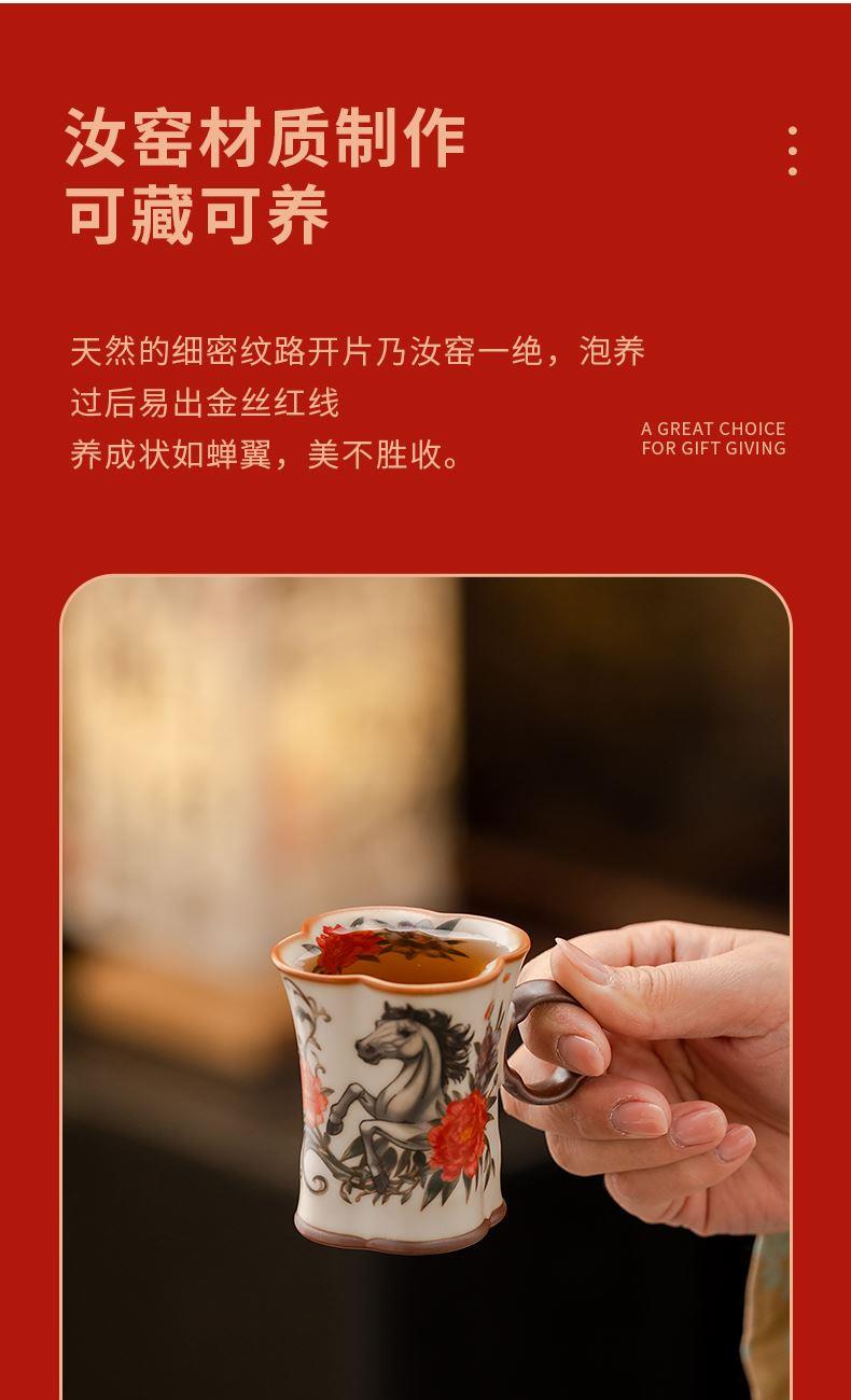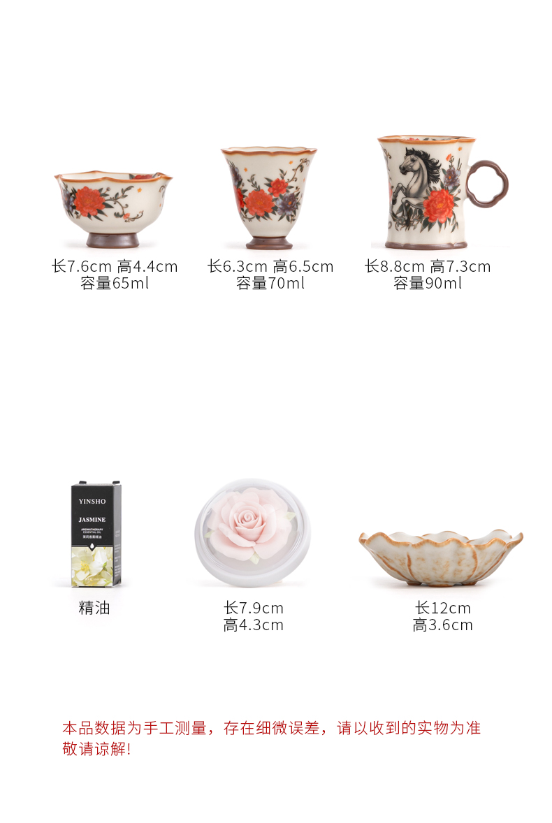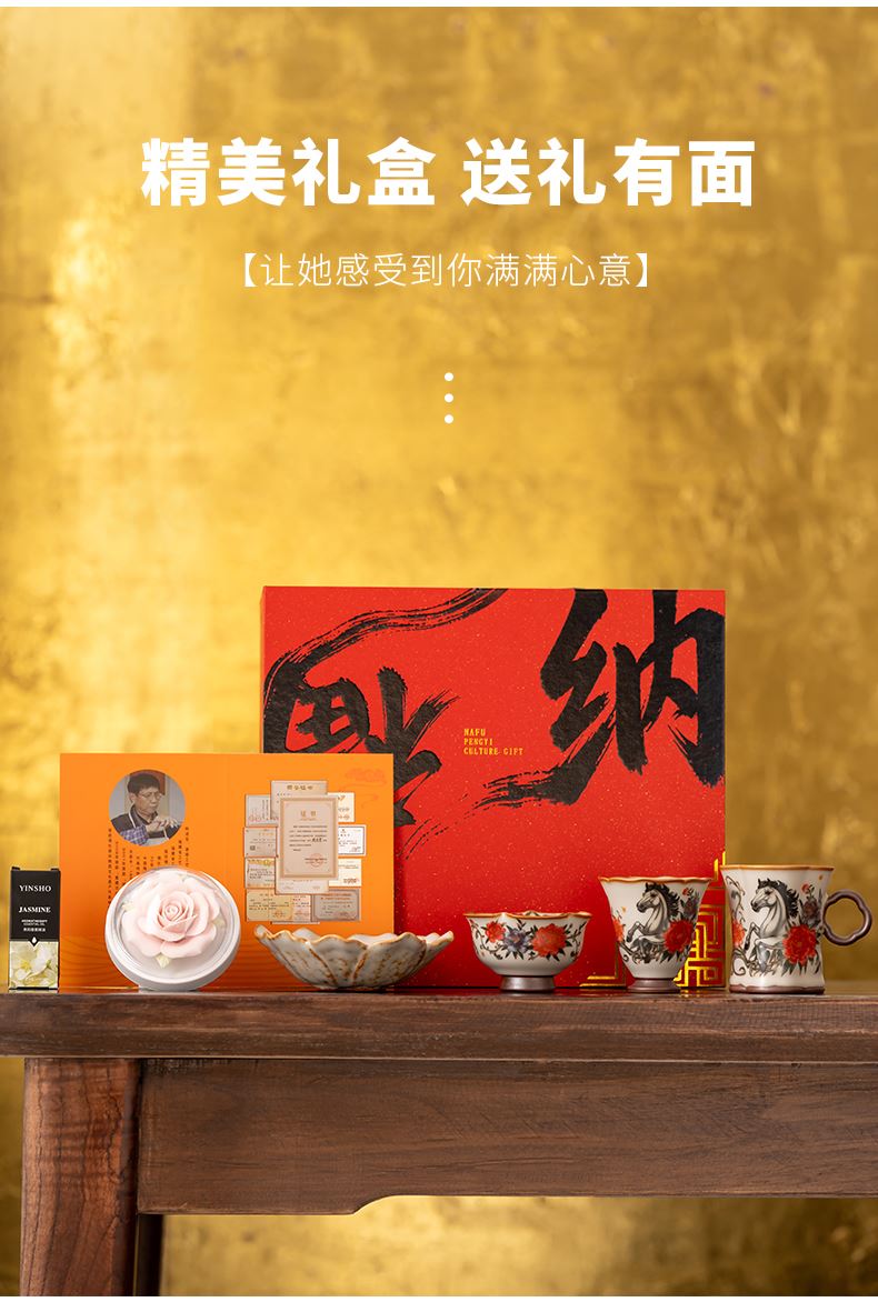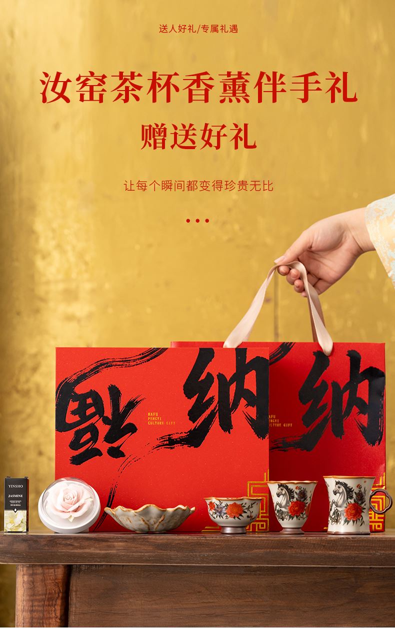 配 制:1手柄杯 1闻香杯 1碗 1香盘 1玫瑰瓷雕扩香器 1精油 1收藏证书 1礼盒 手提袋 材质:汝黄瓷 规格:手柄杯 6*9cm 闻香杯6.5*6.3cm 碗7.6*4.4cm 香盘12*3.6cm 玫瑰扩香器7.9*4.3cm 容量:手柄杯70ml 推荐说明:马年开门红礼品,马上有钱香薰套装,非遗文化手工瓷雕玫瑰,扩香器,配精油一瓶。亚黄汝瓷,玛瑙入釉,蝉翼开片,内外皆有花面,家有千财万贯,不如汝窑一片。技术新品。画面堆料技术,富有立体浮雕质感,真实感强。杯身开片,可养瓷。