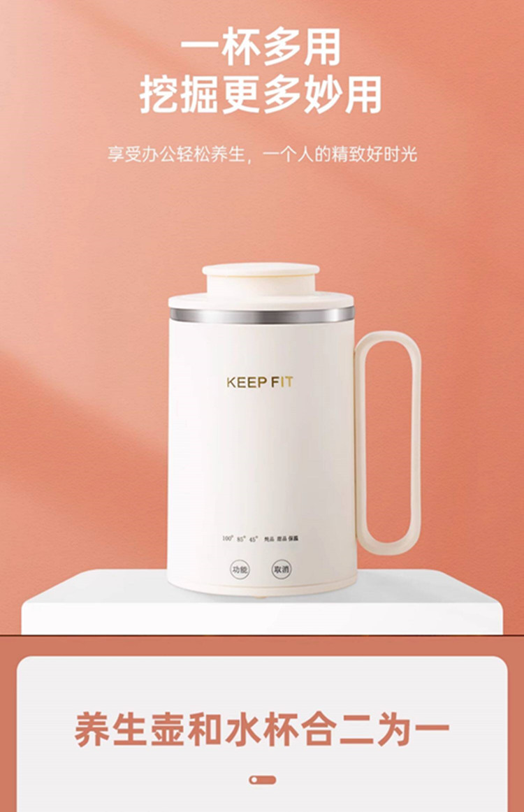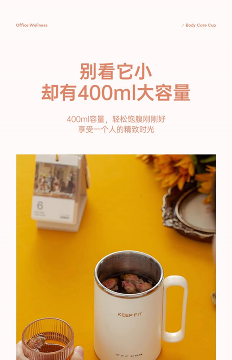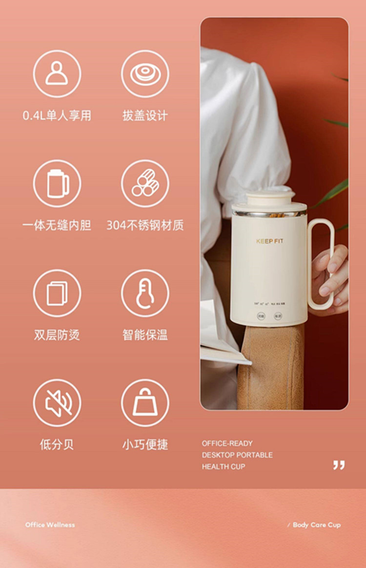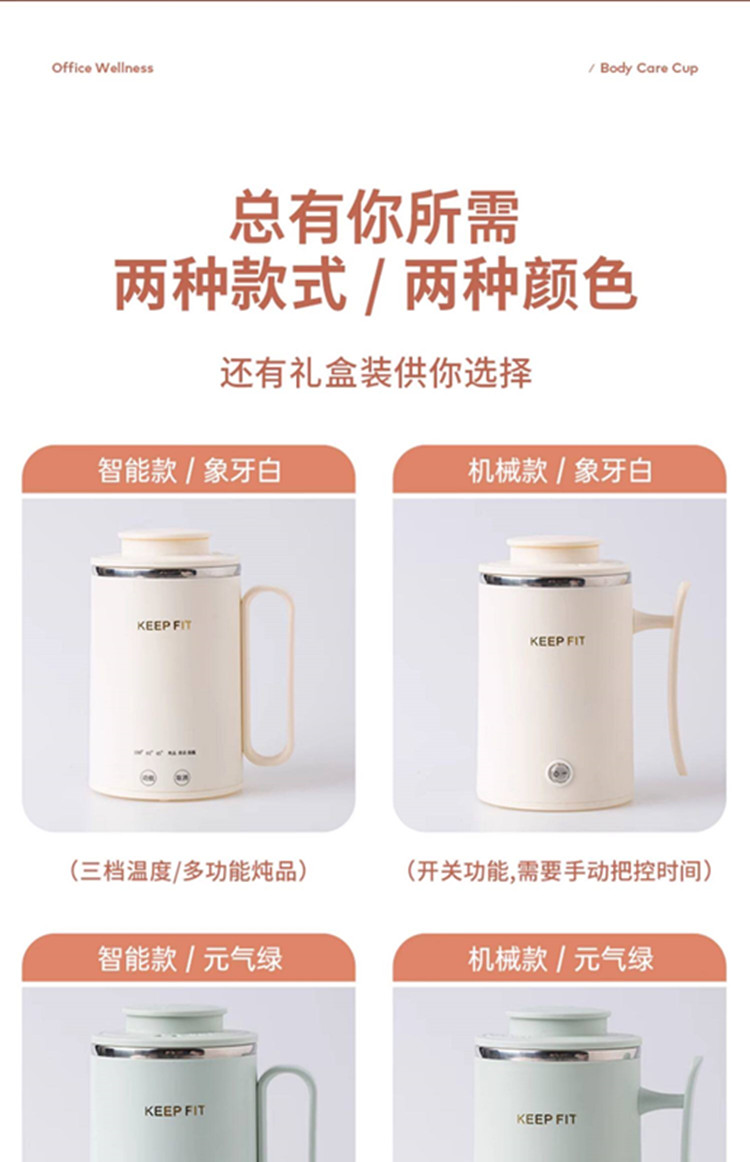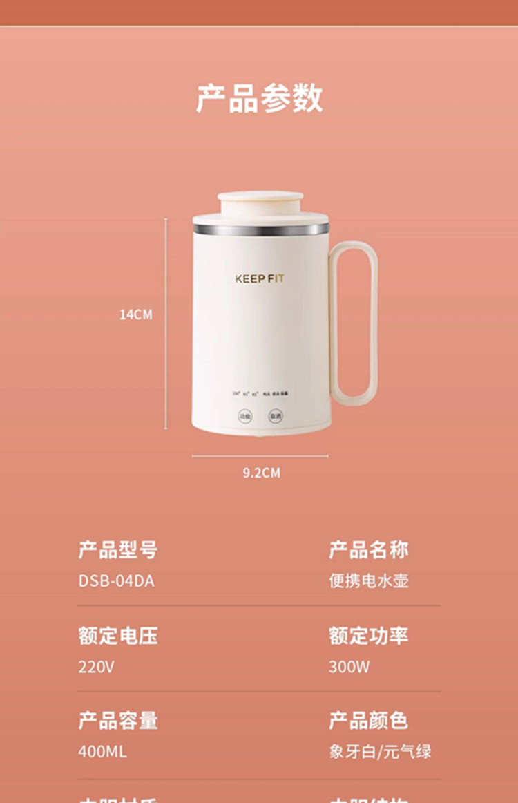 额定功率:300W 额定电压:220V 产品颜色:元气绿/樱花粉/象牙白 产品容量:400ML 产品款式:智能款 礼盒包装 包装清单:主机、滤网、电源线、说明书、礼盒、玻璃盖 包装尺寸:13*13*17.5(cm) 特色功能 1、食品级食品可接触304不锈钢内胆 耐腐蚀材质 2、携带方便,出行好伴侣,轻巧实用颜值高 3、机械款方便操作,即插即用人体工程学 4、温度随意调节,45-85-100°;舒适提手,细密滤网,透气盖口 5、电热杯/水杯二合一,三挡水温