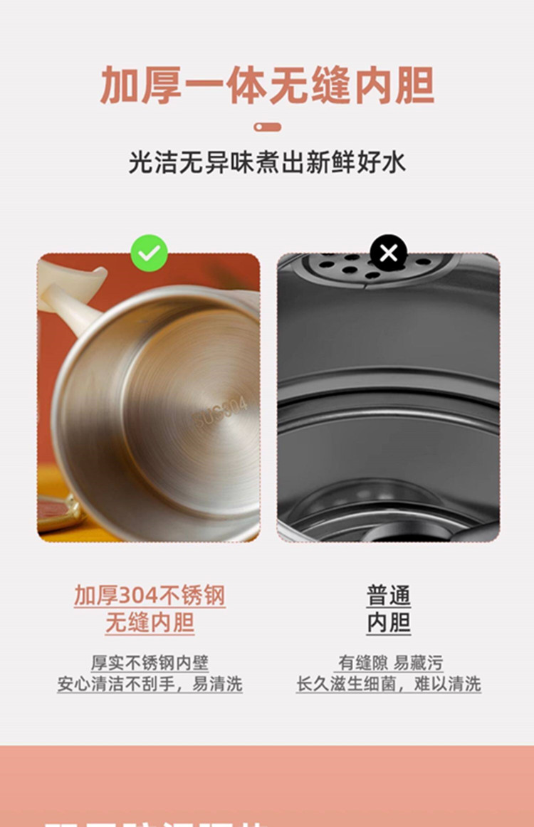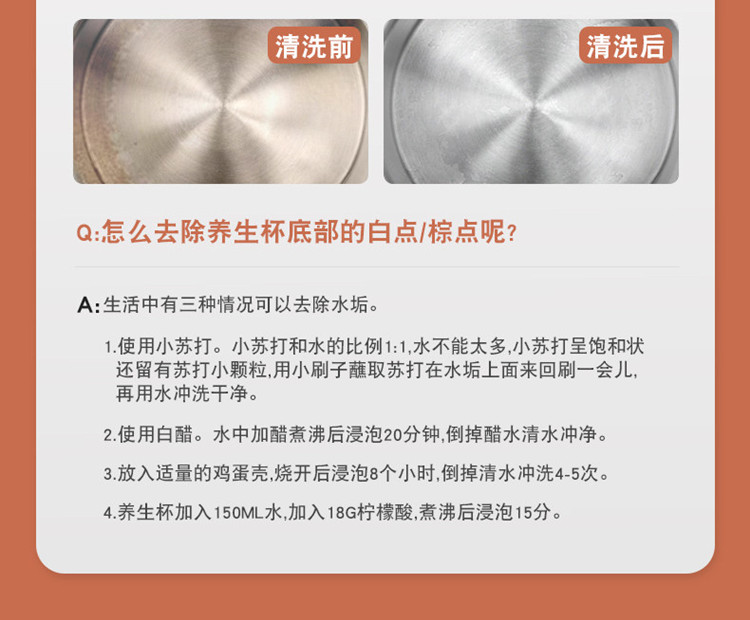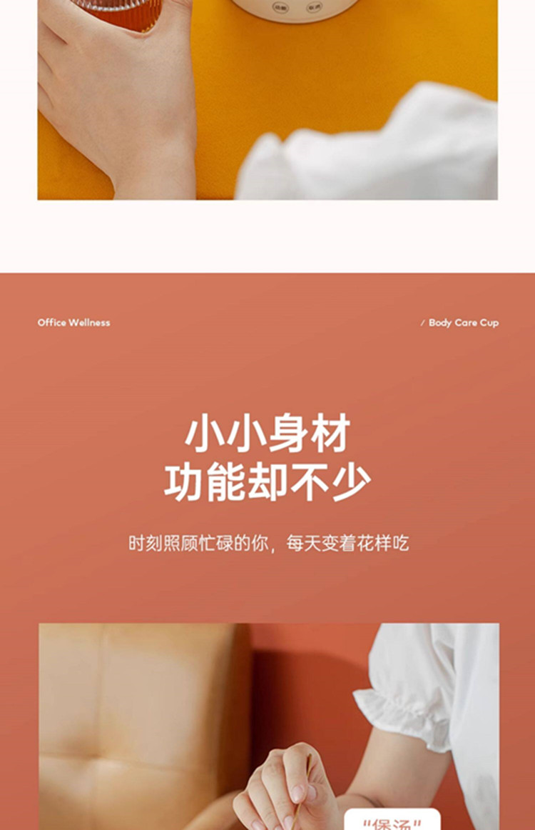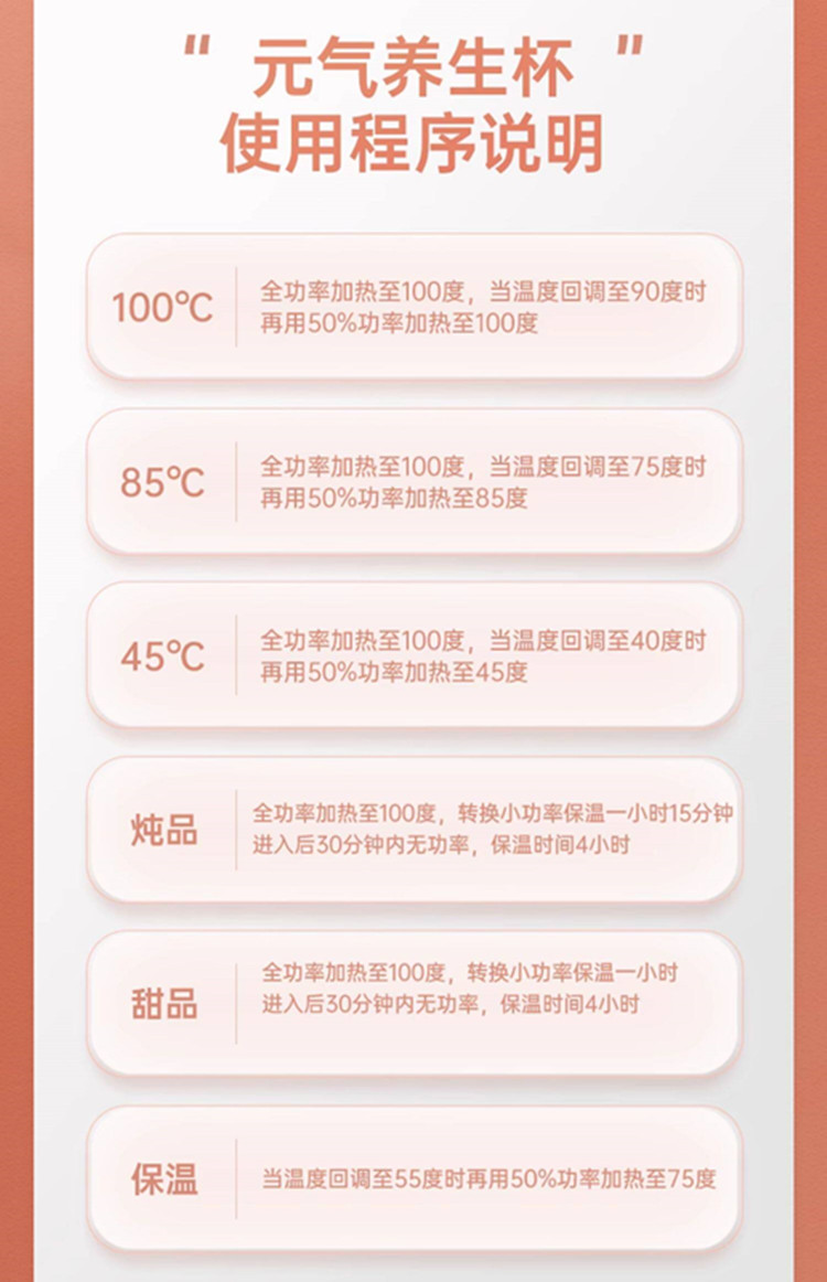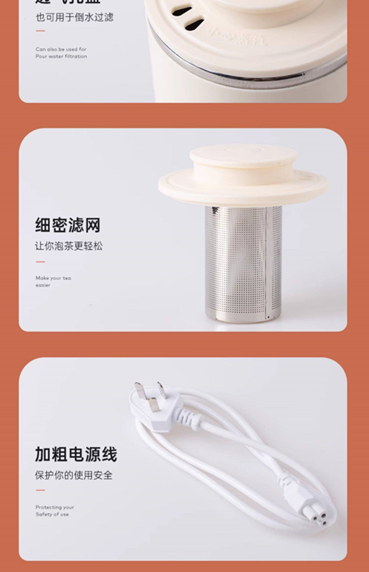 额定功率:300W 额定电压:220V 产品颜色:元气绿/樱花粉/象牙白 产品容量:400ML 产品款式:智能款 礼盒包装 包装清单:主机、滤网、电源线、说明书、礼盒、玻璃盖 包装尺寸:13*13*17.5(cm) 特色功能 1、食品级食品可接触304不锈钢内胆 耐腐蚀材质 2、携带方便,出行好伴侣,轻巧实用颜值高 3、机械款方便操作,即插即用人体工程学 4、温度随意调节,45-85-100°;舒适提手,细密滤网,透气盖口 5、电热杯/水杯二合一,三挡水温